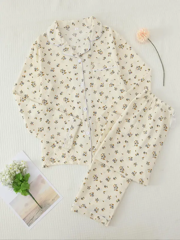Crafted for effortless comfort and relaxed style, this two-piece sleepwear set is perfect for year-round lounging. The long sleeve lapel blouse with a classic button front design pairs beautifully with coordinating contrast binding trousers, complete with a delicate bow front detail for a soft, feminine finish.