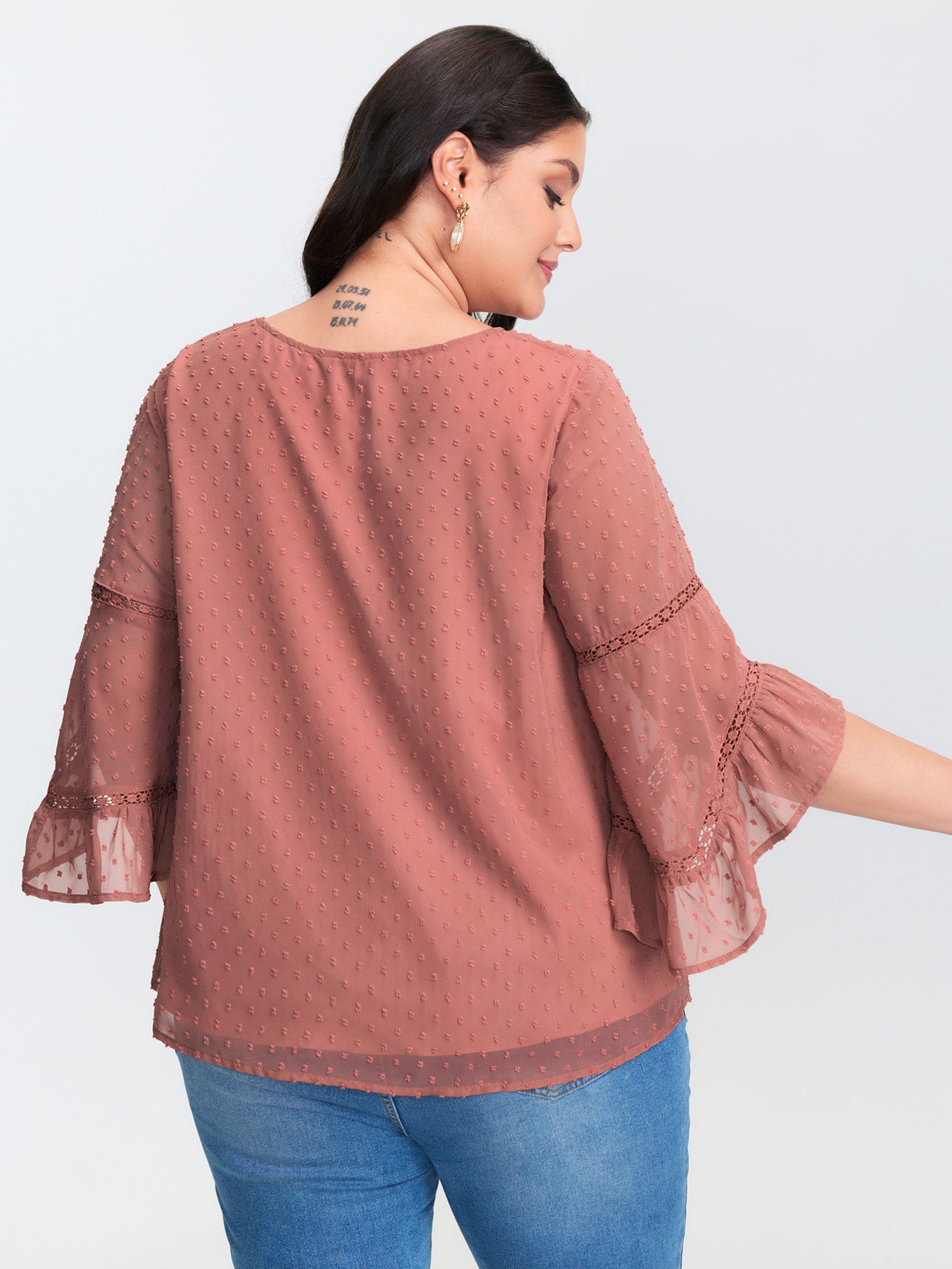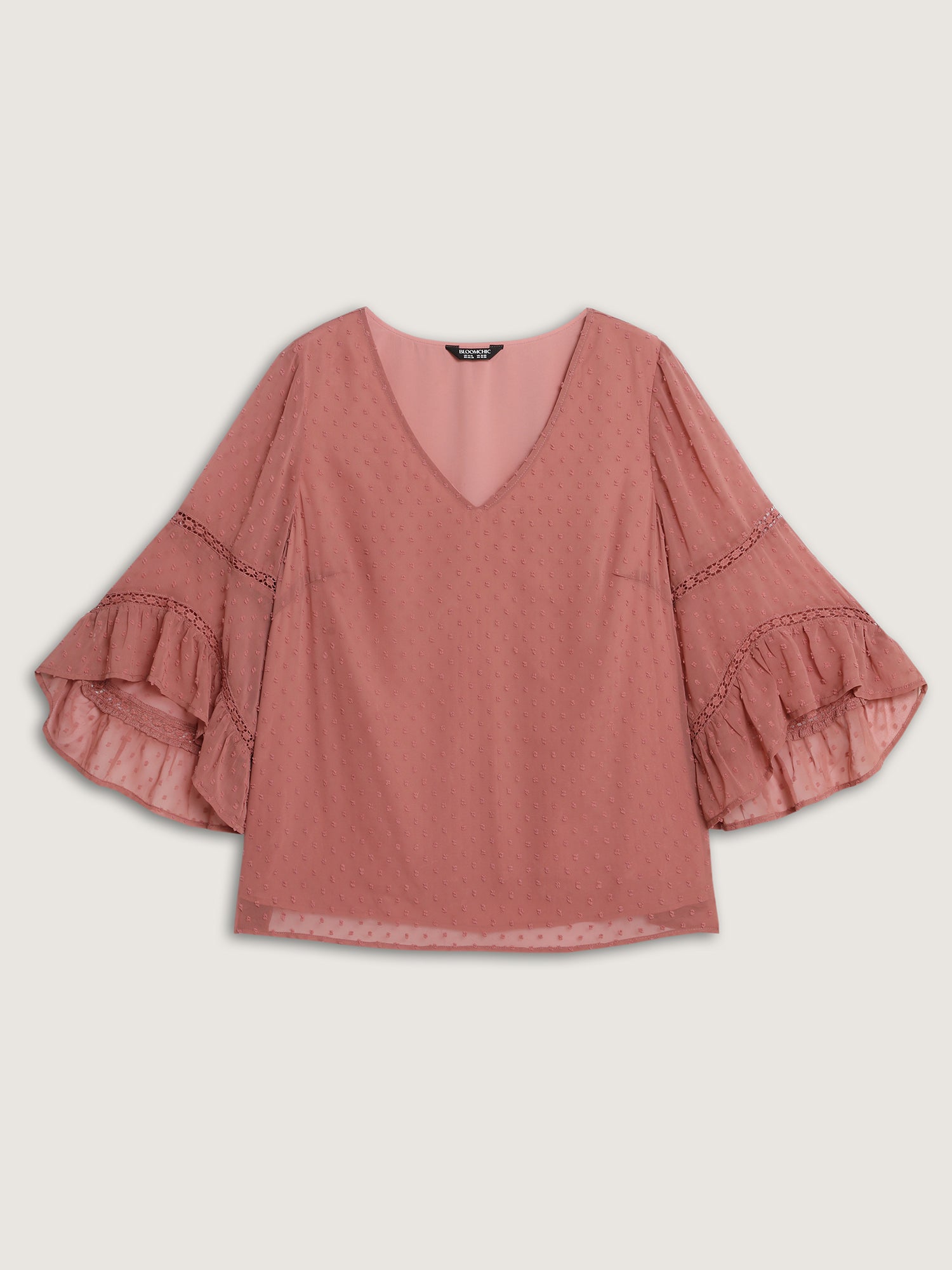 Shop Asymmetrical Ruffled Sleeve Lace Blouse now and redefine your style with confidence at BloomChic. Tailored for mid and plus-size women. This trendy Tops Women, sizes 10-30. Color:Dirty Pink;Style:Romantic;Prints:Synthetic texture;Neckline:Flat collar with V-notch;Sleeve Type:Bell Sleeve;Details:Texture, See through, Tiered;Pocket:No-pocket
