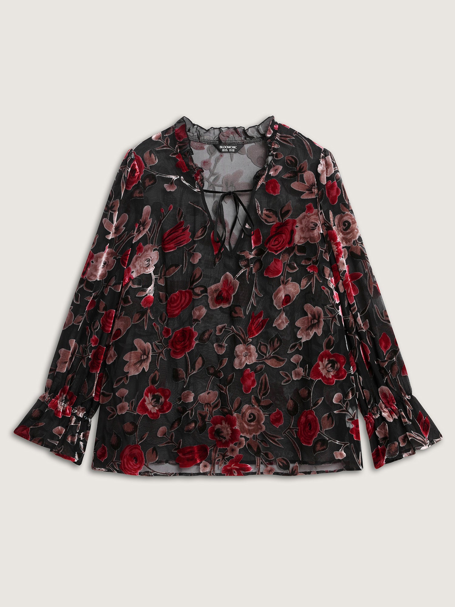 Shop Flock Floral Ruffled Cuff Blouse now and redefine your style with confidence at BloomChic. Tailored for mid and plus-size women. This trendy Tops Women, sizes 10-30. Color:Black;Style:Romantic;Prints:Floral;Neckline:Deep V-neck;Sleeve Type:Lantern Sleeve;Details:Tie knot, Ruffles, See through, Texture;Pocket:No-pocket