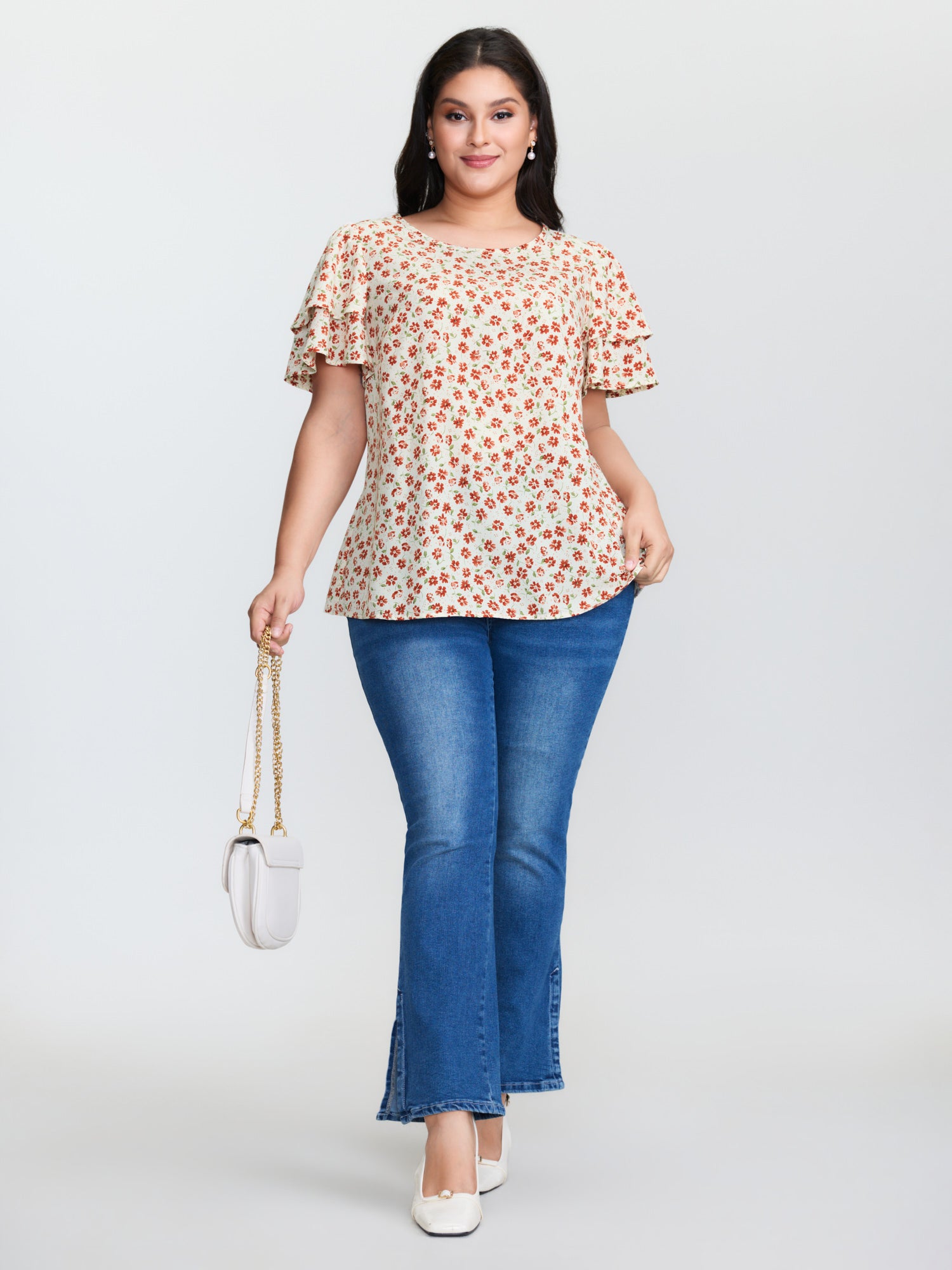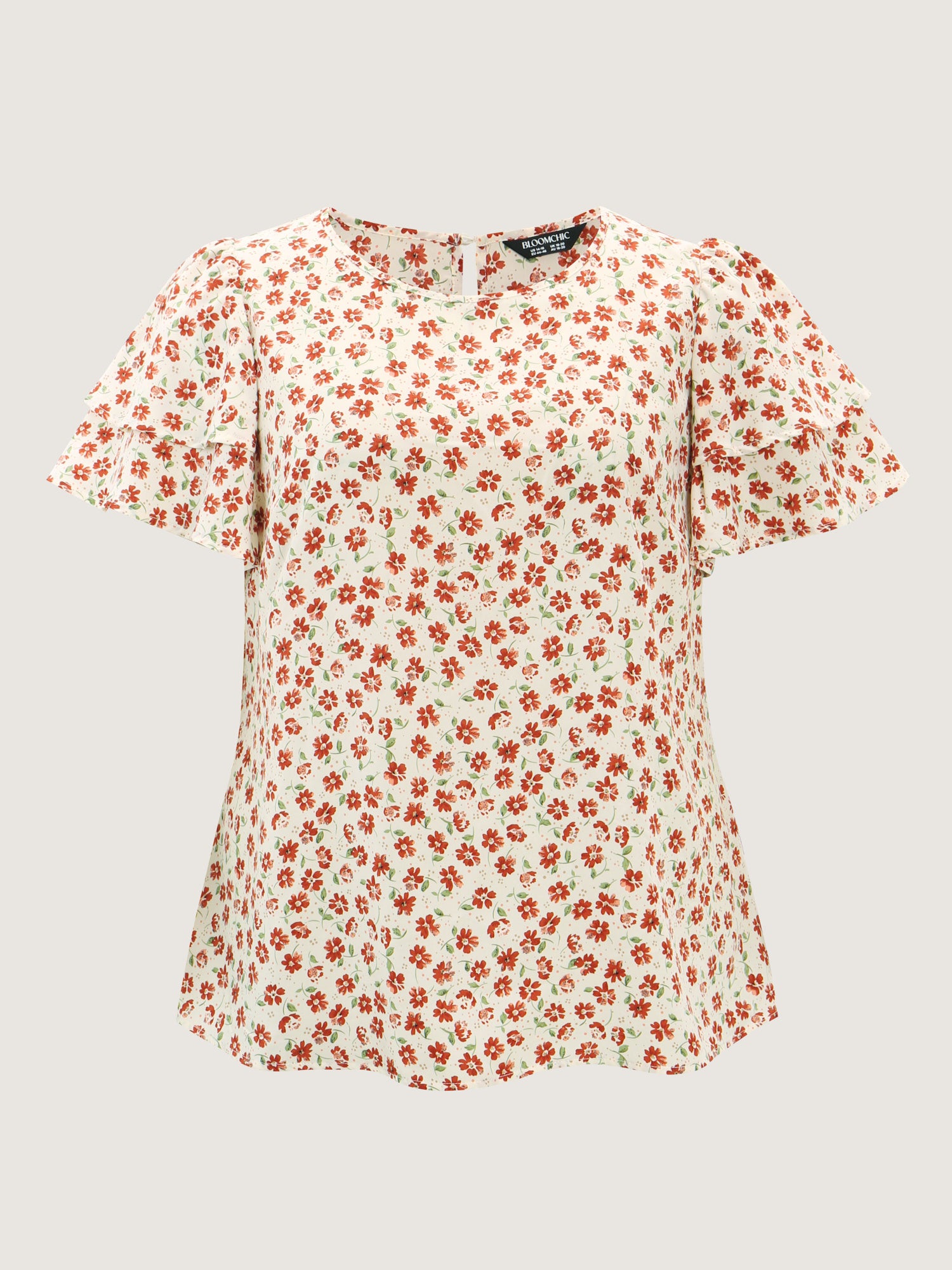 Shop Floral Print Layered Sleeve Round Neck Blouse now and redefine your style with confidence at BloomChic. Tailored for mid and plus-size women. This trendy Tops Women, sizes 10-30. Color:Russet;Style:Timeless;Prints:Ditsy floral;Neckline:Round Neck;Sleeve Type:Ruffle Sleeve;Details:Contrast, Tiered;Pocket:No-pocket