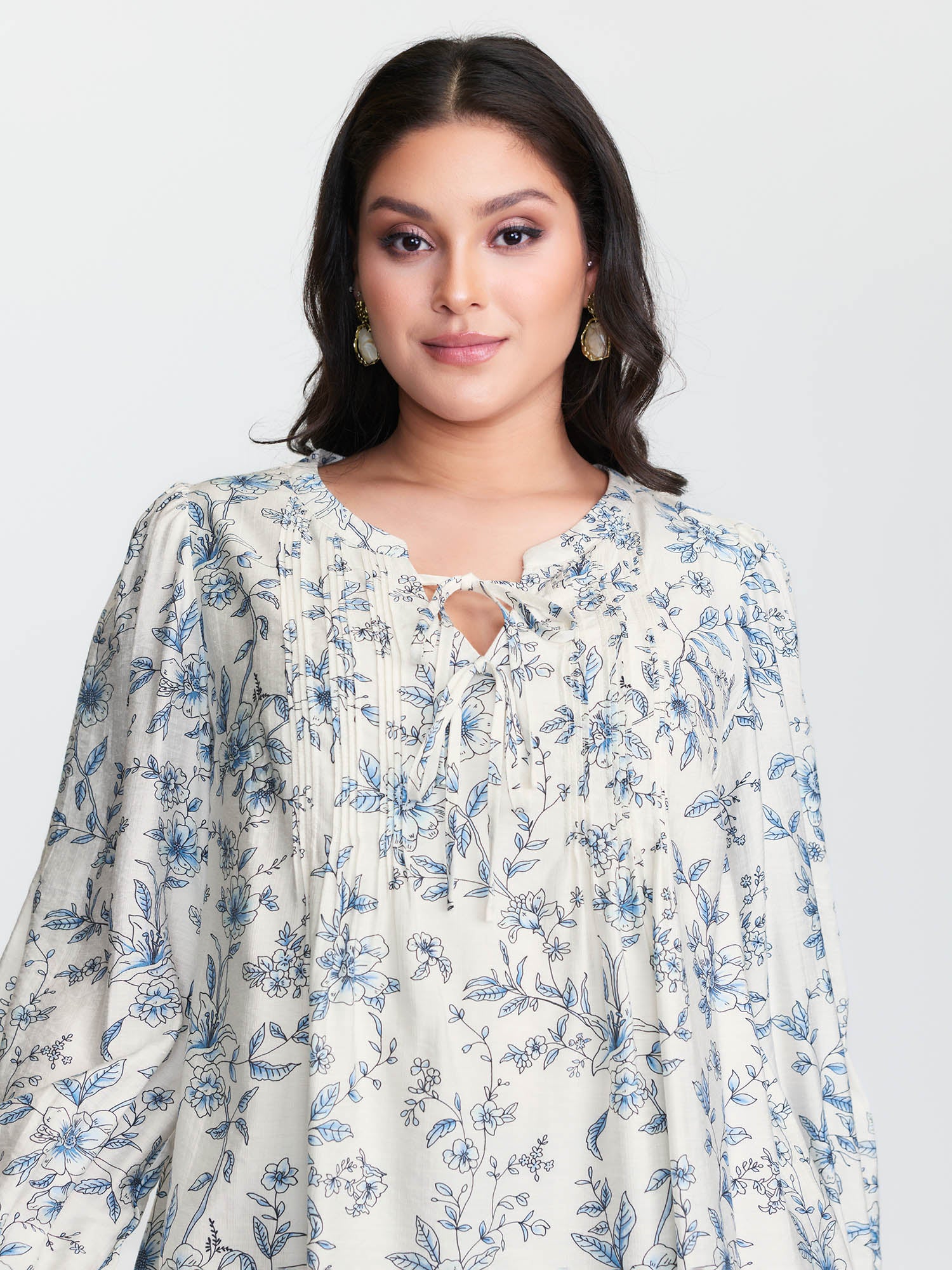 Shop Floral Print Neckline Tie Blouse now and redefine your style with confidence at BloomChic. Tailored for mid and plus-size women. This trendy Tops Women, sizes 10-30. Color:Light Blue;Style:Timeless;Prints:Ditsy floral;Neckline:Flat collar with V-notch;Sleeve Type:Lantern Sleeve;Details:Contrast, Gathered, Tucked seam, Drawstring, Knotted;Pocket:No-pocket