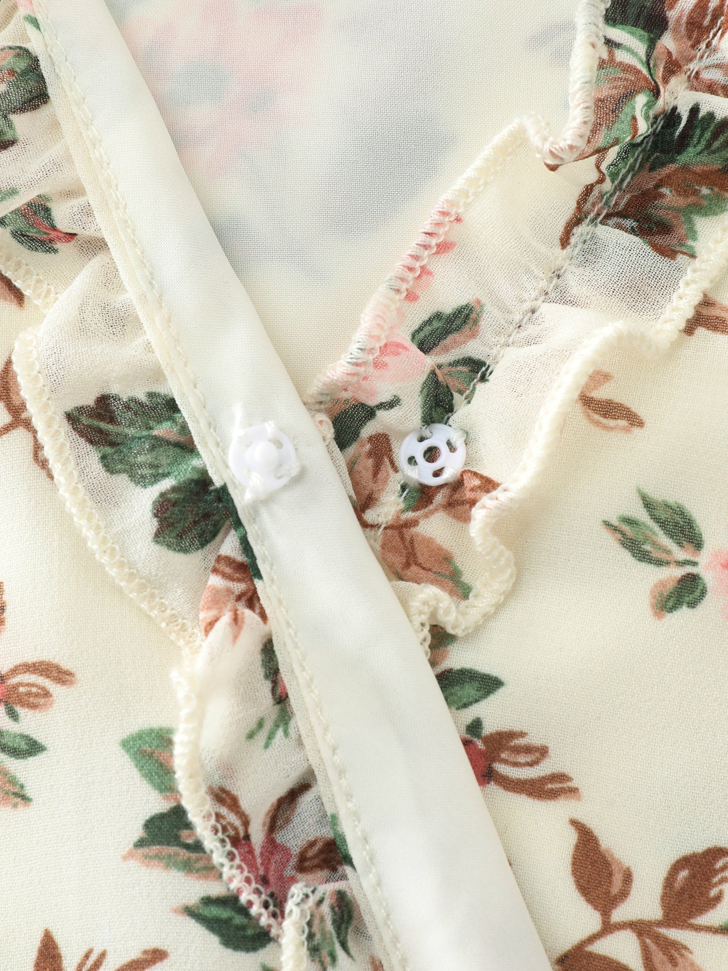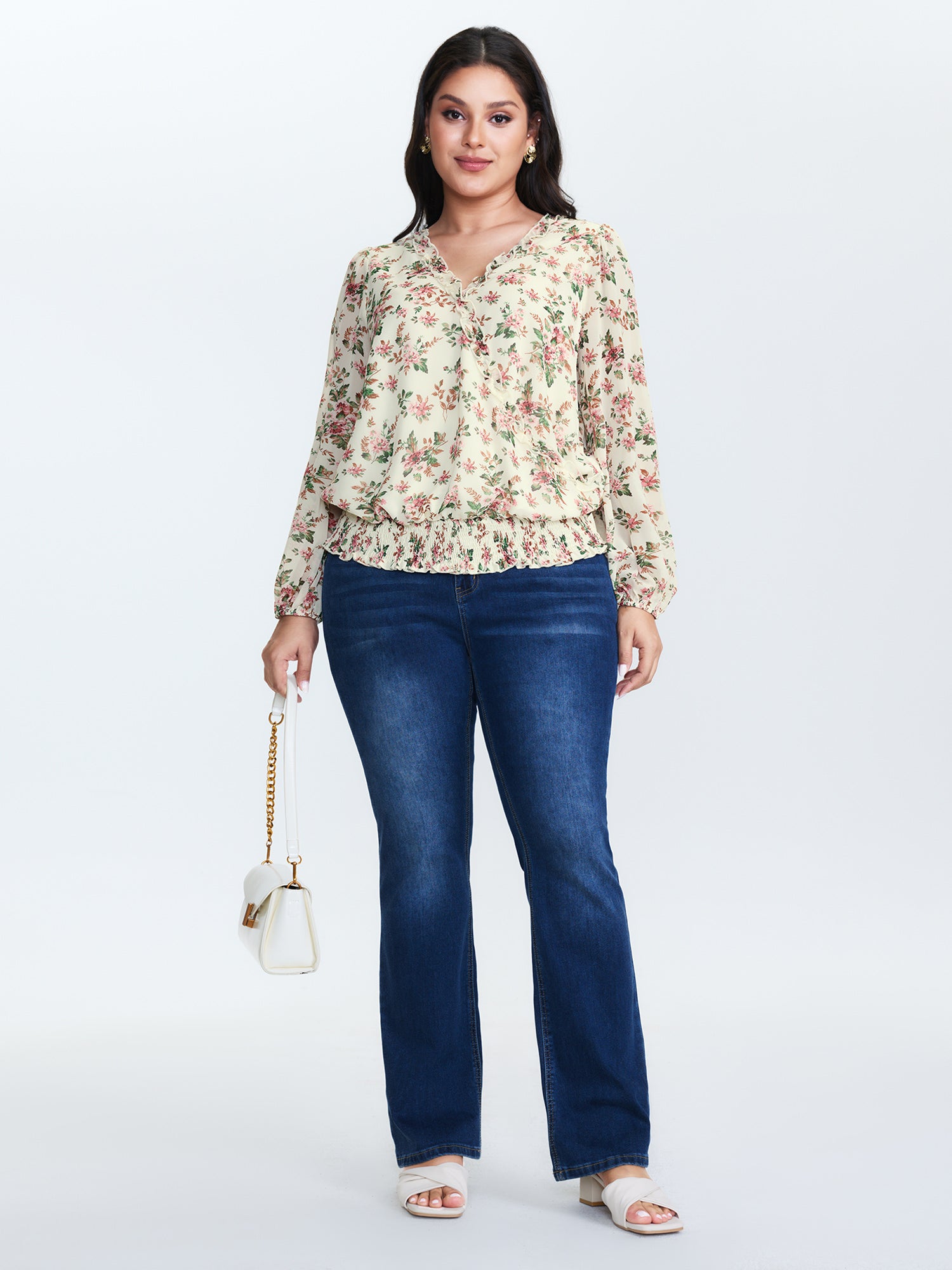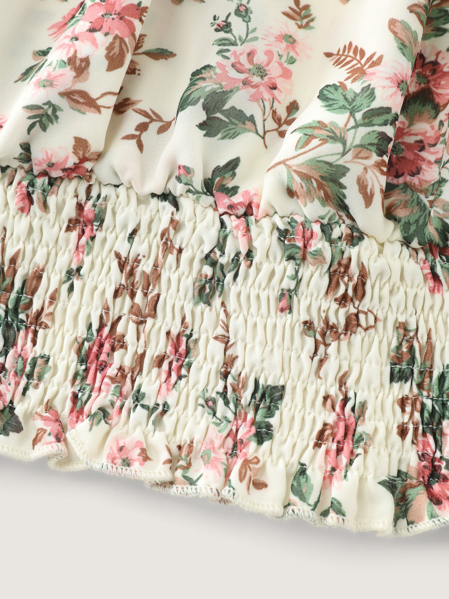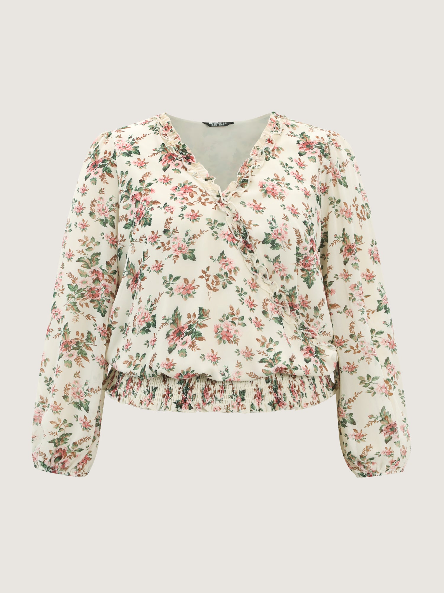 Shop Floral Print Shirred Hem Blouse now and redefine your style with confidence at BloomChic. Tailored for mid and plus-size women. This trendy Tops Women, sizes 10-30. Color:lvory;Style:Romantic;Prints:Ditsy floral;Neckline:Overlap Collar;Sleeve Type:Elastic cuff;Details:Contrast, Shirred, Frill Trim, Overlapping;Pocket:No-pocket