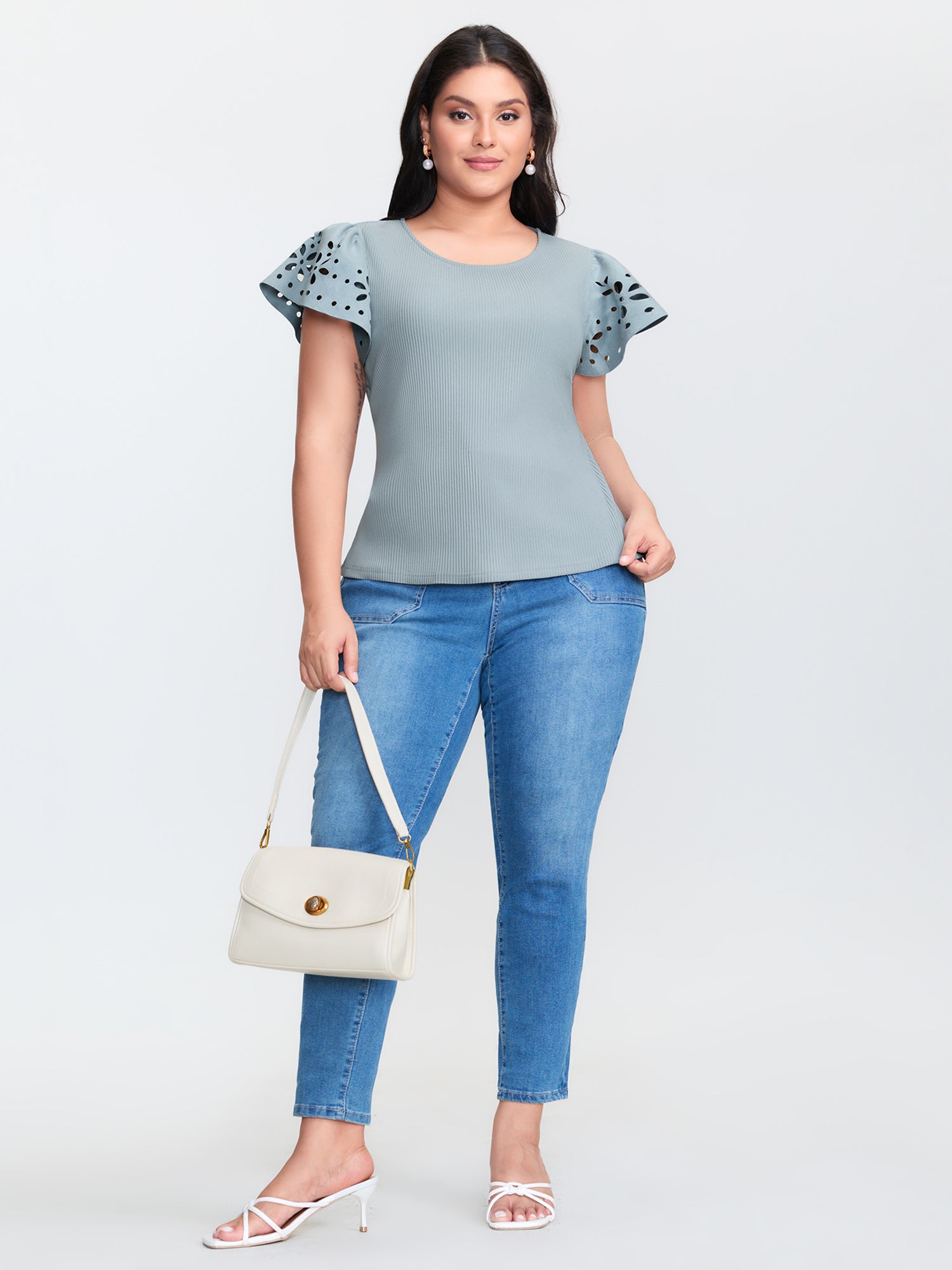 Shop Flutter Sleeve Round Neck Knit Top now and redefine your style with confidence at BloomChic. Tailored for mid and plus-size women. This trendy Tops Women, sizes 10-30. Color:Stone;Style:Timeless;Prints:Synthetic texture;Neckline:Round Neck;Sleeve Type:Cap sleeve;Details:Texture, Cut-Out;Pocket:No-pocket
