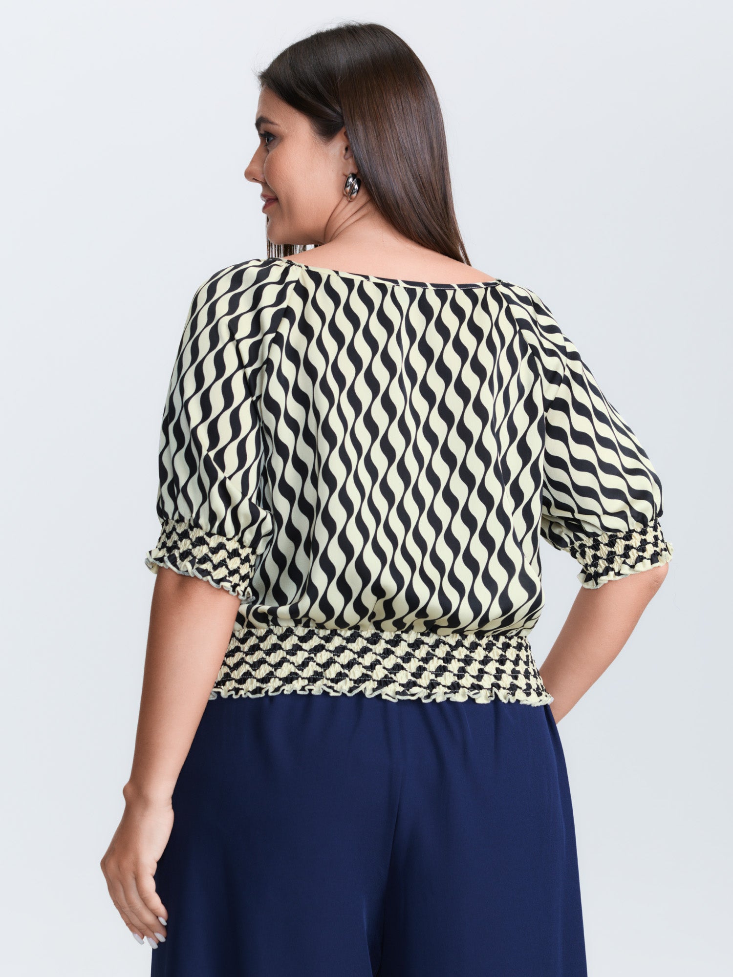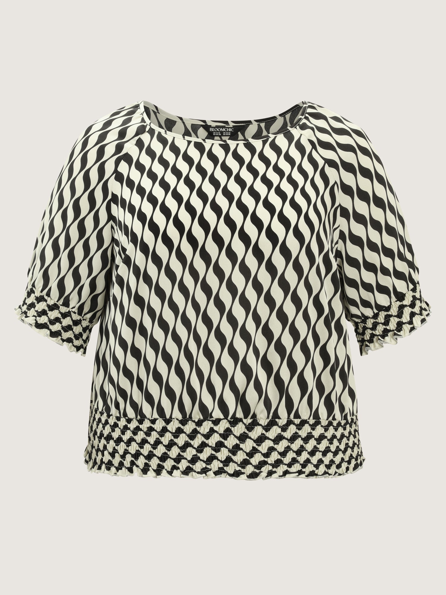 Shop Geometric Stripes Stretchy Hem Blouse now and redefine your style with confidence at BloomChic. Tailored for mid and plus-size women. This trendy Tops Women, sizes 10-30. Color:Black Flower;Style:Office;Prints:Geometric & color block;Neckline:Boat Neck;Sleeve Type:Lantern Sleeve;Details:Shirred;Pocket:No-pocket