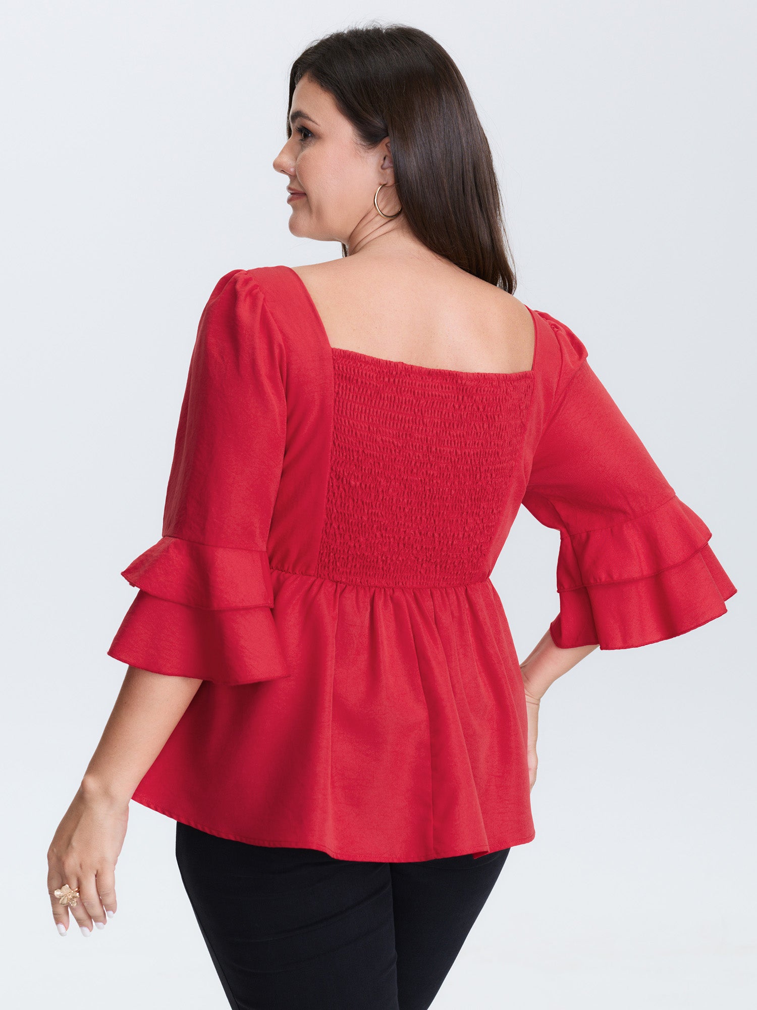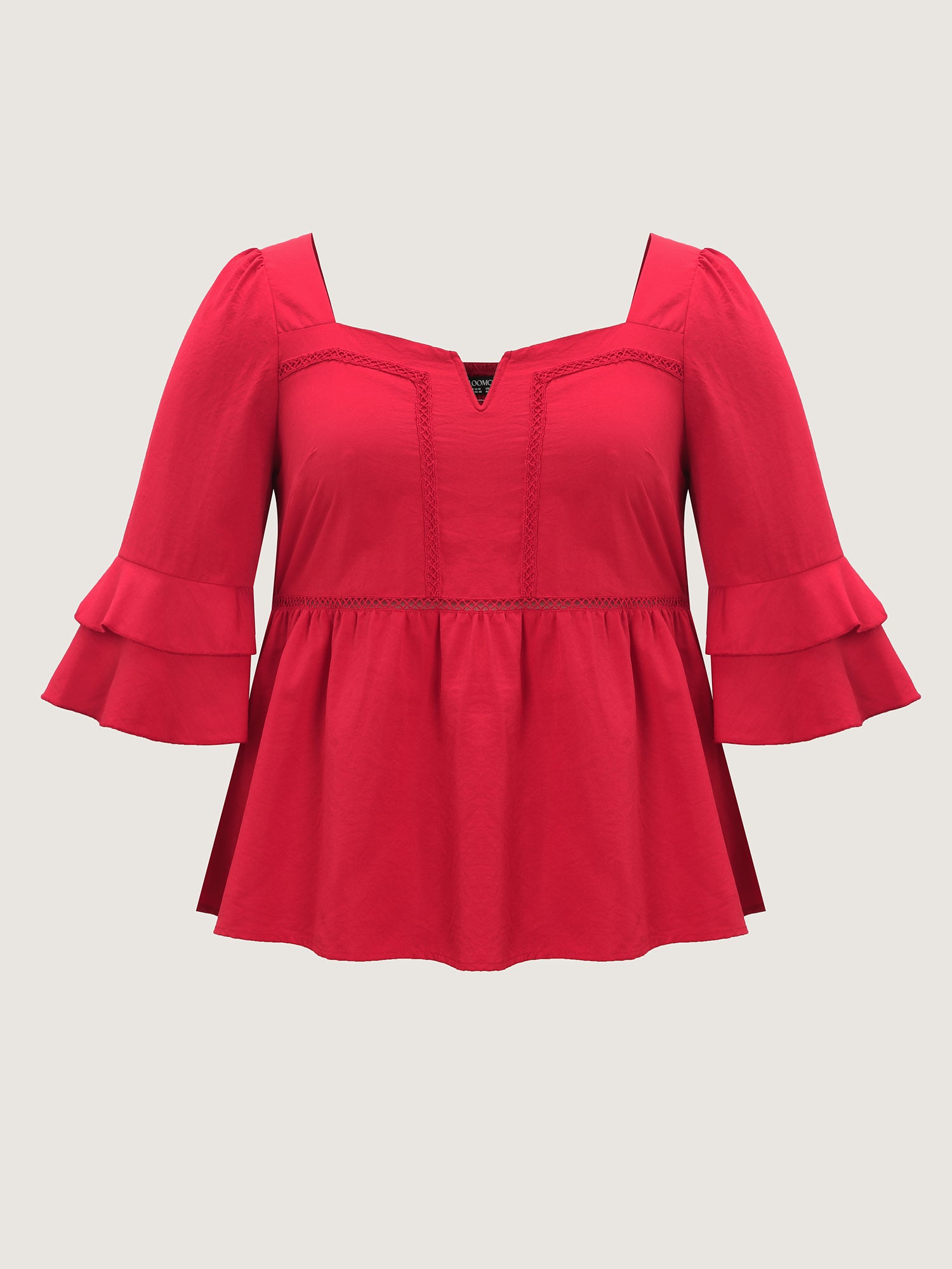 Shop Lace Trim Shirred Back Flared Blouse now and redefine your style with confidence at BloomChic. Tailored for mid and plus-size women. This trendy Tops Women, sizes 10-30. Color:Crimson;Style:Timeless;Prints:Synthetic texture;Neckline:Notched collar;Sleeve Type:Bell Sleeve;Details:Texture, Patchwork, Shirred;Pocket:No-pocket