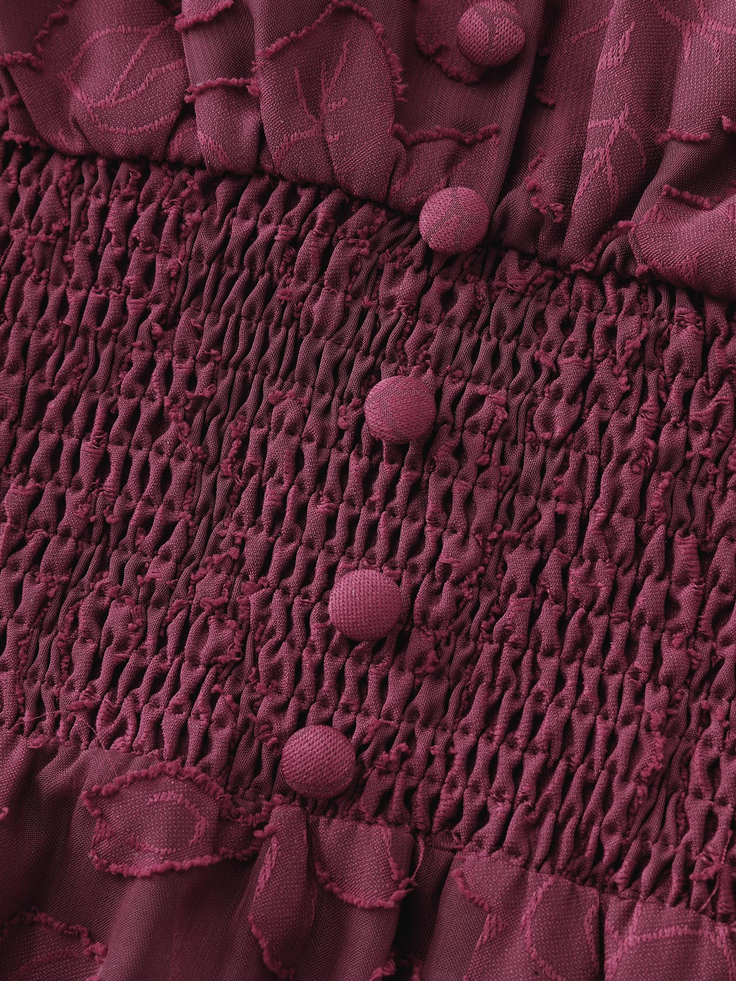 Shop Laser Cut Shirred Waist Button Blouse now and redefine your style with confidence at BloomChic. Tailored for mid and plus-size women. This trendy Tops Women, sizes 10-30. Color:Burgundy;Style:Timeless;Prints:Synthetic texture;Neckline:V-neck;Sleeve Type:Puff Sleeve;Pocket:No-pocket