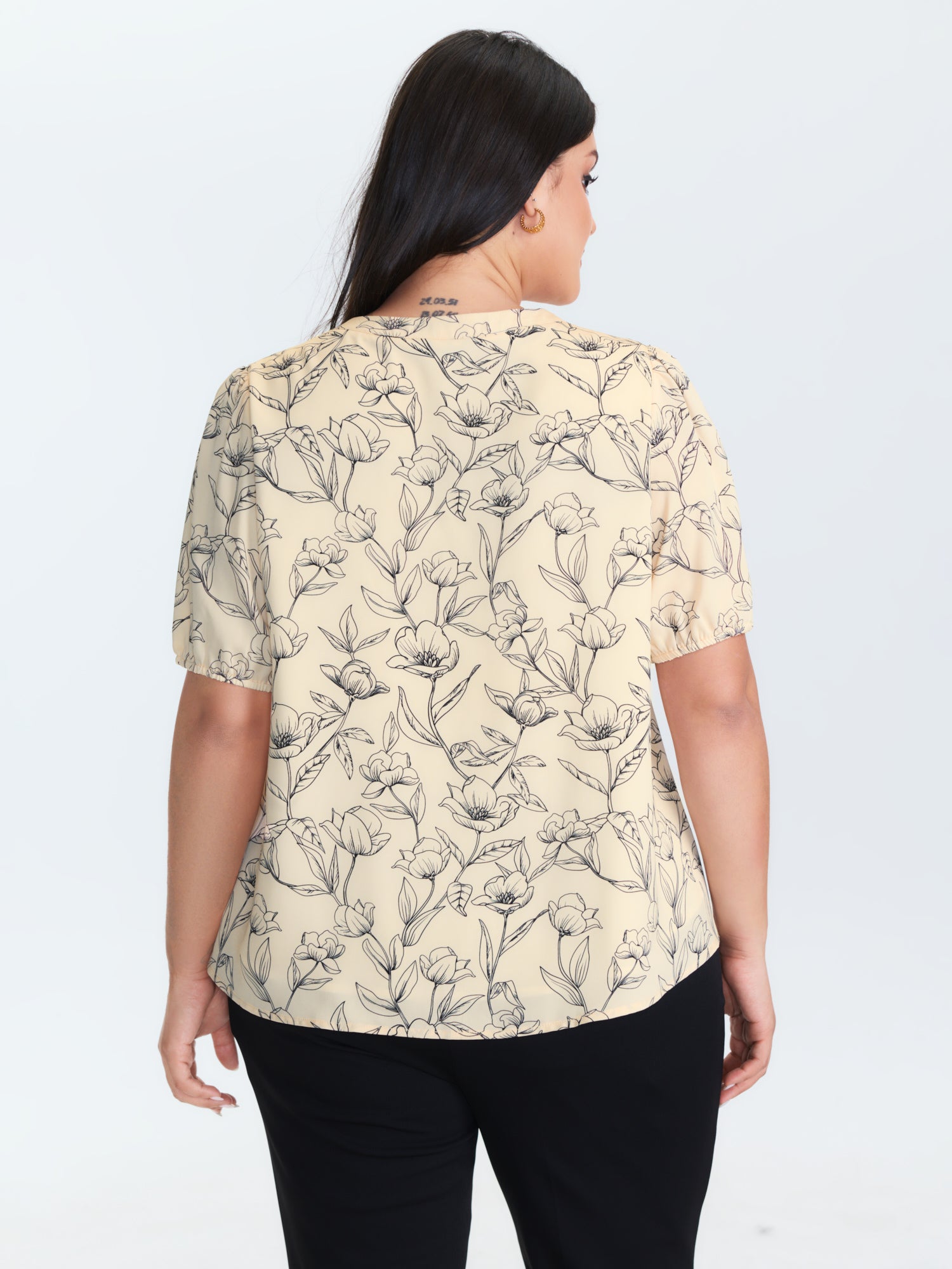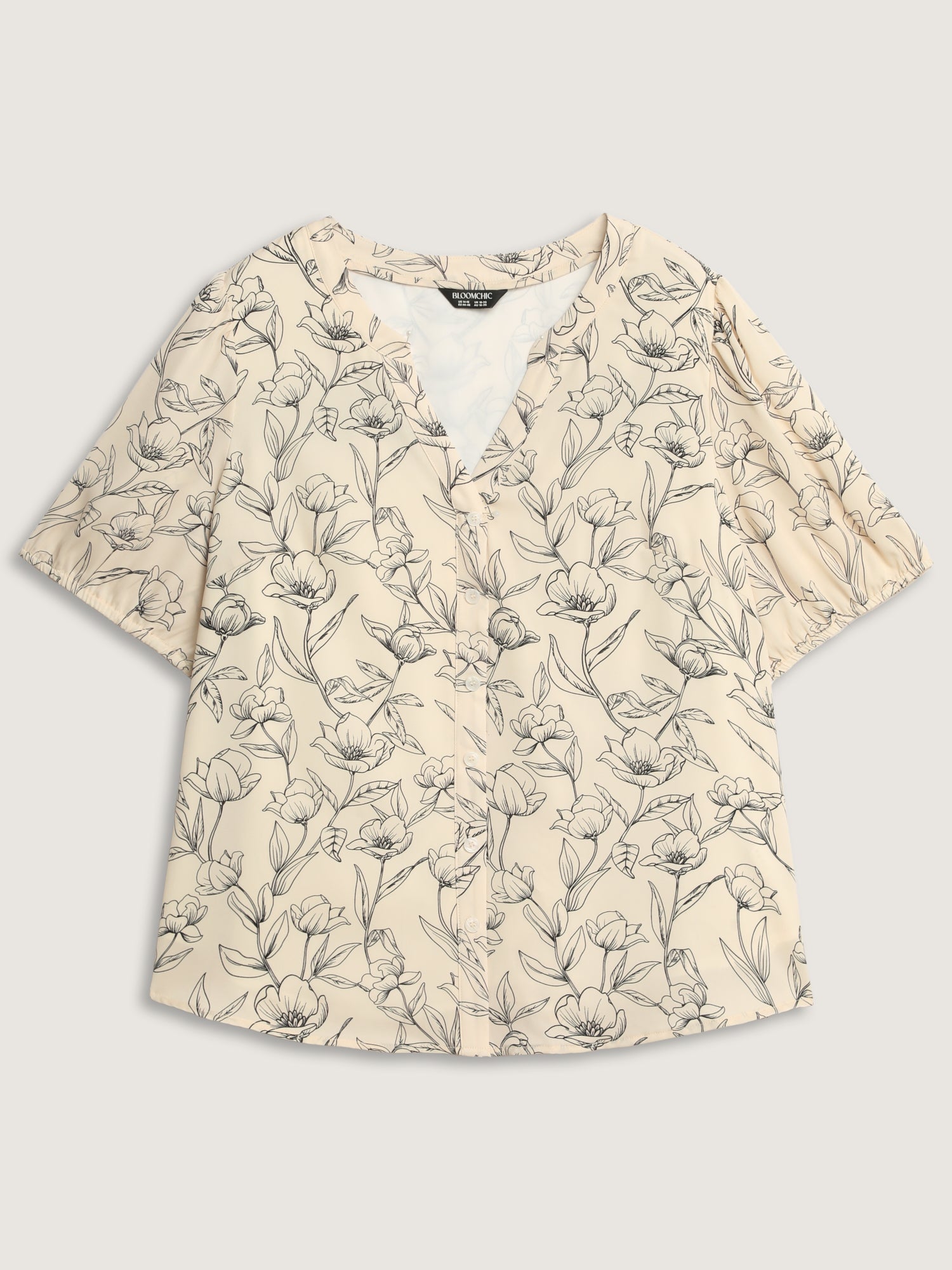 Shop Monochrome Floral Print Button-Down Blouse now and redefine your style with confidence at BloomChic. Tailored for mid and plus-size women. This trendy Tops Women, sizes 10-30. Color:lvory;Style_2:Office;Prints:Floral;Neckline:Flat collar with V-notch;Sleeve Type:Lantern Sleeve;Details:Button, Gathered;Pocket:No-pocket
