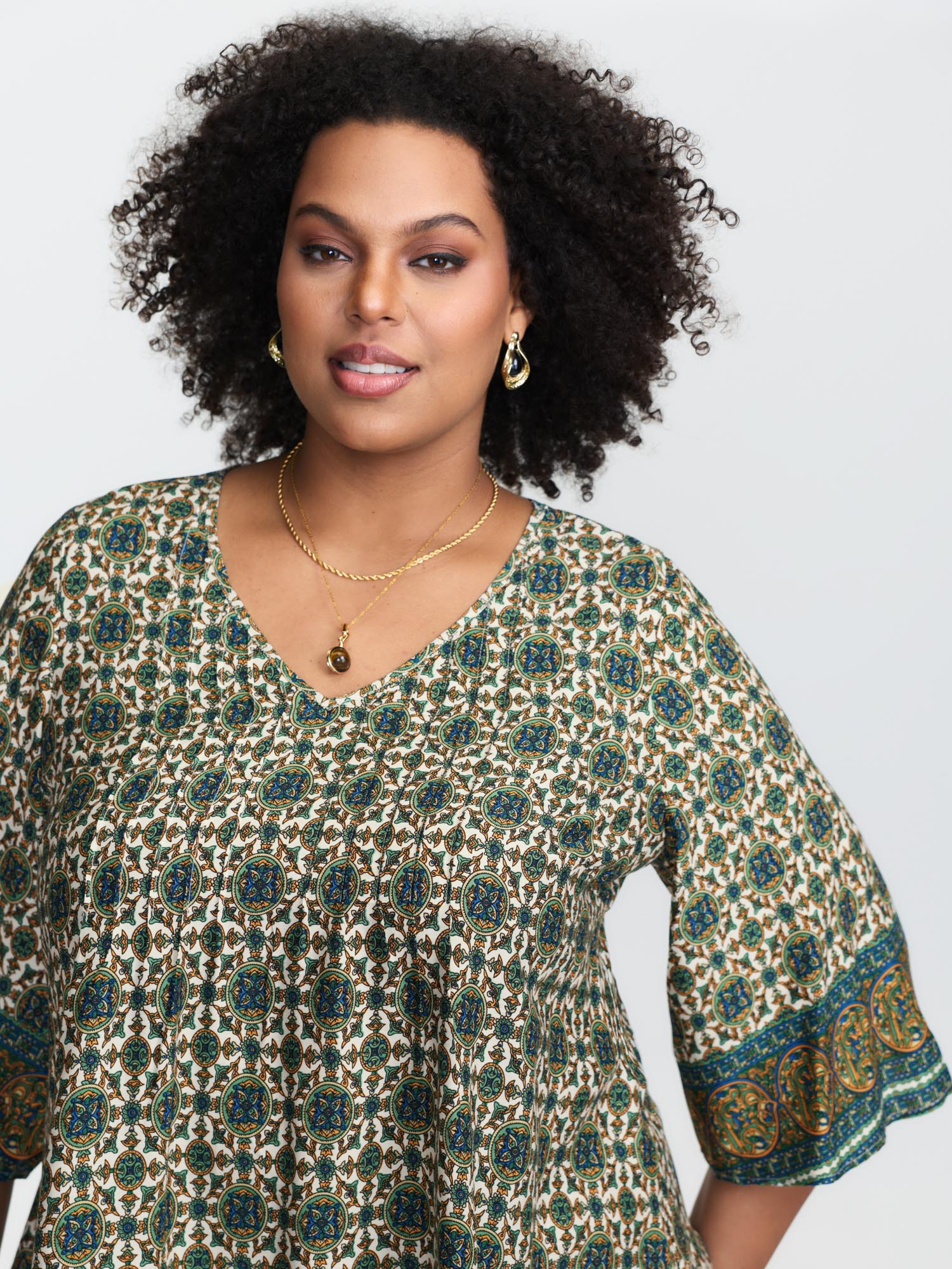 Shop Pin-Tuck Pleat Ornate Print Relaxed Fit Shirt now and redefine your style with confidence at BloomChic. Tailored for mid and plus-size women. This trendy Tops Women, sizes 10-30. Color:Multicolor, Black, Dark Blue, Scarlet Red, Indigo, Rosered;Style:Boho;Prints:Bohemian print;Neckline:V-neck;Sleeve Type:Bell Sleeve;Details:Tucked seam;Pocket:No-pocket