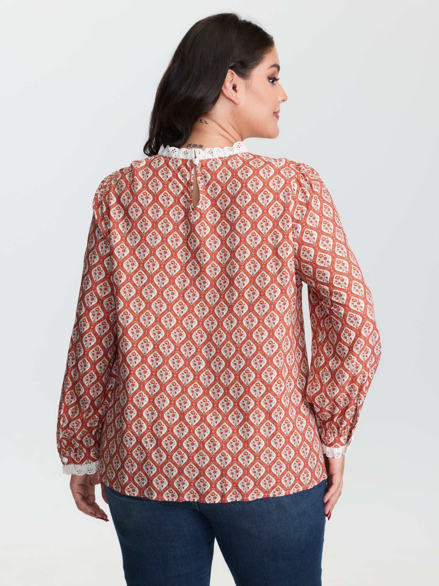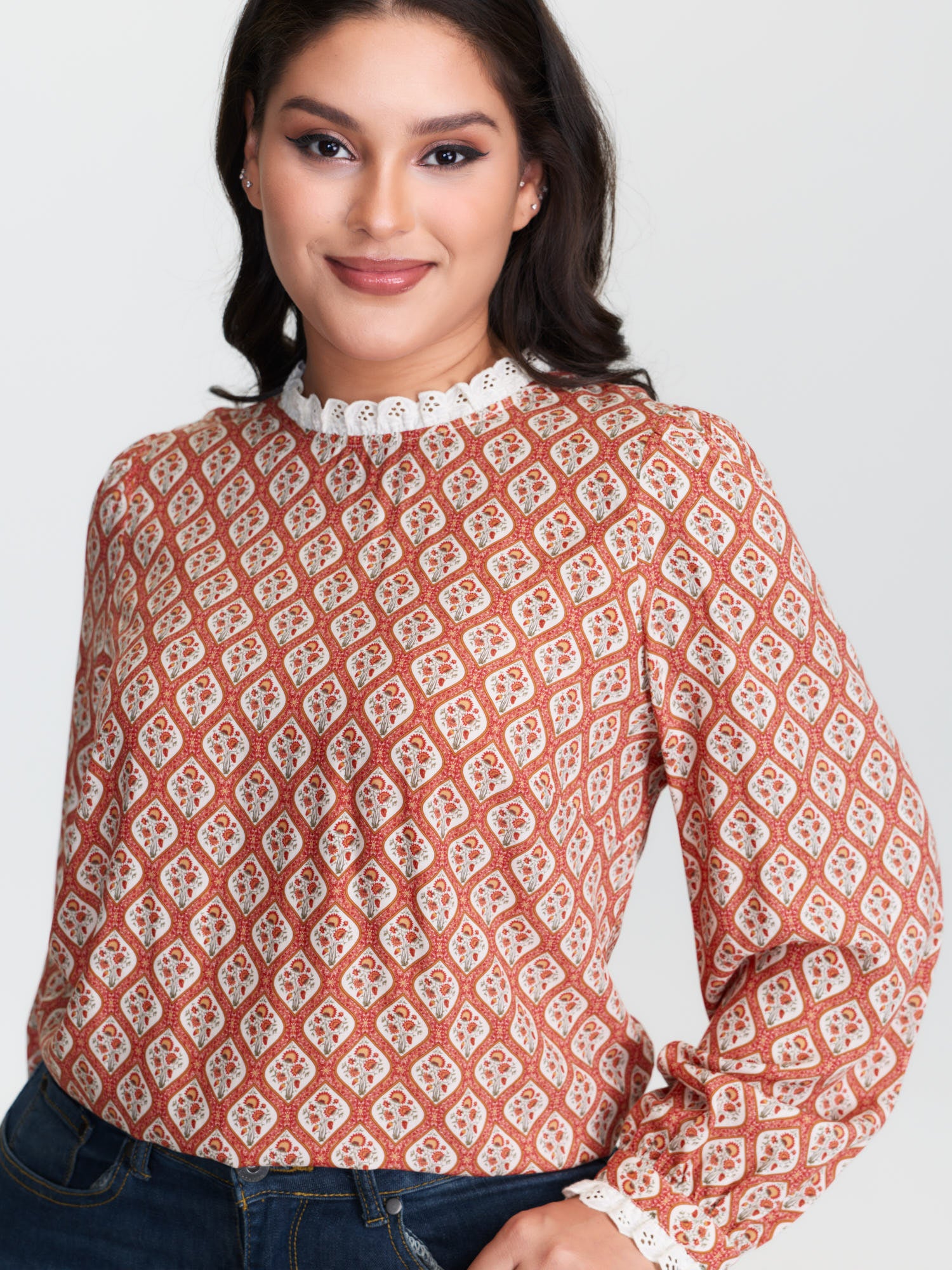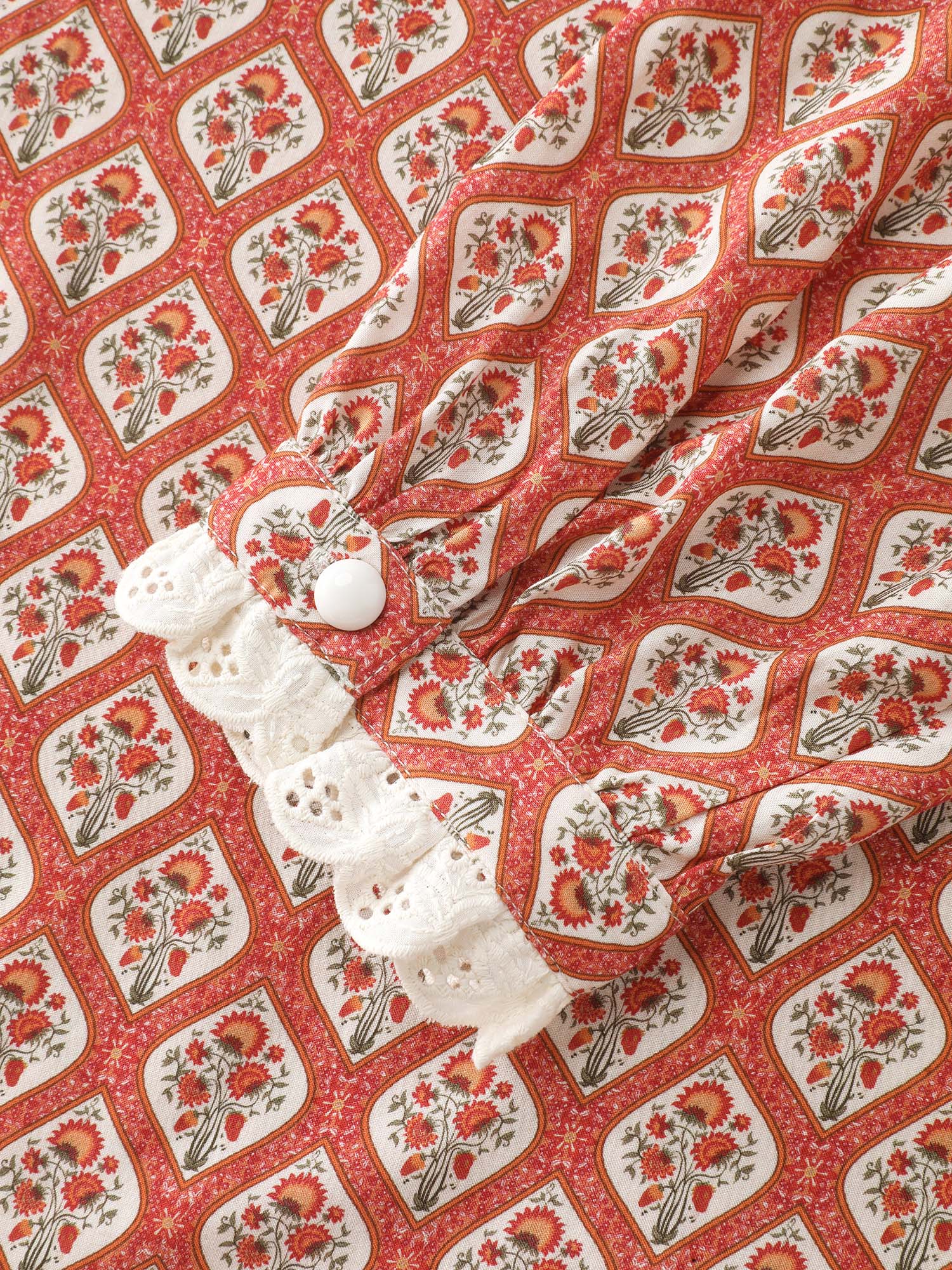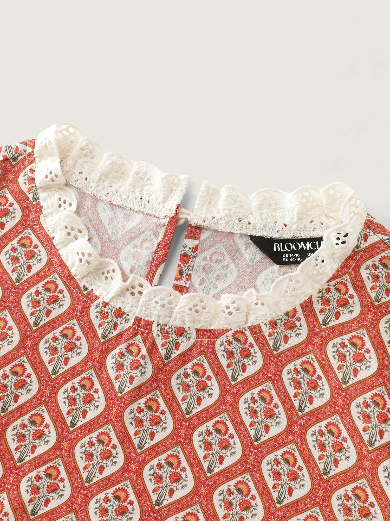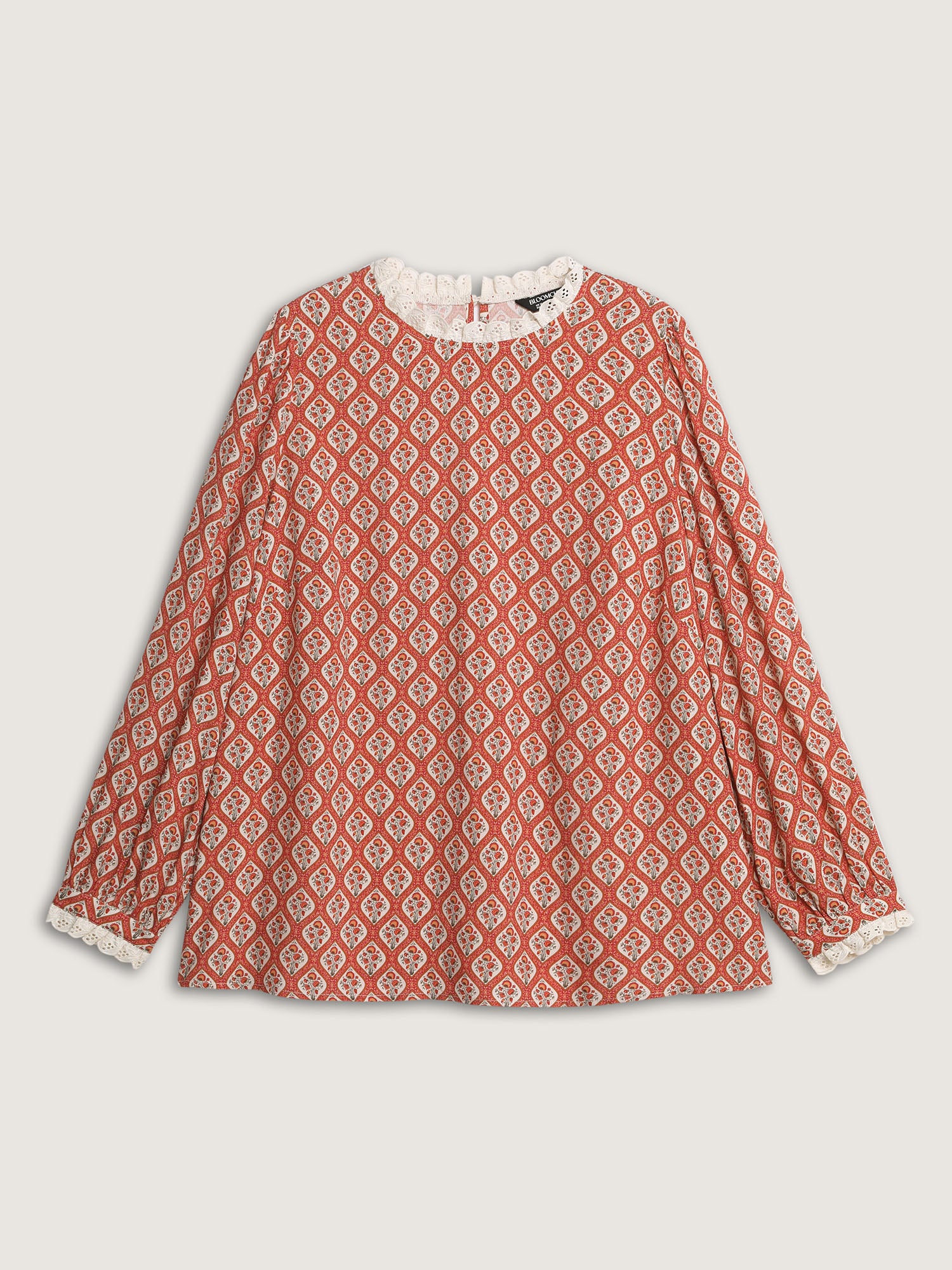 Shop Retro Geometric Floral Print Round Neck Blouse now and redefine your style with confidence at BloomChic. Tailored for mid and plus-size women. This trendy Tops Women, sizes 10-30. Color:Rust;Style:Retro;Prints:Floral;Neckline:Stand-up collar;Sleeve Type:Regular Sleeve;Details:Woven ribbon&lace trim, Contrast, Cut-Out;Pocket:No-pocket