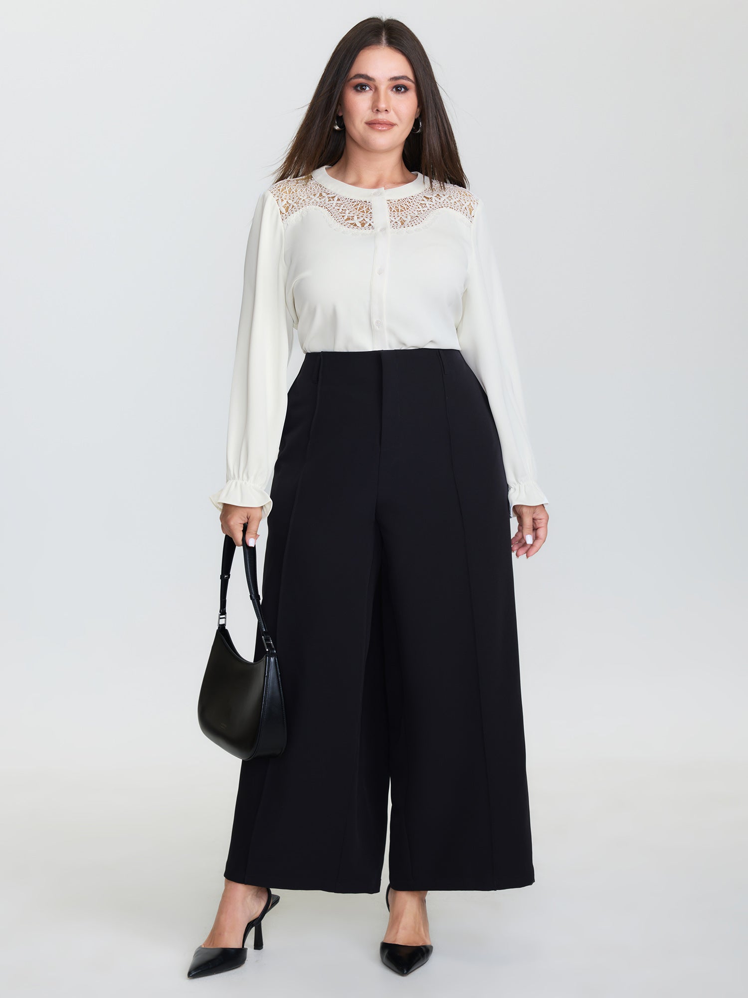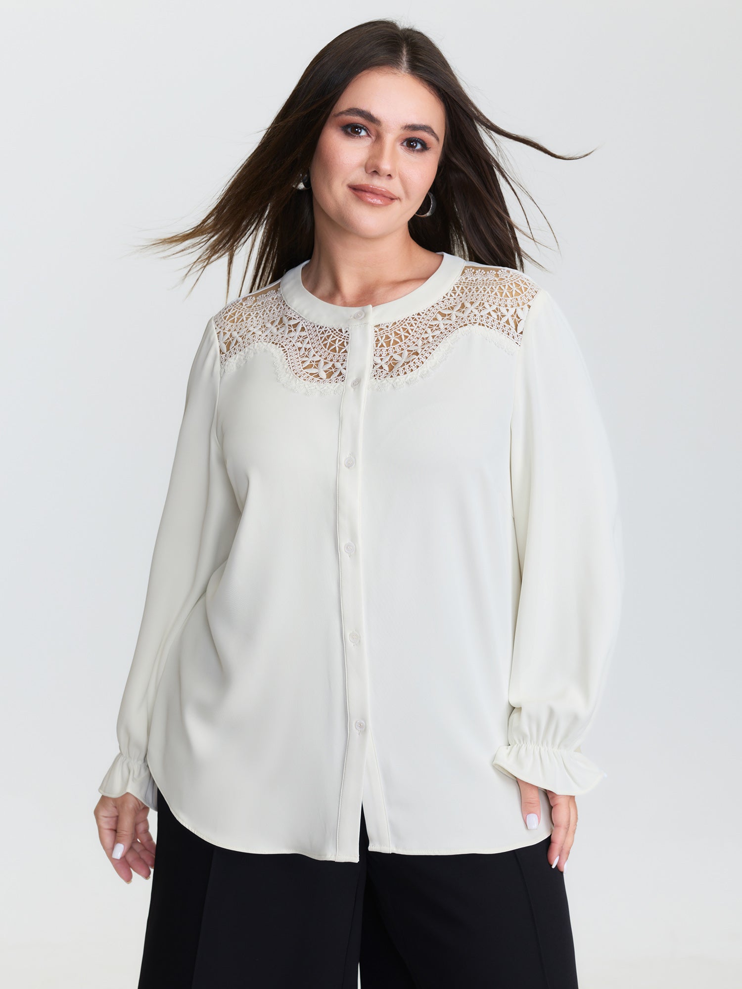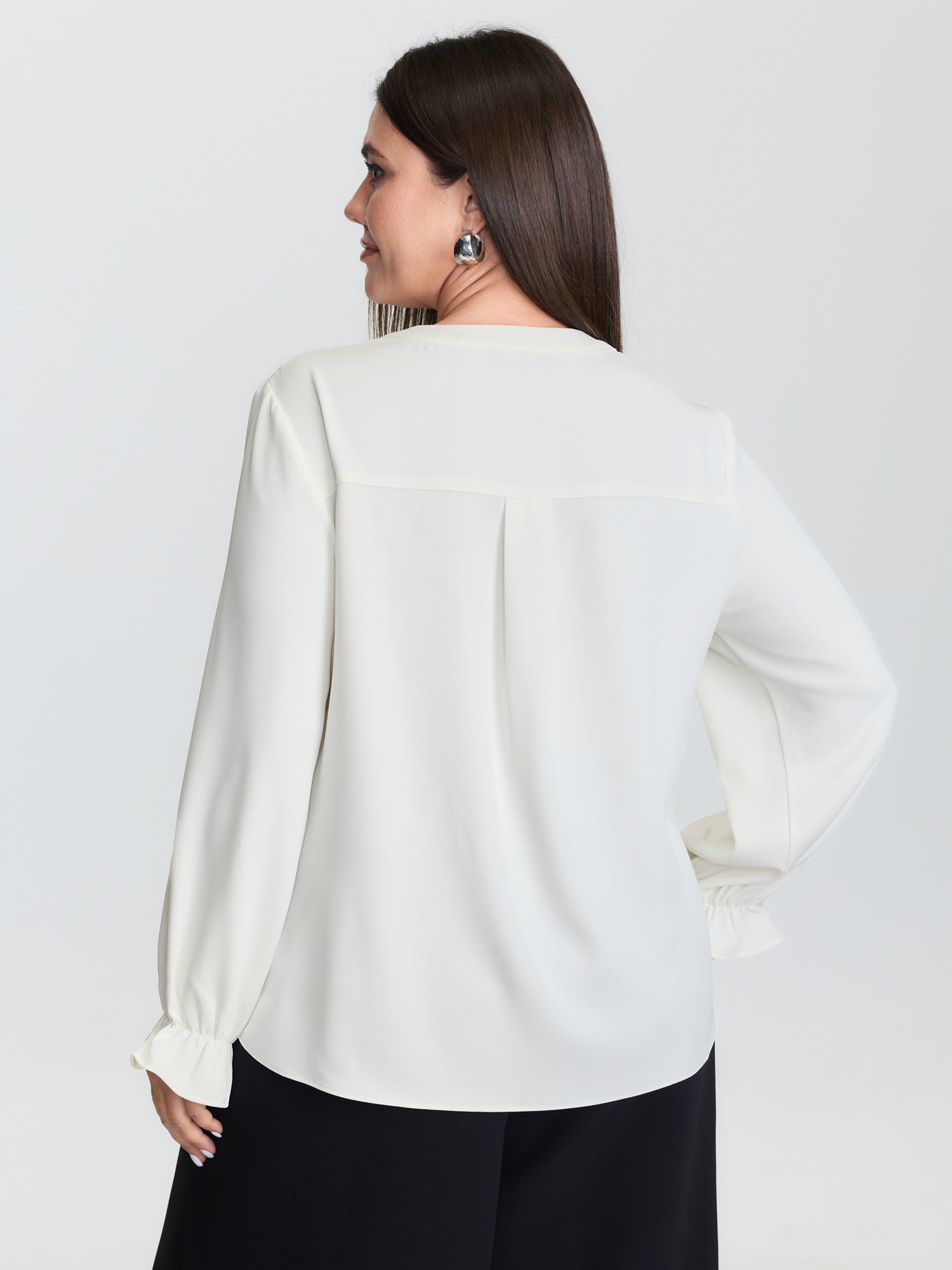 Shop Sheer Neckline Ruffled Cuff Sleeve Blouse now and redefine your style with confidence at BloomChic. Tailored for mid and plus-size women. This trendy Tops Women, sizes 10-30. Color:lvory;Style:Office;Prints:Non;Neckline:Round Neck;Sleeve Type:Ruffle Sleeve;Pocket:No-pocket