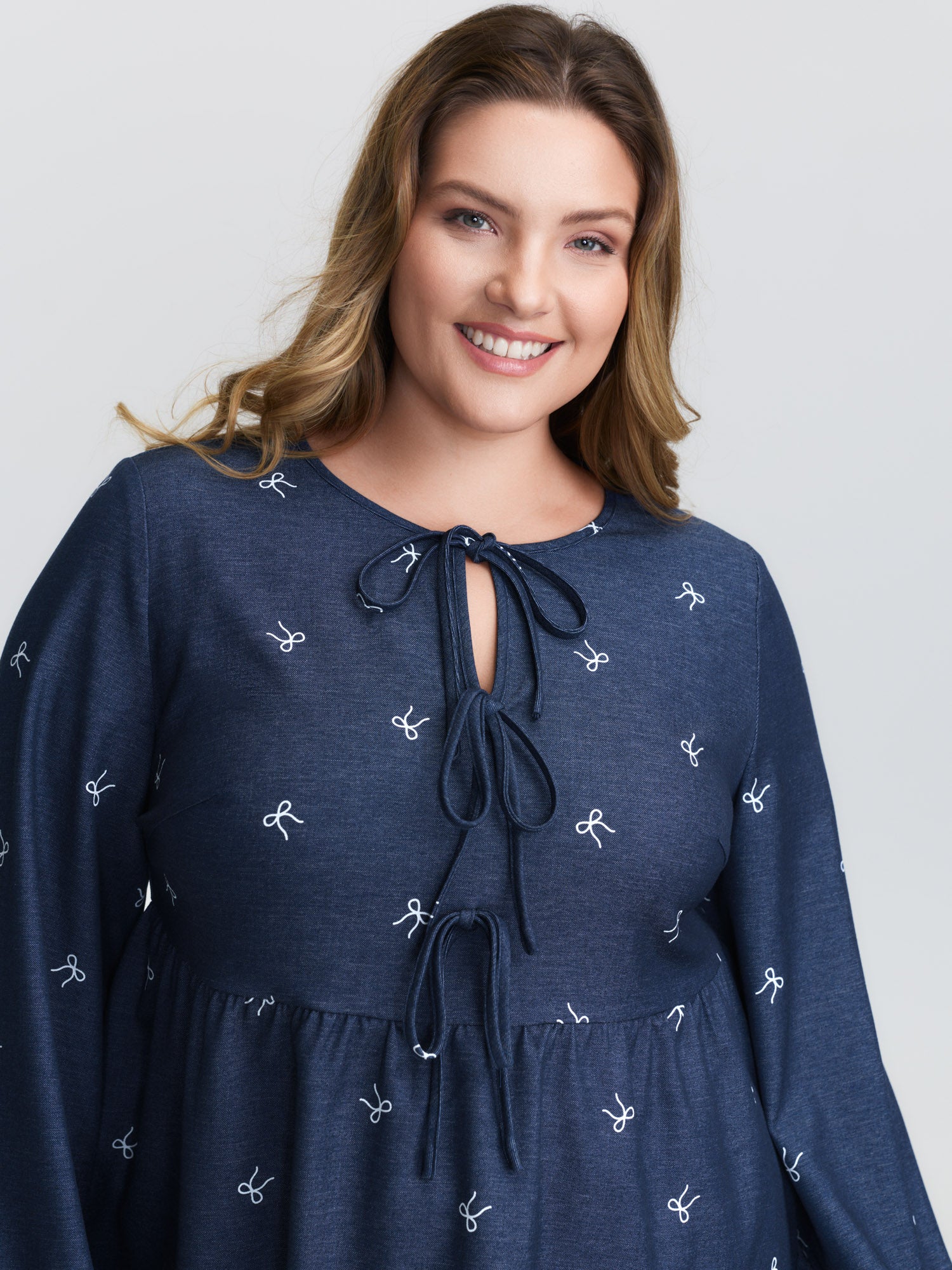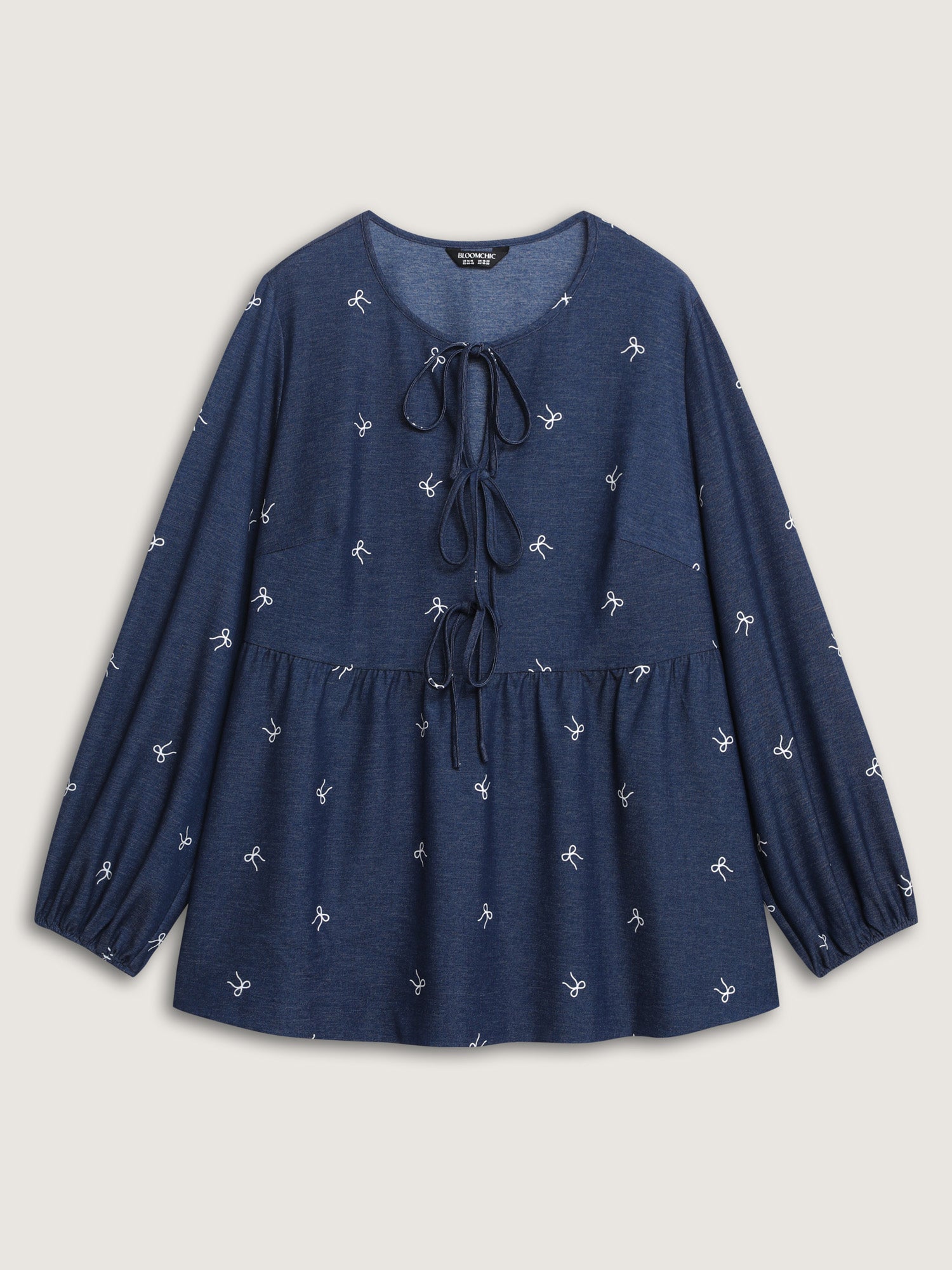 Shop Stretchy Neck-Tie Bubble Sleeve Blouse now and redefine your style with confidence at BloomChic. Tailored for mid and plus-size women. This trendy Tops Women, sizes 10-30. Color:Denimindigo;Style:Leisure;Prints:Non;Neckline:Round Neck;Sleeve Type:Lantern Sleeve;Details:Tie knot, Gathered;Pocket:No-pocket