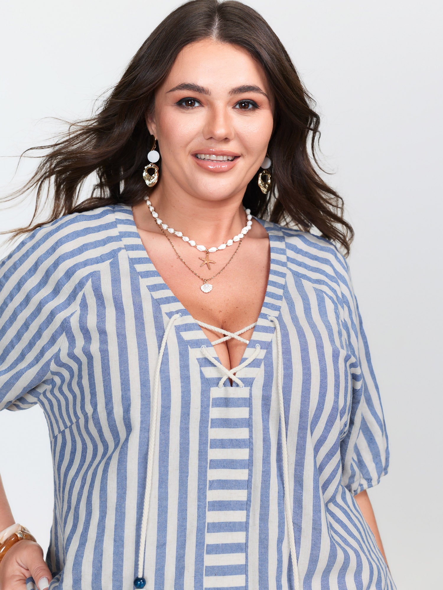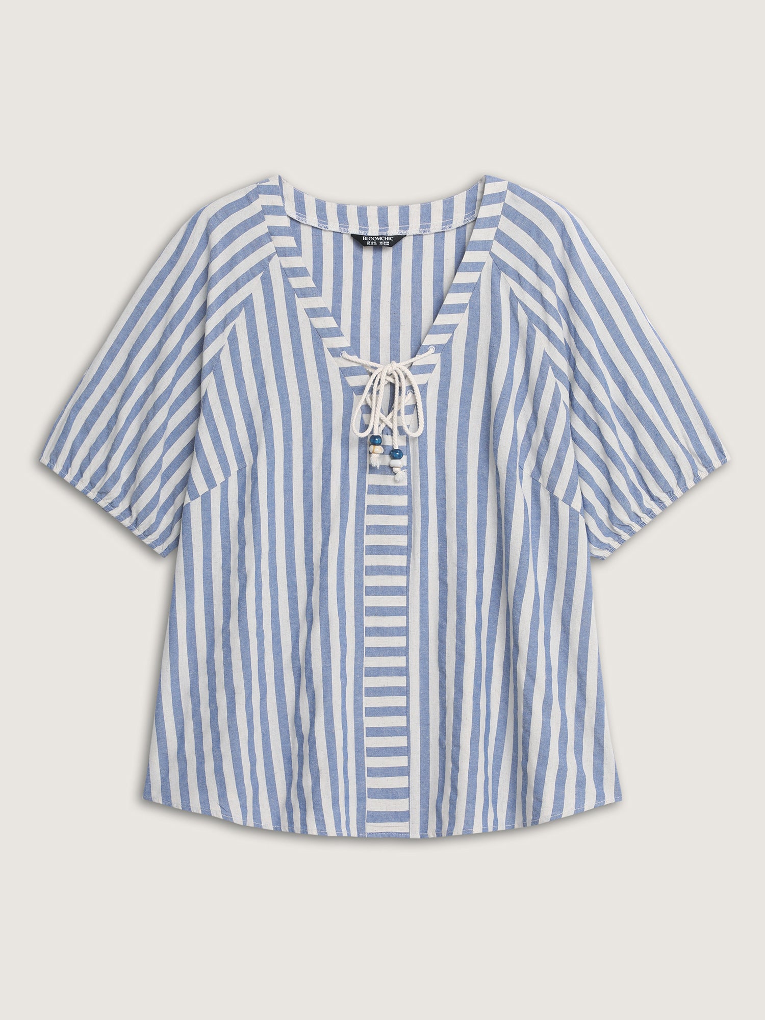 Shop Striped Print Neck Tie Relaxed Fit Blouse now and redefine your style with confidence at BloomChic. Tailored for mid and plus-size women. This trendy Tops Women, sizes 10-30. Color:Azure;Style_2:Resort;Prints:Stripes;Neckline:Deep V-neck;Sleeve Type:Regular Sleeve;Pocket:No-pocket