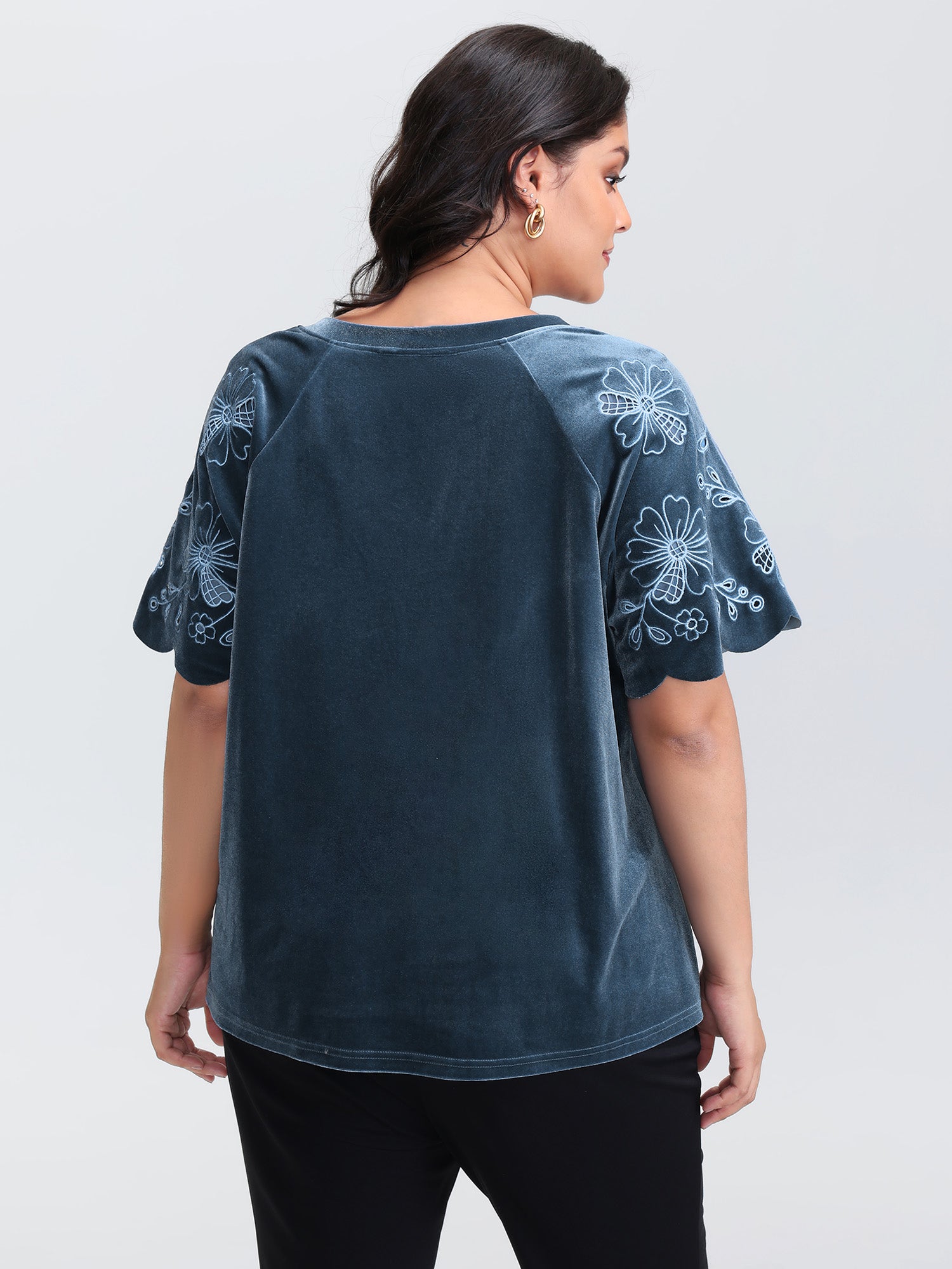 Velvet Embroidered Mesh Sleeve Stretchy Blouse