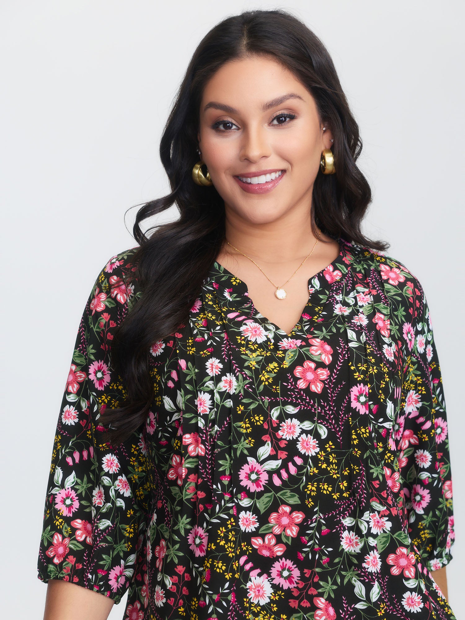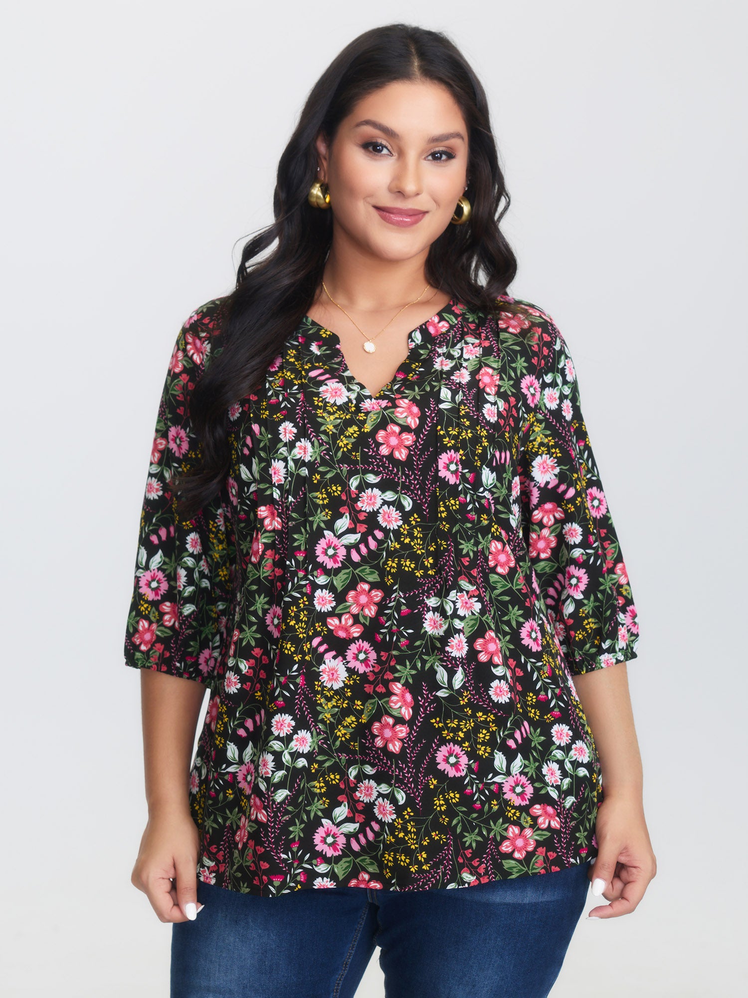 Silhouette Floral Print Notched Collar Pleated Blouse