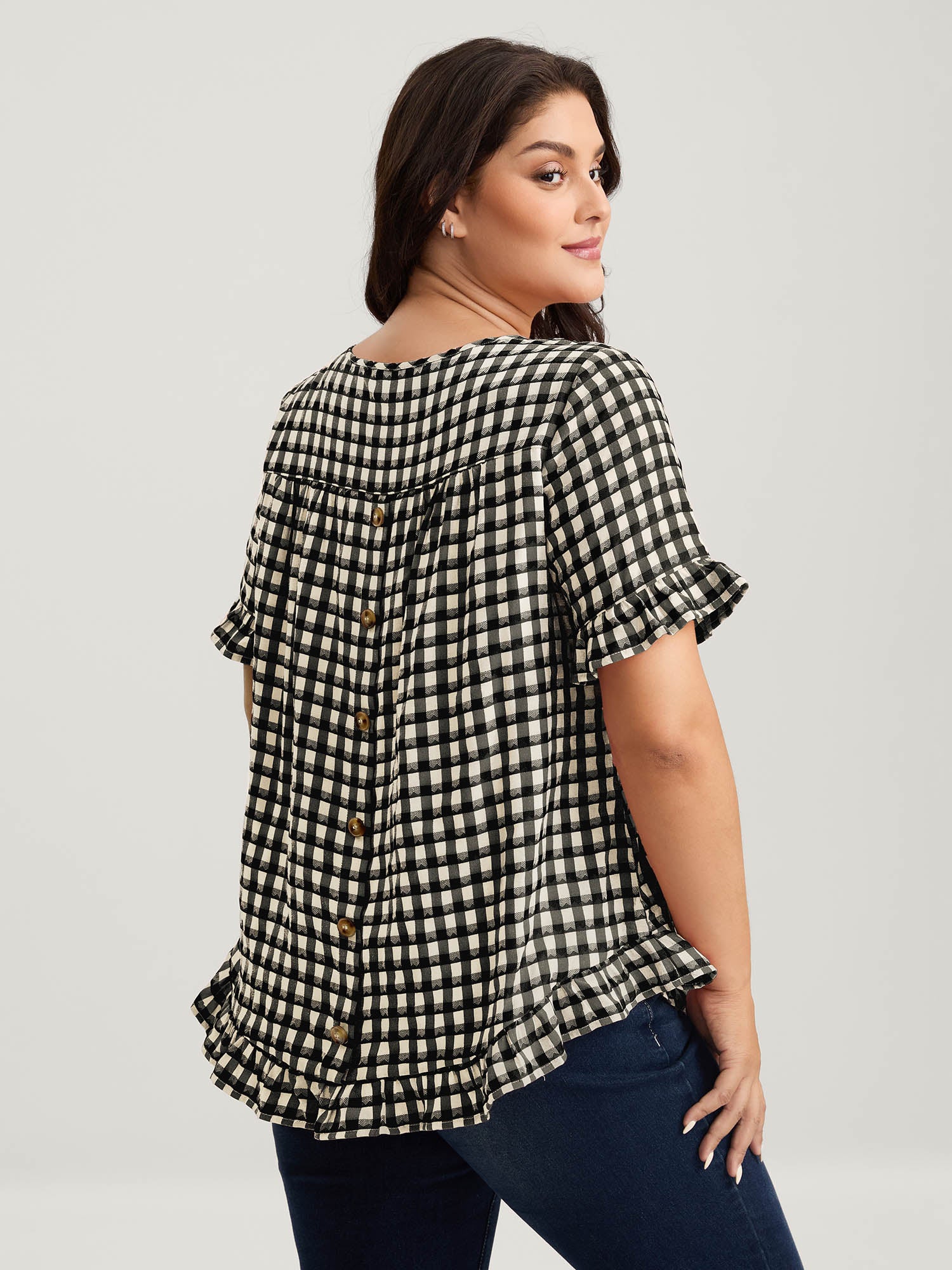 Gingham Print Button Back Blouse