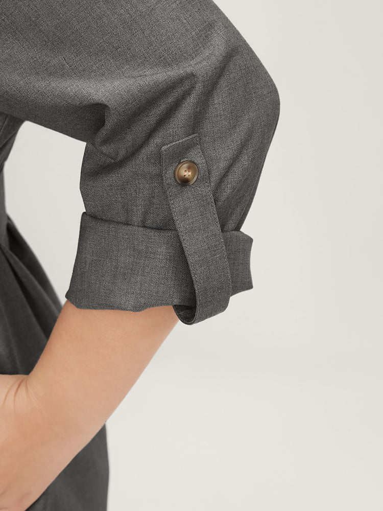 Plain Lapel Collar Pocket Roll Sleeve Belted Coat