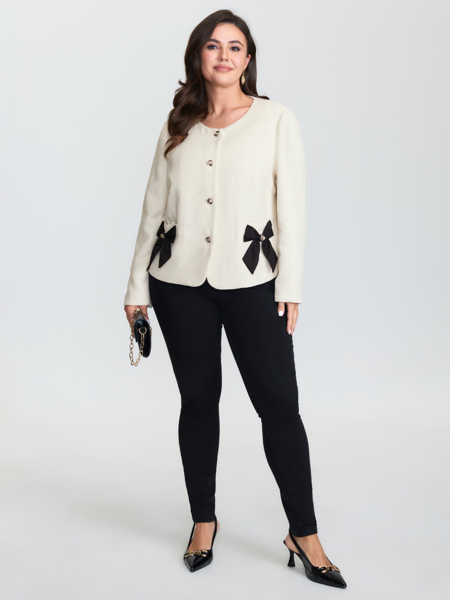 Shop Tweed Bowknot Cropped Coat now and redefine your style with confidence at BloomChic. Tailored for mid and plus-size women. This trendy Outerwear Women, sizes 10-30. Color:Ivory;Style:Timeless;Prints:Non;Details:Bowknot, Texture;Pocket:Single-flap pocket;Belt:No-belt;Closure Type:Button;Lining:Lining
