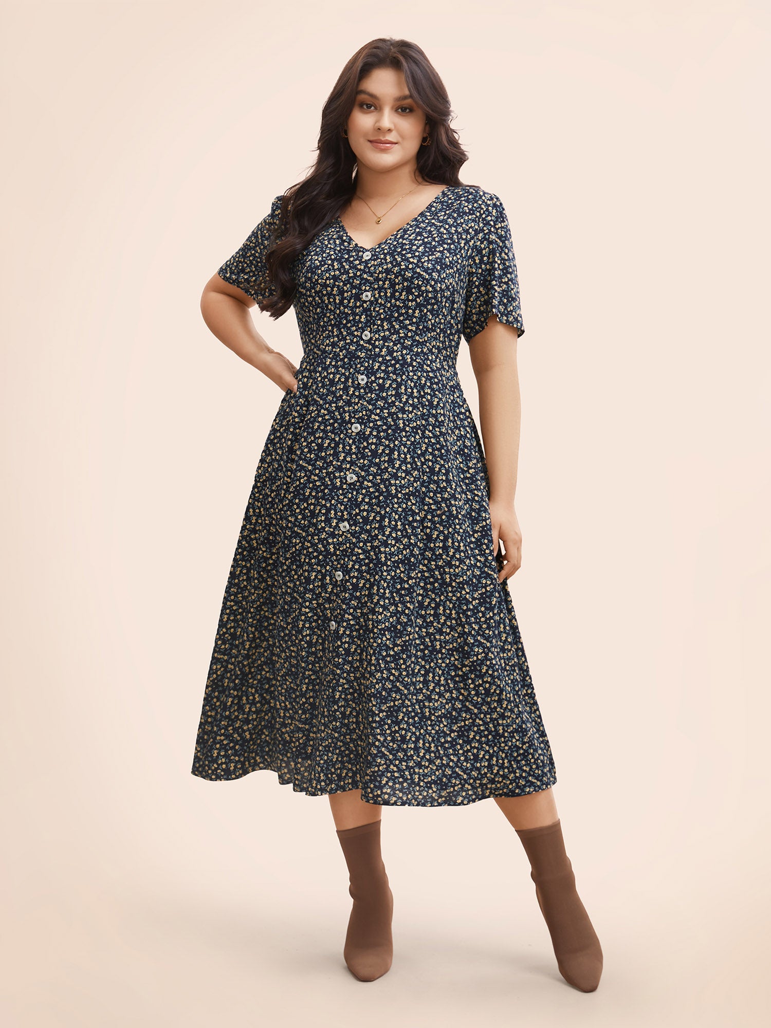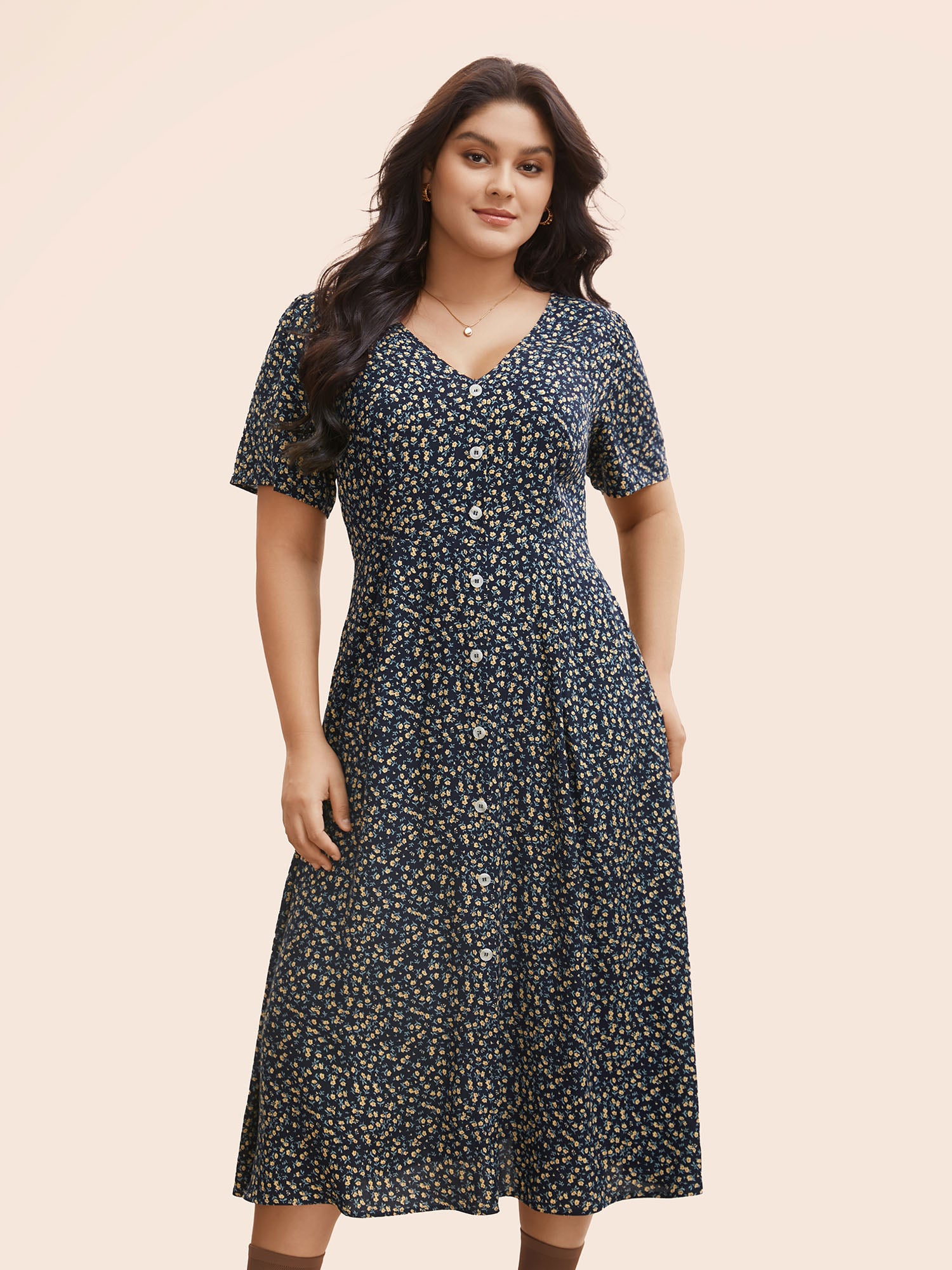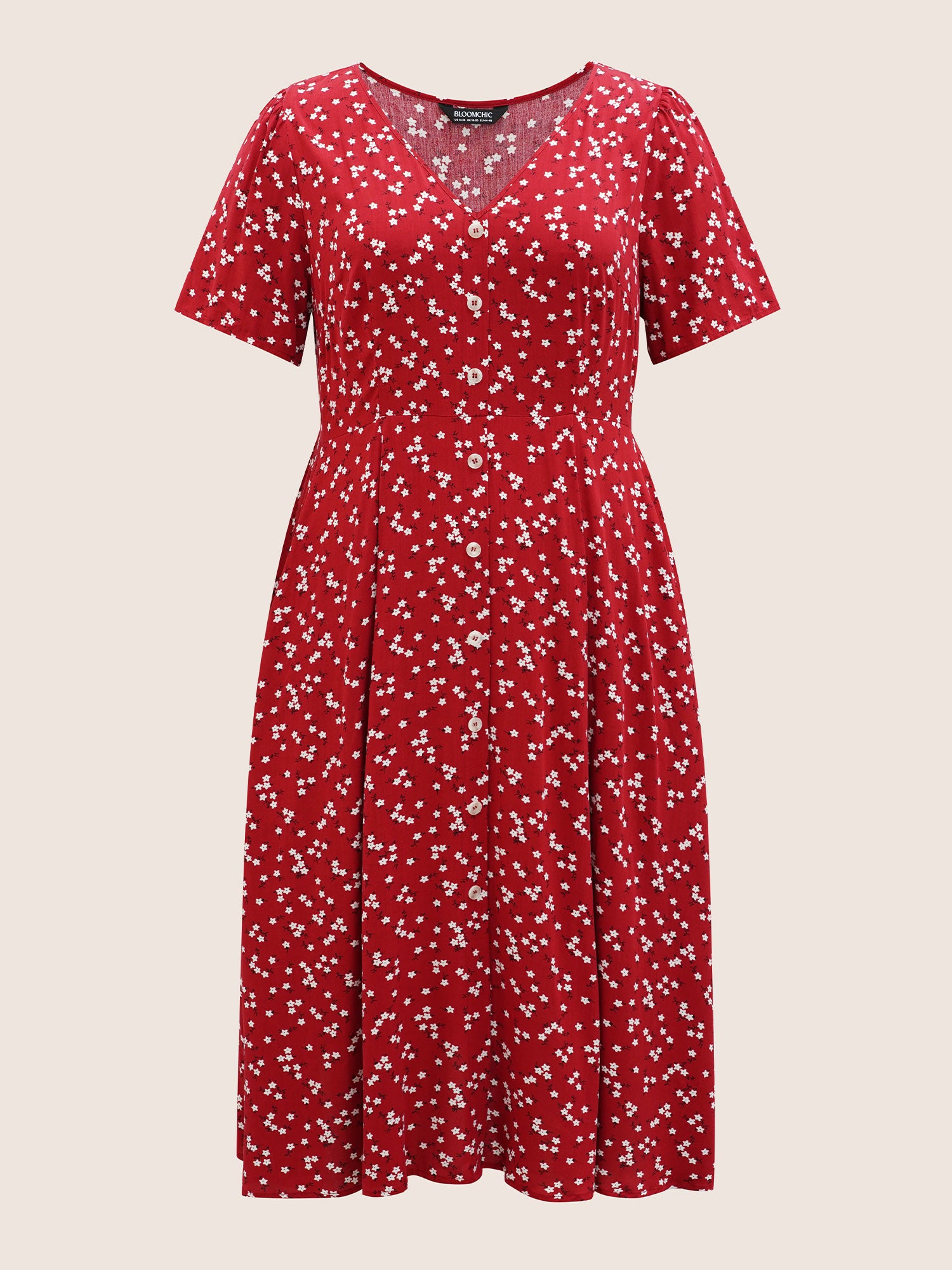 Shop Ditsy Floral Button Detail Elastic Waist Midi Dress now and redefine your style with confidence at BloomChic. Tailored for mid and plus-size women. This trendy Dress, sizes 10-30. You can never go wrong with BloomChic Dresses. Color:Crimson,DarkBlue;Style:Elegant;Neckline:V-neck;Sleeve Type:Regular Sleeve;Prints:Ditsy floral;Details:Button, Gathered;Pocket:Side seam pocket;Belt:No-belt;Closure Type:Decorative button