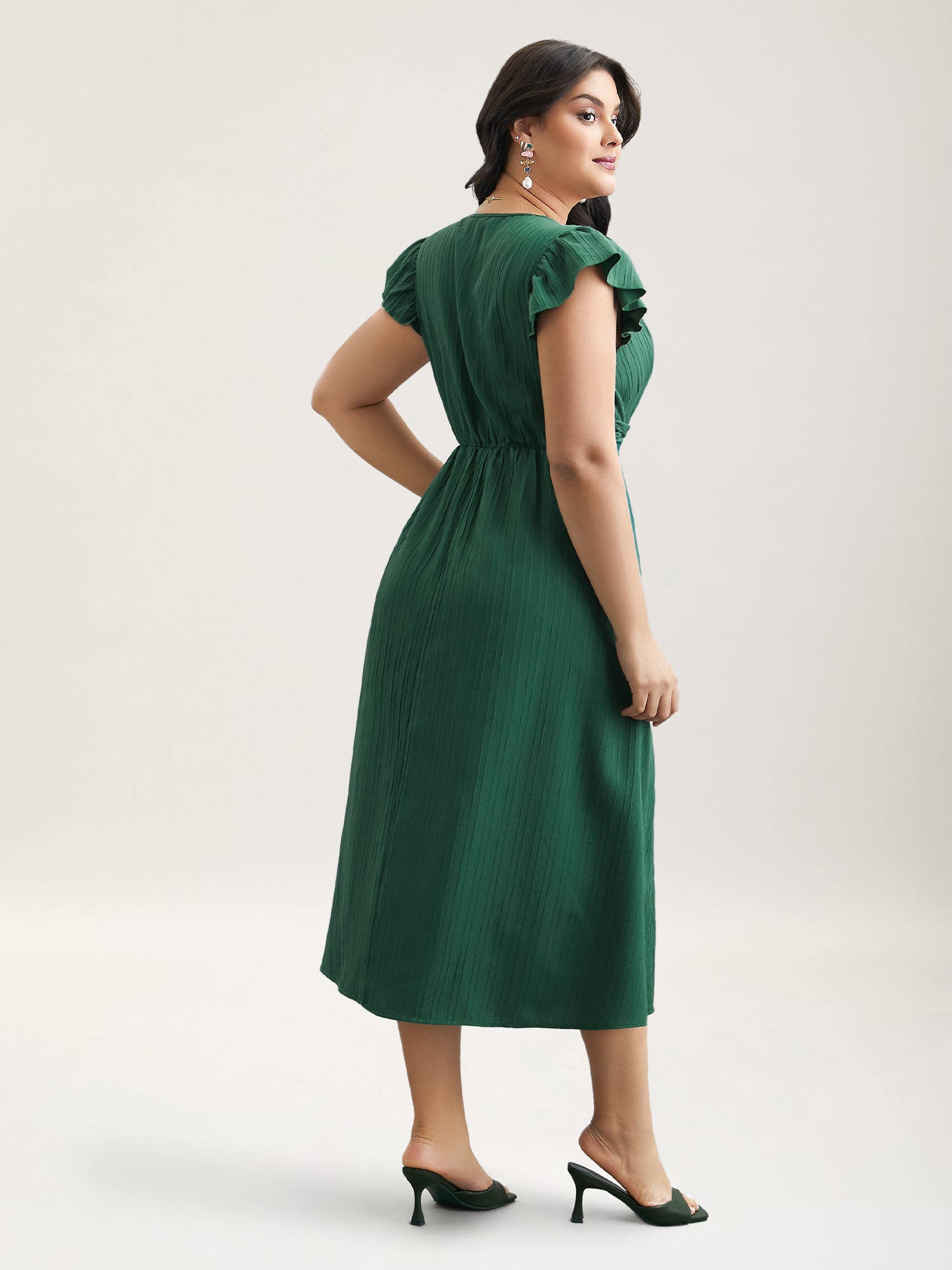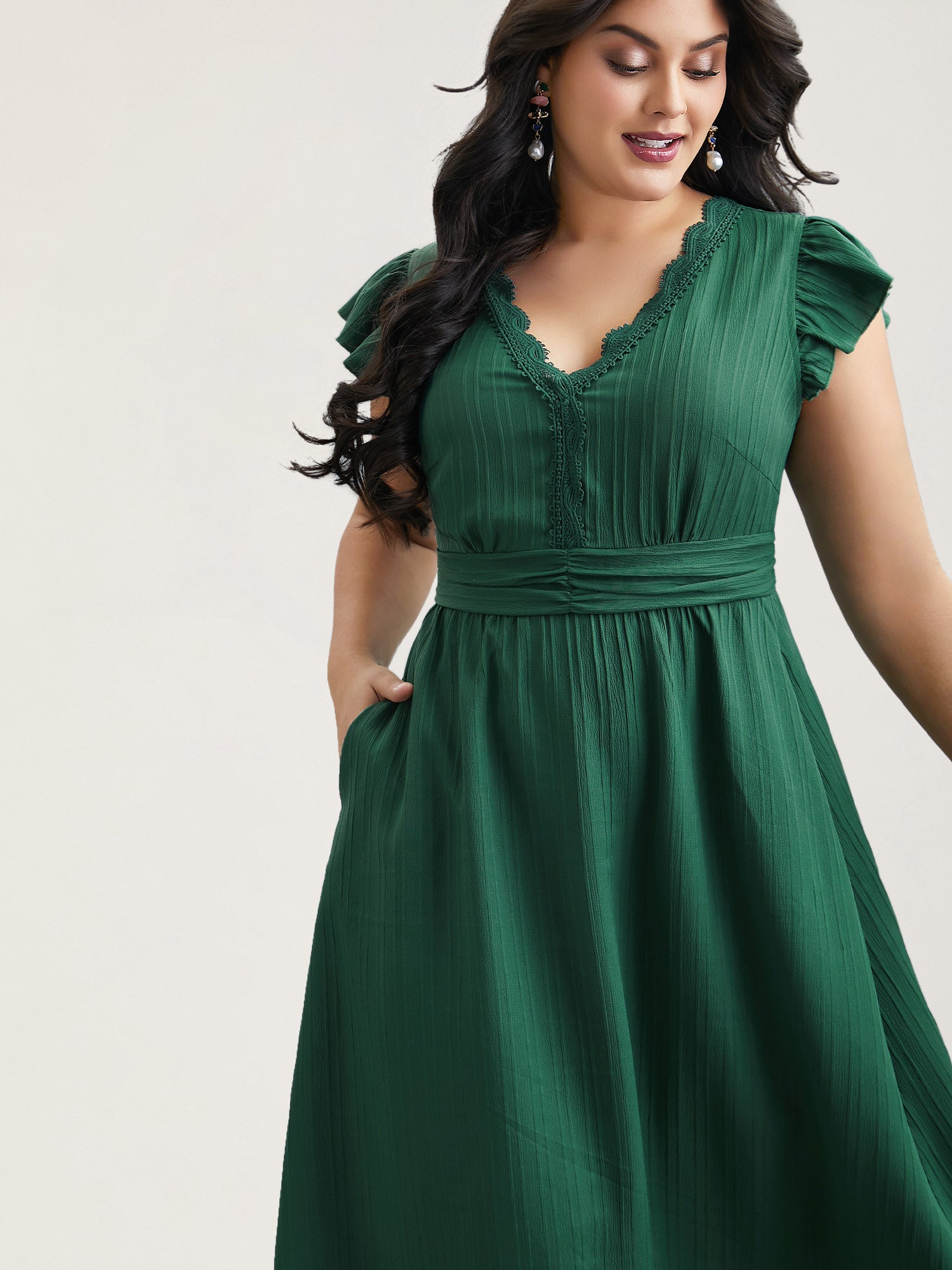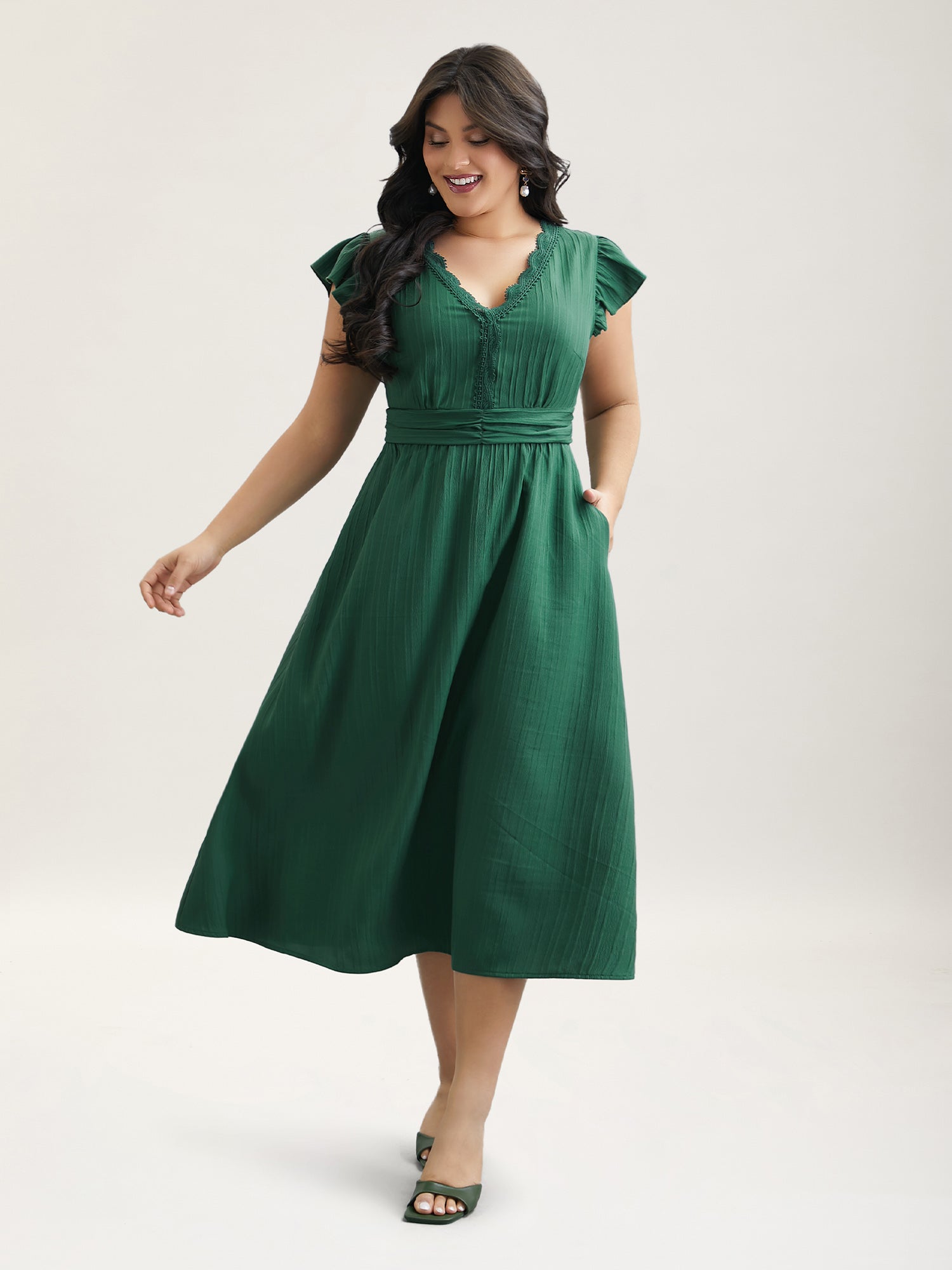 Lace Trim Stitch Textured Waist-Defined Midi Dress