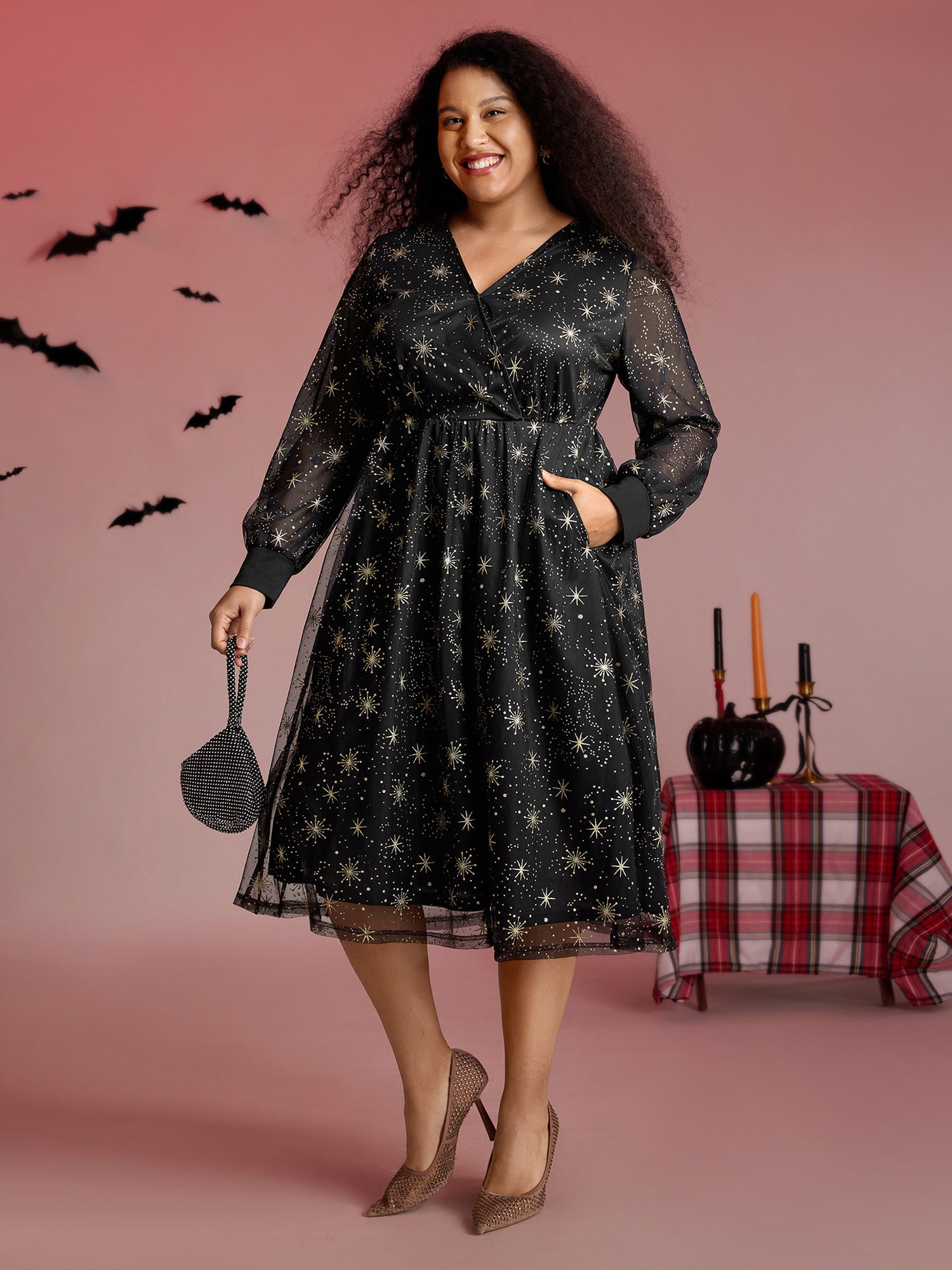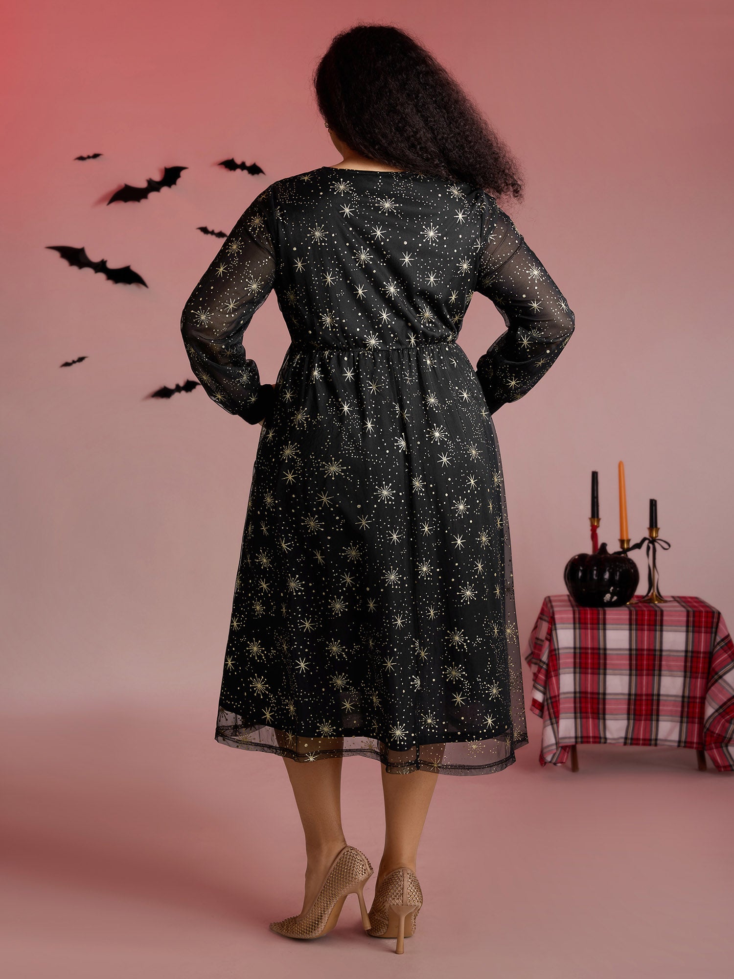 Shop Star Moon Mesh Cinched-Waist Midi Dress now and redefine your style with confidence at BloomChic. Tailored for mid and plus-size women. This trendy Dress, sizes 10-30. You can never go wrong with BloomChic Dresses. Color:BlackFlower;Neckline:Overlap Collar;Sleeve Type:Lantern Sleeve;Prints:Stars and moons;Details:Overlapping;Pocket:Side seam pocket;Belt:No-belt;Closure Type:Non