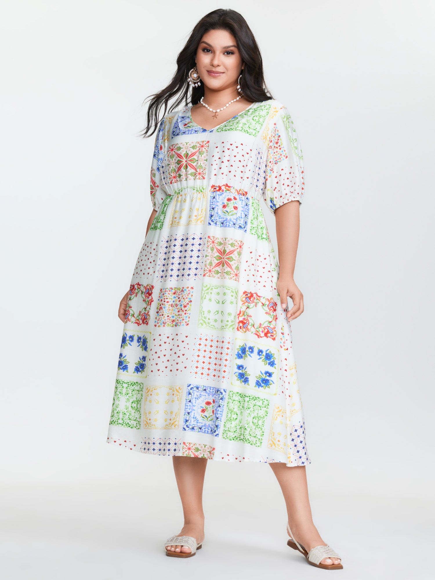 Shop Floral Collage Pockets Stretchy Waist Midi Dress now and redefine your style with confidence at BloomChic. Tailored for mid and plus-size women. This trendy Dress, sizes 10-30. You can never go wrong with BloomChic Dresses. Color:Multicolor;Style:Boho;Neckline:Deep V-neck;Sleeve Type:Regular Sleeve;Prints:Geometric & color block;Pocket:Side seam pocket;Belt:No-belt;Closure Type:Non