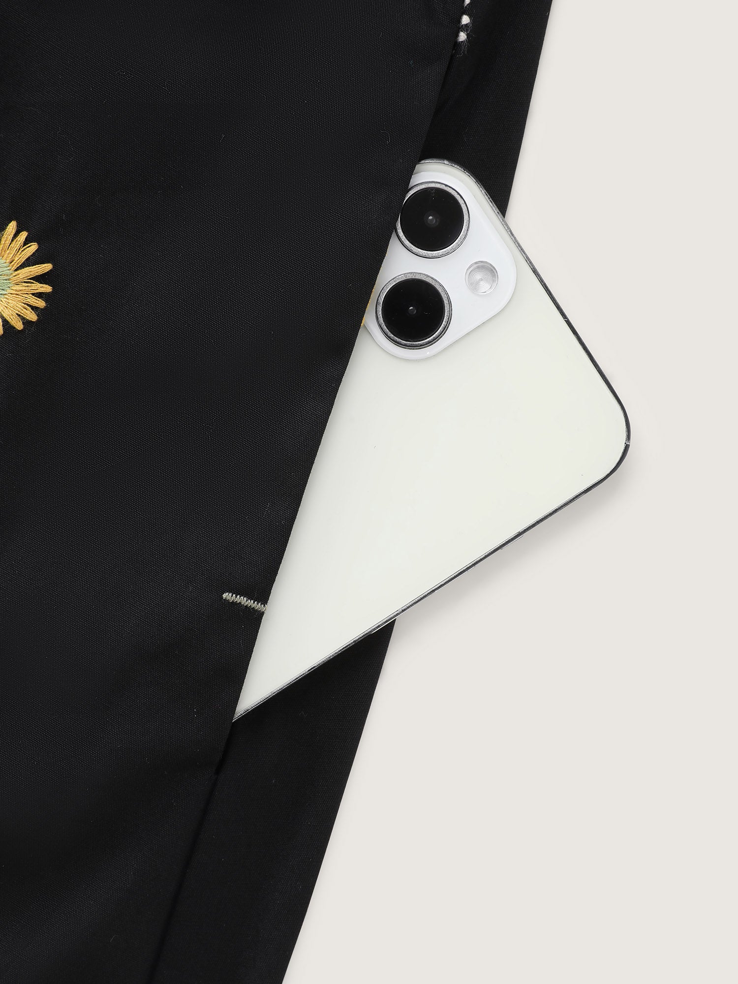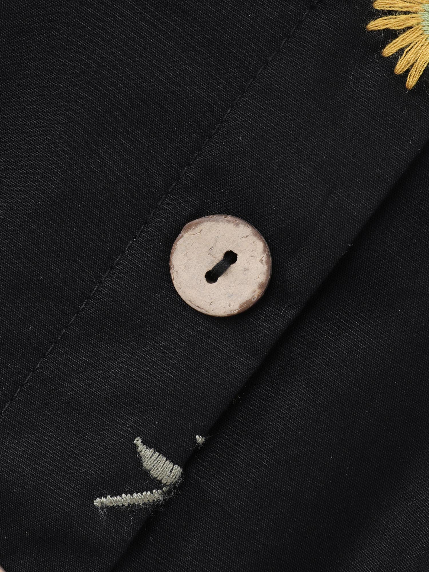 • Floral Embroidered Pockets Shirred Waist Midi Dress