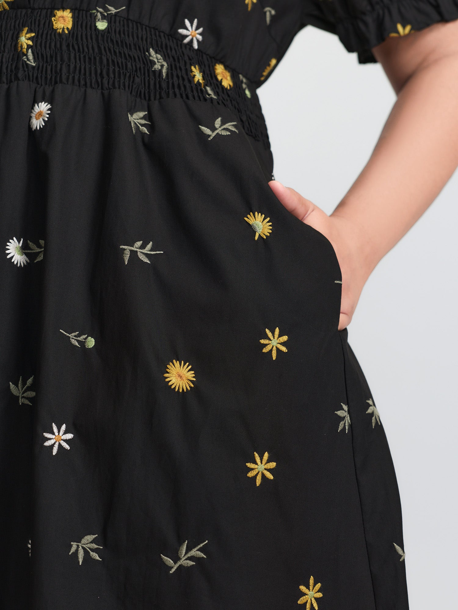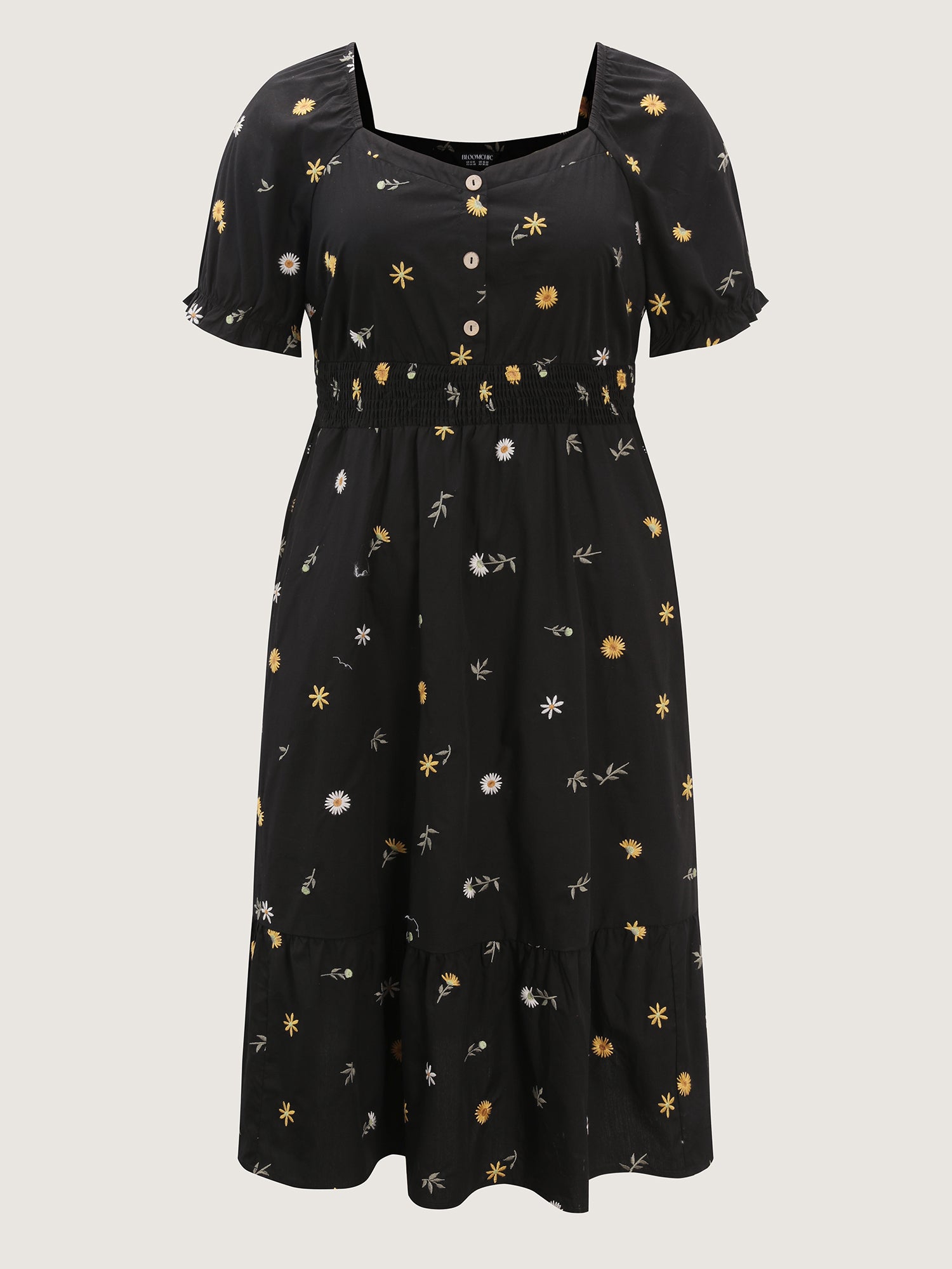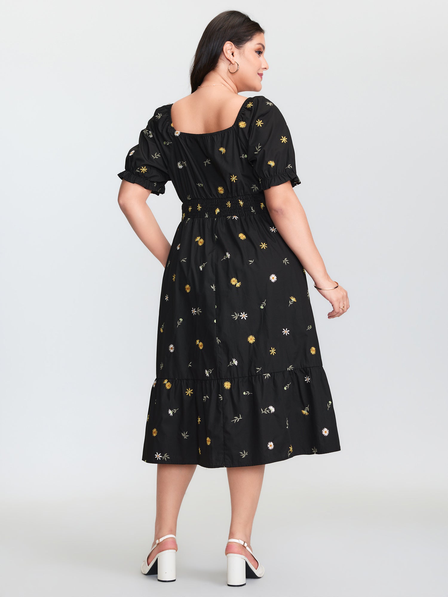 Shop Floral Embroidered Pockets Shirred Waist Midi Dress now and redefine your style with confidence at BloomChic. Tailored for mid and plus-size women. This trendy Dress, sizes 10-30. You can never go wrong with BloomChic Dresses. Color:Black Flower;Style:Romantic;Neckline:Heart neckline;Sleeve Type:Puff Sleeve;Prints:Ditsy floral;Details:Shirred, Contrast, Texture;Pocket:Side seam pocket;Belt:No-belt;Closure Type:Decorative button