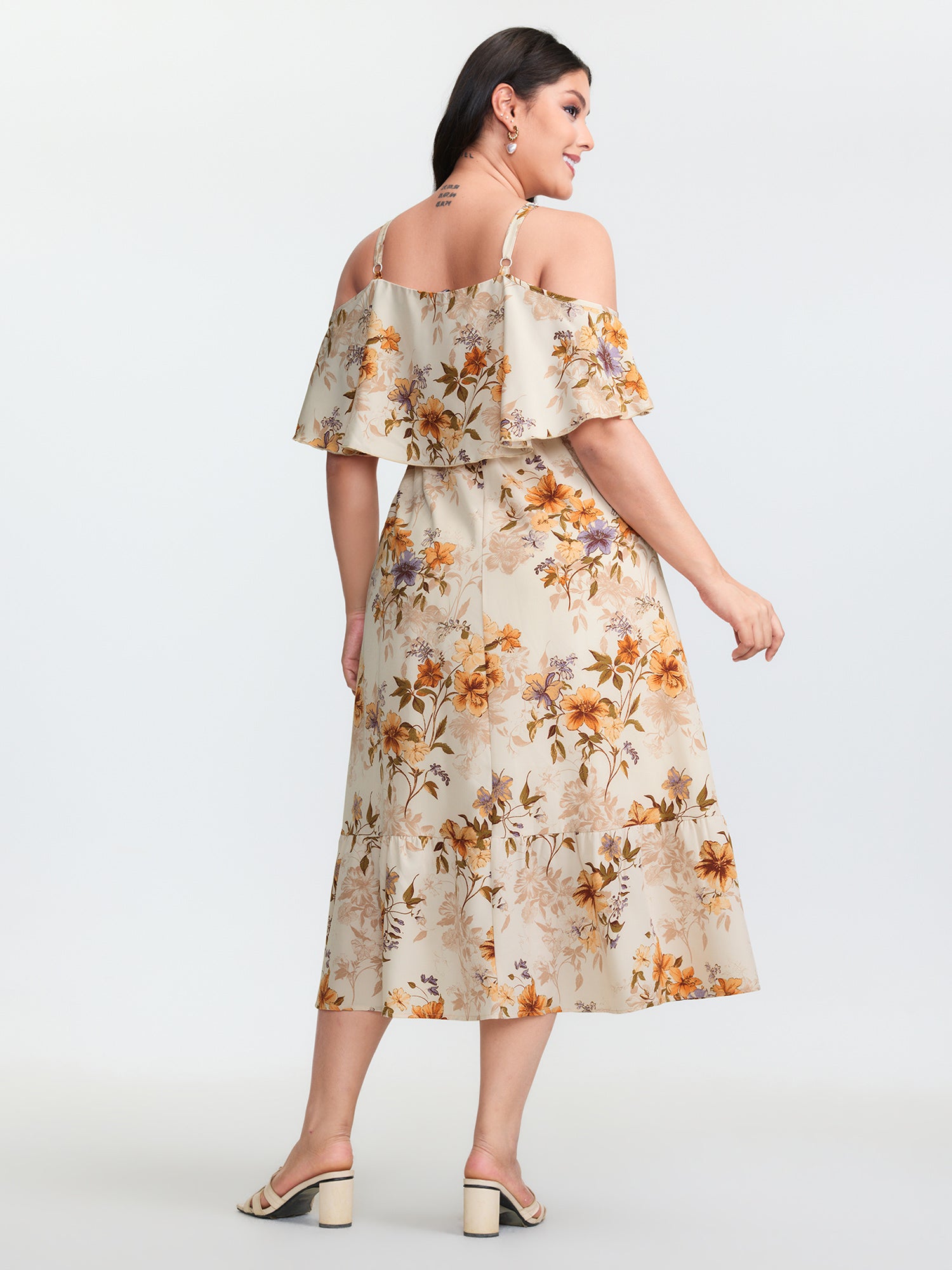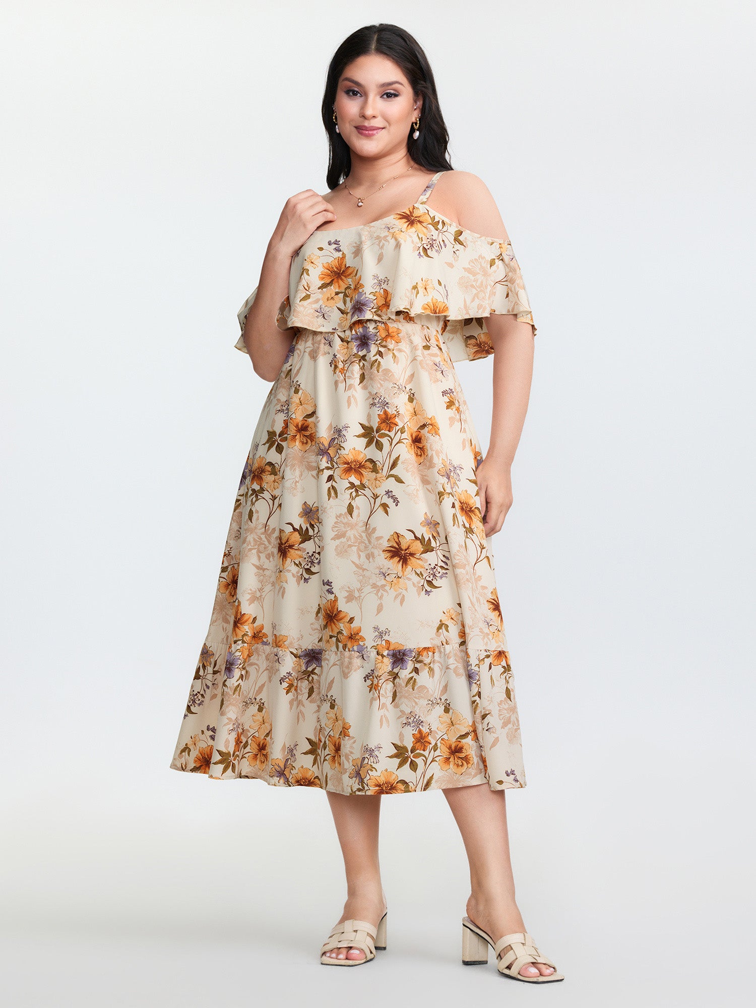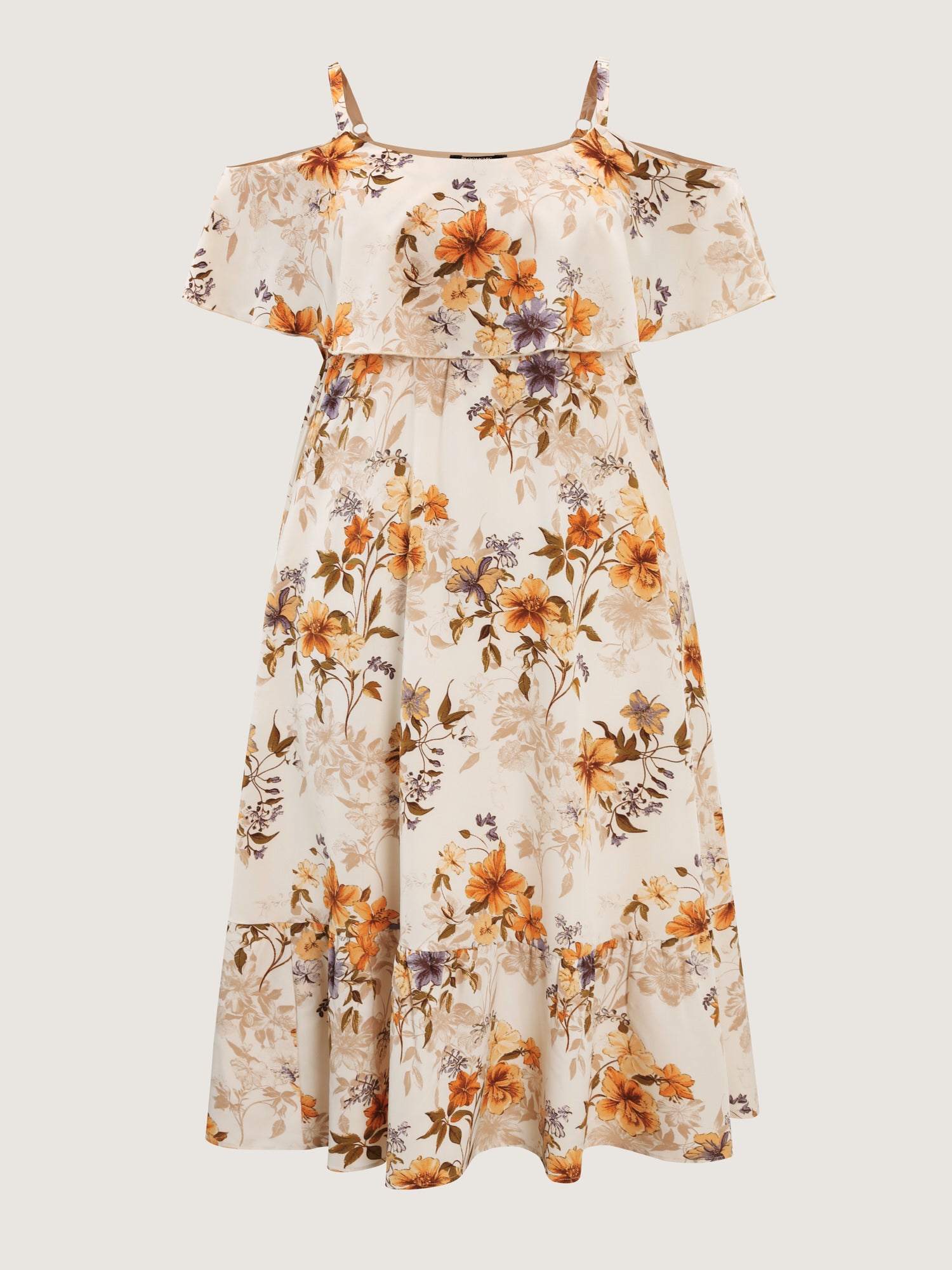 Shop Floral Print Off-Shoulder Midi Dress now and redefine your style with confidence at BloomChic. Tailored for mid and plus-size women. This trendy Dress, sizes 10-30. You can never go wrong with BloomChic Dresses. Color:Apricot;Style:Romantic;Neckline:Non;Sleeve Type:Ruffle Sleeve;Prints:Ditsy floral;Details:Contrast, Tiered;Pocket:Side seam pocket;Belt:No-belt;Closure Type:Non