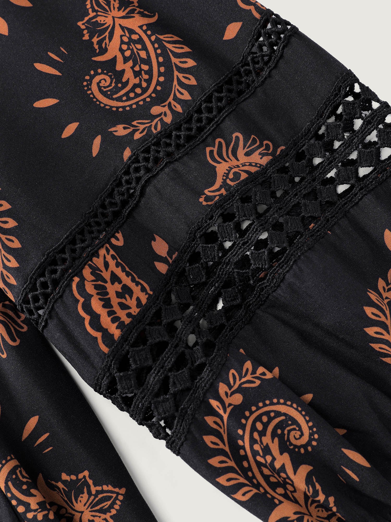 Shop Paisley Print Lace Trim Tiered Maxi Dress now and redefine your style with confidence at BloomChic. Tailored for mid and plus-size women. This trendy Dress, sizes 10-30. You can never go wrong with BloomChic Dresses. Color:Black;Style:Resort;Neckline:V-neck;Sleeve Type:Lantern Sleeve;Prints:Paisley;Pocket:Side seam pocket;Belt:No-belt;Closure Type:Decorative button