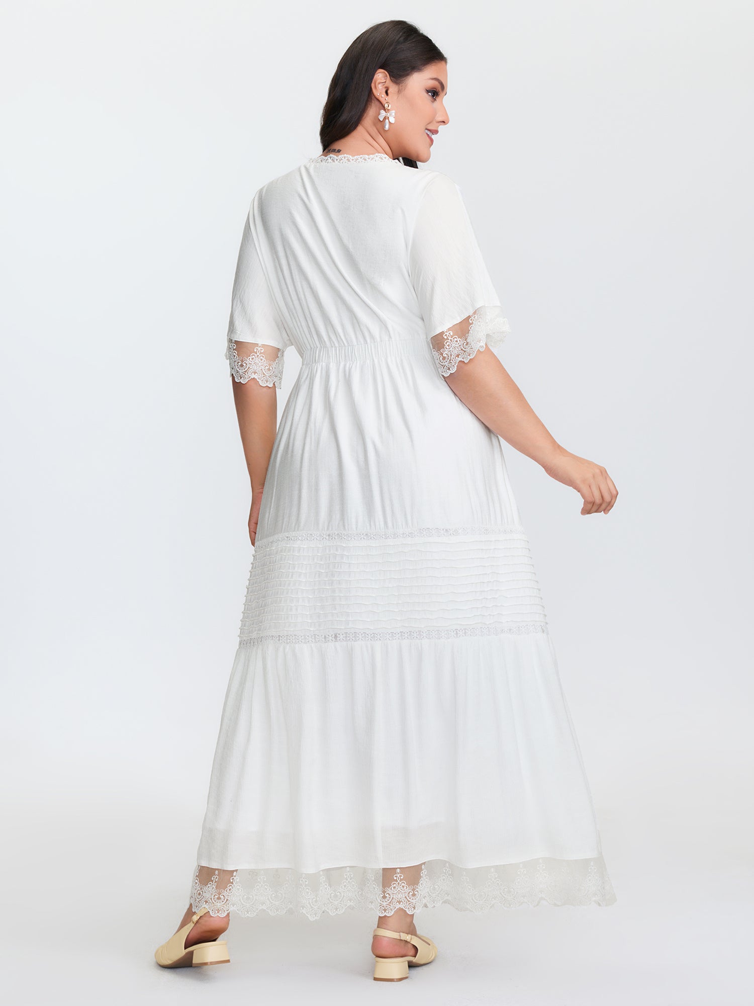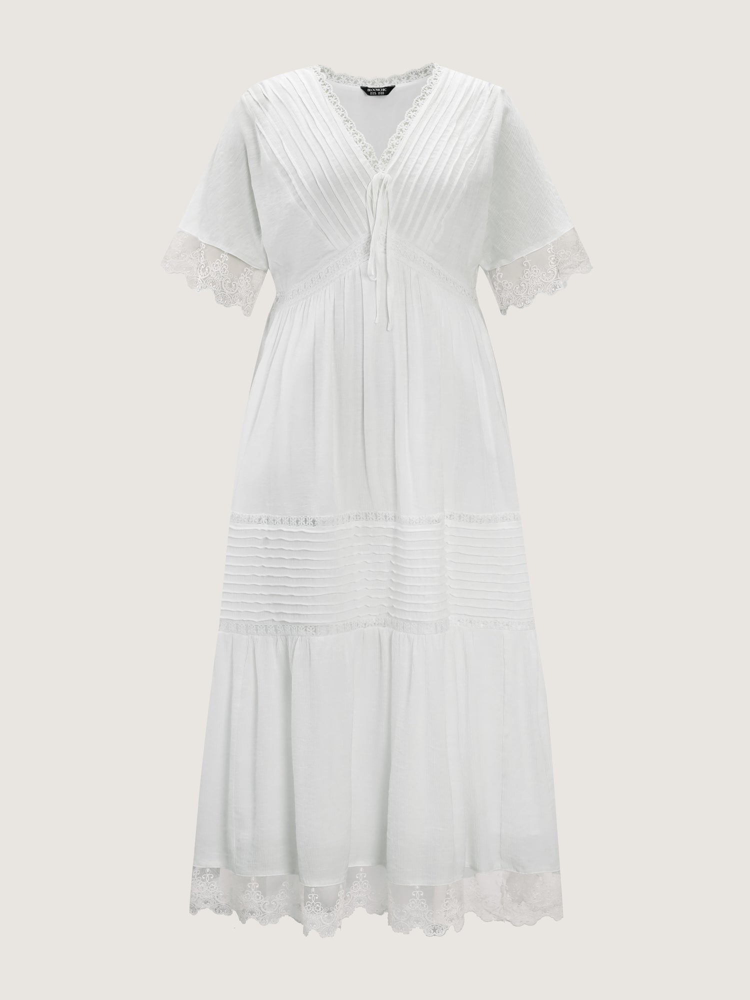 Shop Pleated Neckline Romantic Lace Ruffled Maxi Dress now and redefine your style with confidence at BloomChic. Tailored for mid and plus-size women. This trendy Dress, sizes 10-30. You can never go wrong with BloomChic Dresses. Color:Original White;Style:Romantic;Neckline:Deep V-neck;Sleeve Type:Raglan sleeve;Prints:Synthetic texture;Details:See through, Texture, Gathered, Patchwork, Pleated;Pocket:Side seam pocket;Belt:No-belt;Closure Type:Non