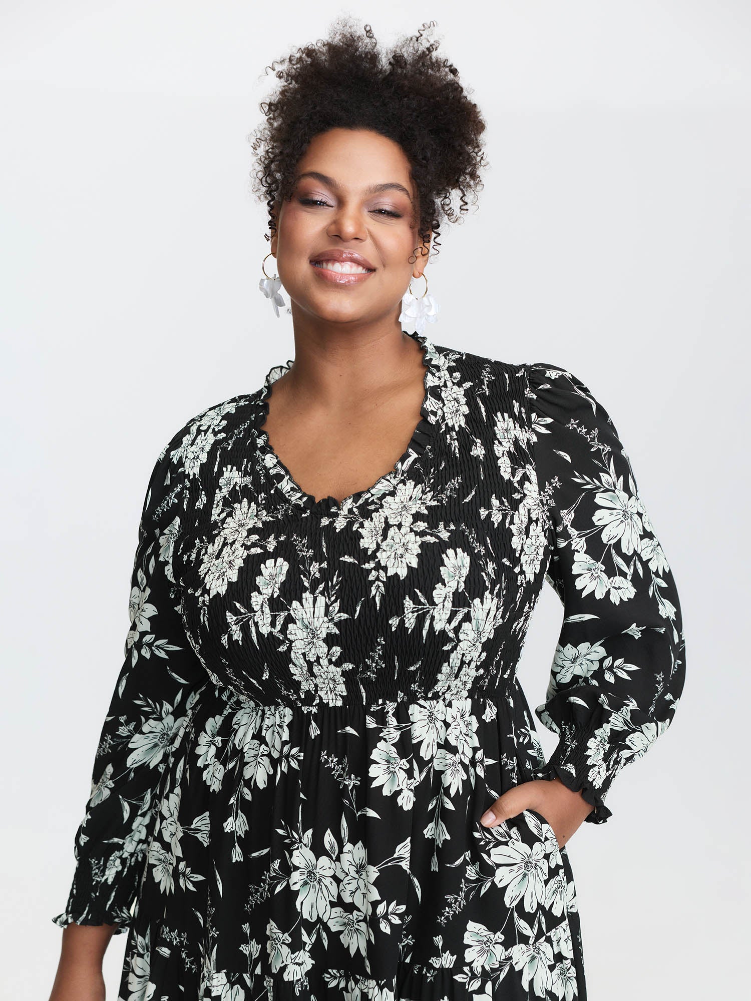 Shop Silhouette Flower Shirred Maxi Dress now and redefine your style with confidence at BloomChic. Tailored for mid and plus-size women. This trendy Dress, sizes 10-30. You can never go wrong with BloomChic Dresses. Color:Black;Style:Romantic;Neckline:V-neck;Sleeve Type:Elastic cuff;Prints:Floral;Details:Shirred, Contrast;Pocket:Side seam pocket;Belt:No-belt;Closure Type:Button