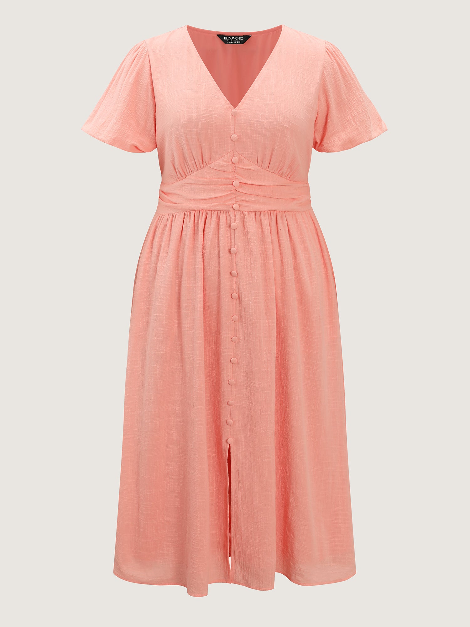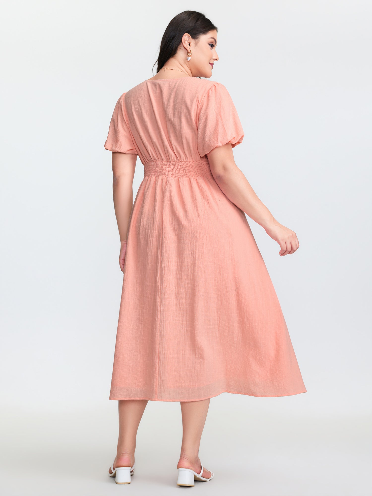 Shop Textured Pleated Waist Placket Button Maxi Dress now and redefine your style with confidence at BloomChic. Tailored for mid and plus-size women. This trendy Dress, sizes 10-30. You can never go wrong with BloomChic Dresses. Color:Crepe;Style:Timeless;Neckline:Deep V-neck;Sleeve Type:Puff Sleeve;Prints:Synthetic texture;Details:Gathered, Button, Shirred;Pocket:Side seam pocket;Belt:No-belt;Closure Type:Non