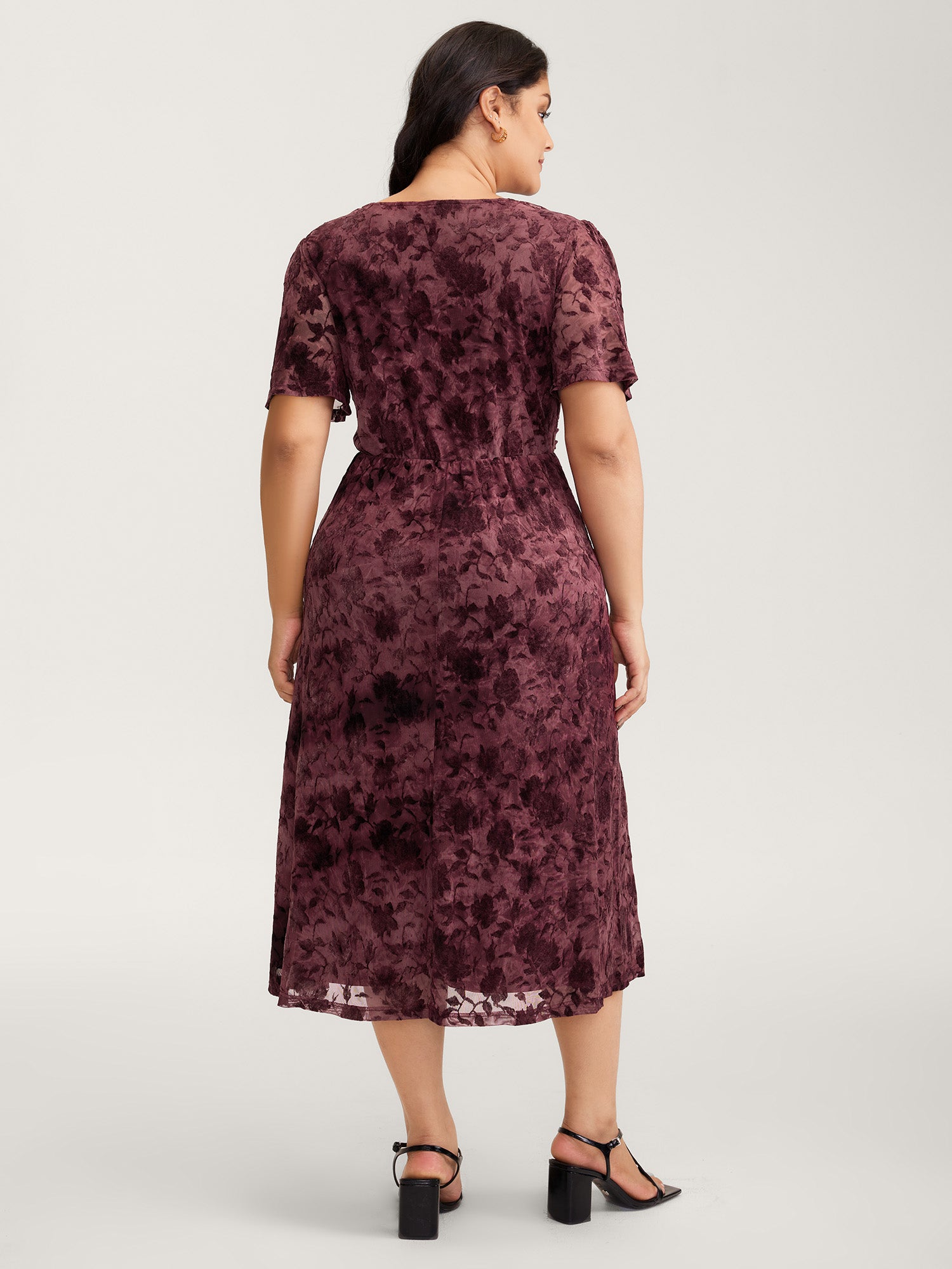Velvet Jacquard Pleated Waist Sheer Midi Dress
