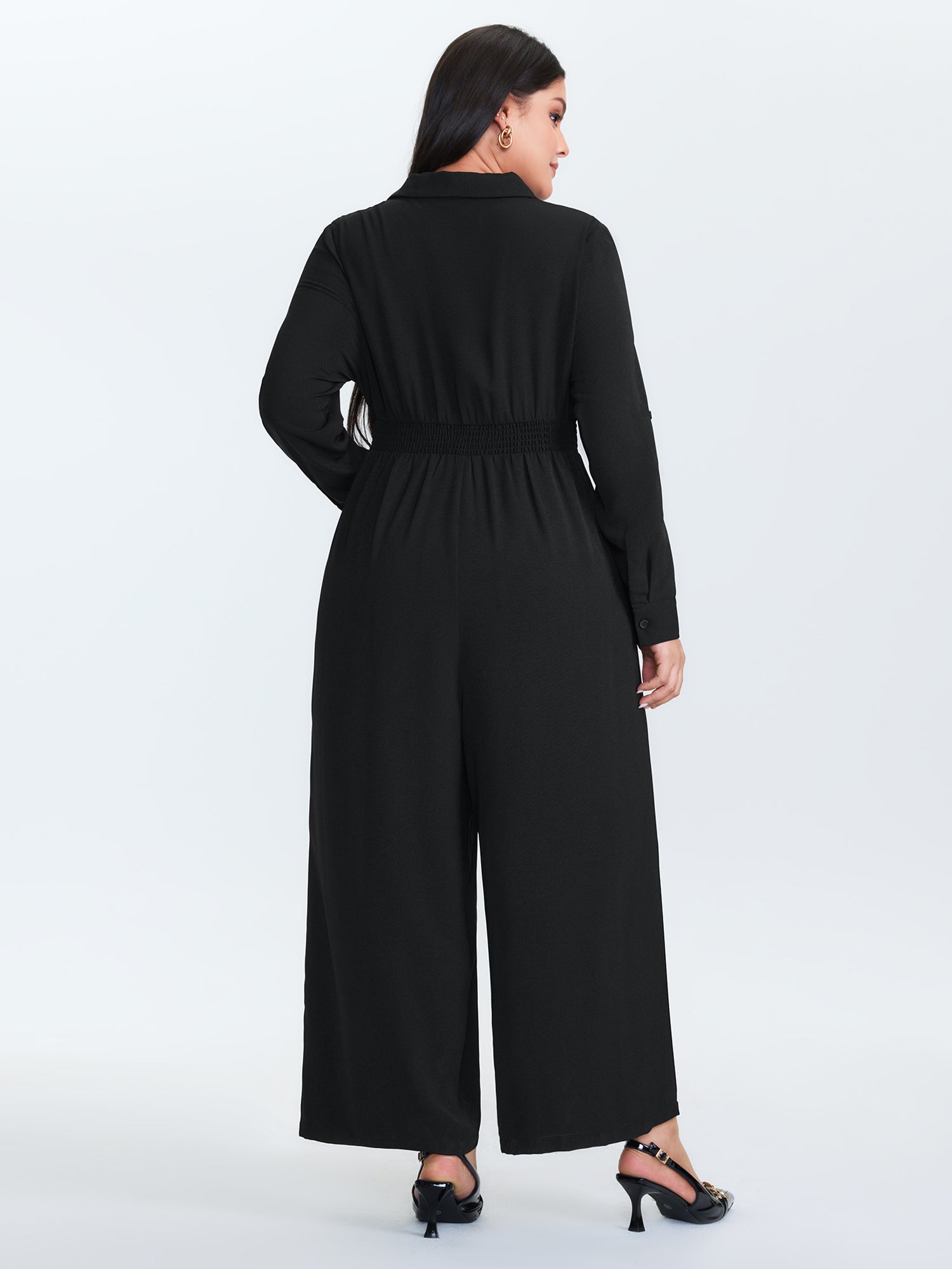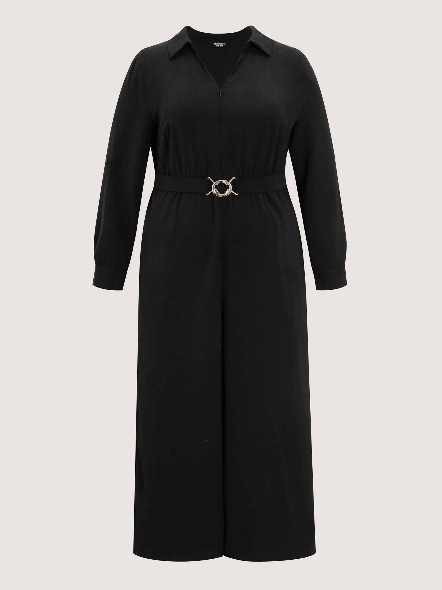 Shop Belted Collar Stretchy Waist Jumpsuit now and redefine your style with confidence at BloomChic. Tailored for mid and plus-size women. This trendy Jumpsuits Women, sizes 10-30. Color:Black;Style:Office;Neckline:Shirt collar;Sleeve Type:Button cuff sleeve;Prints:Non;Pocket:Side seam pocket;Belt:Belt;Closure Type:Non