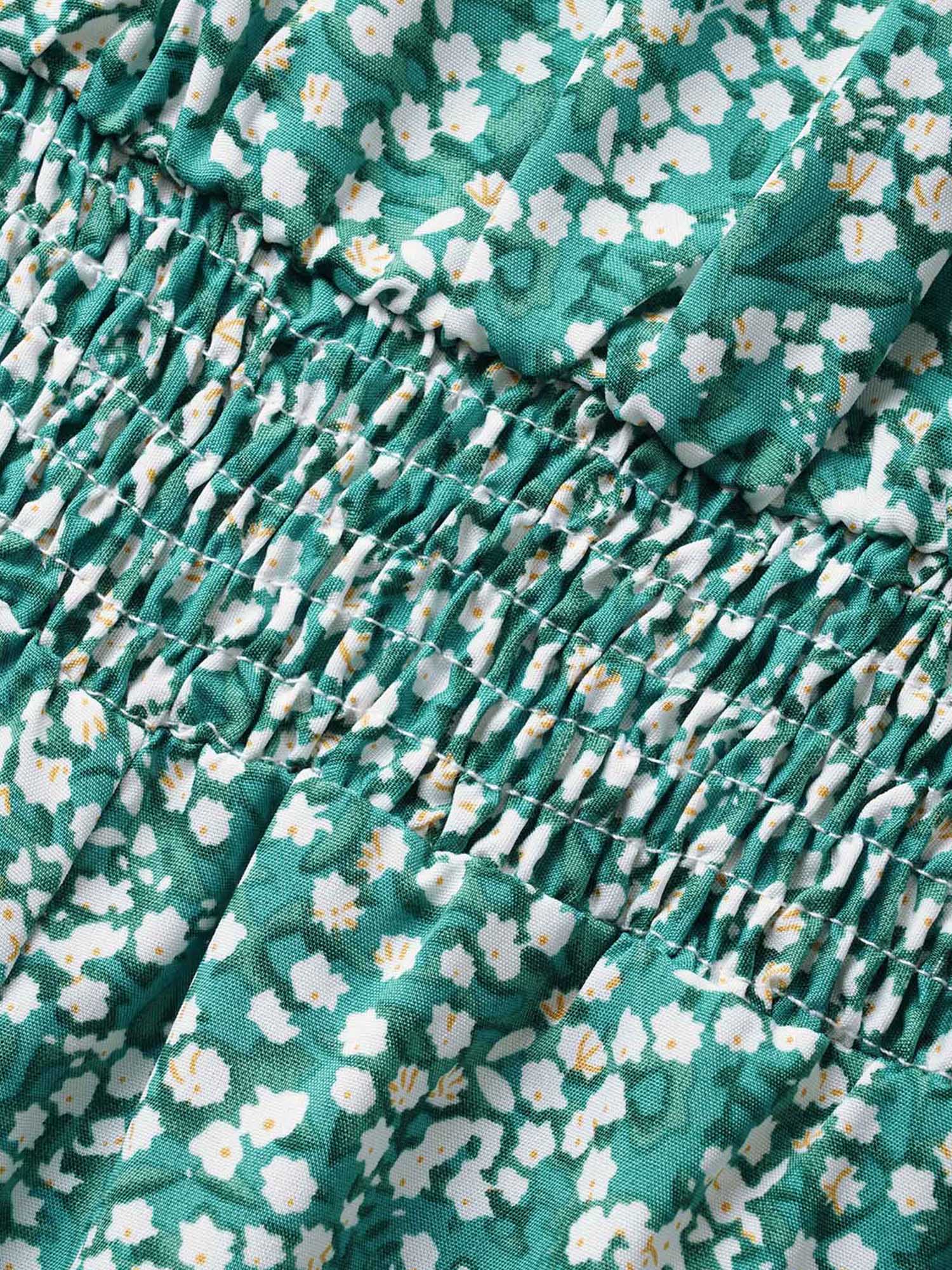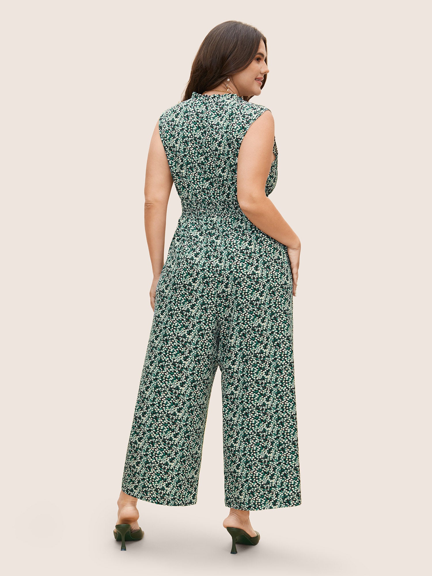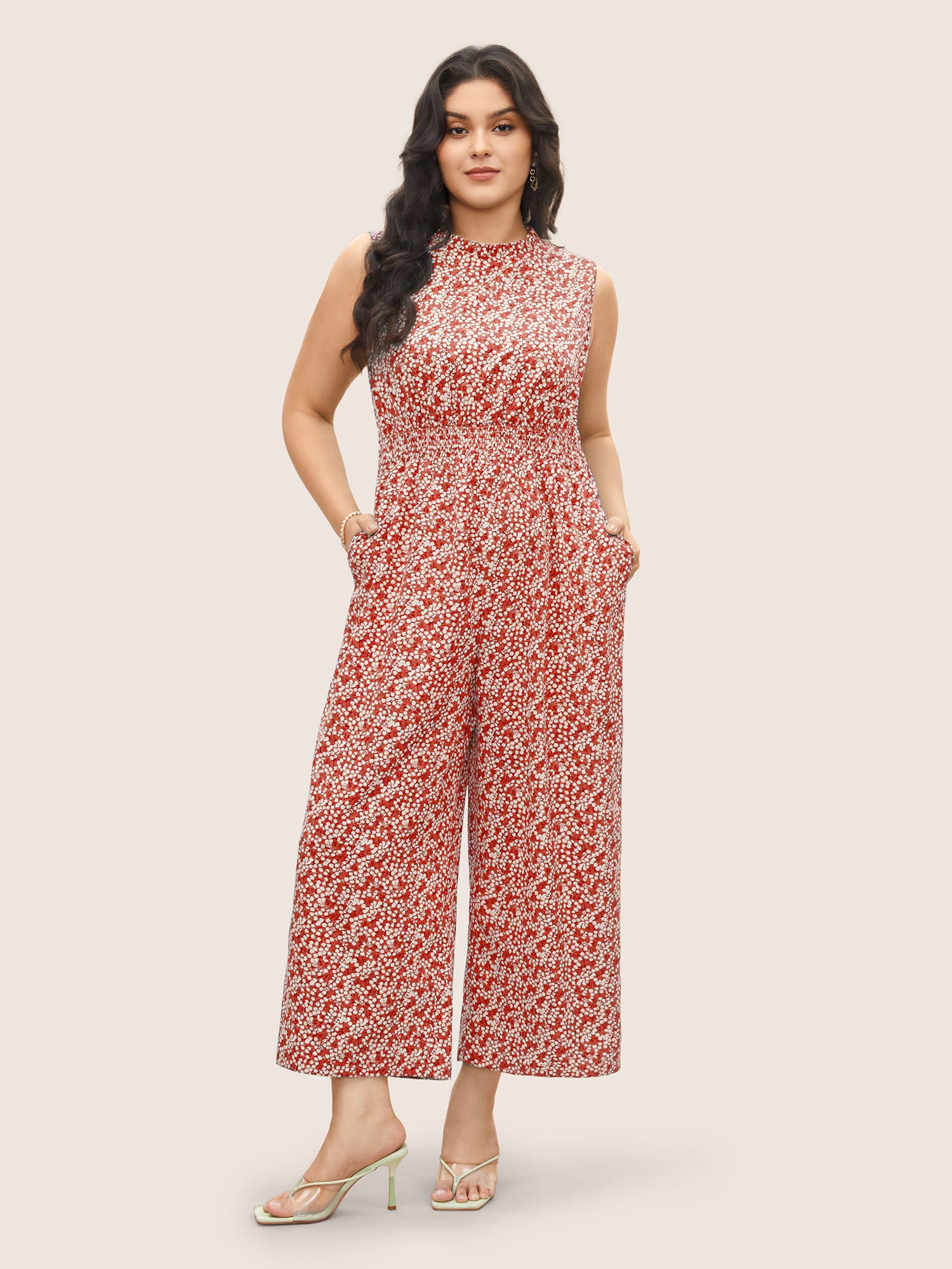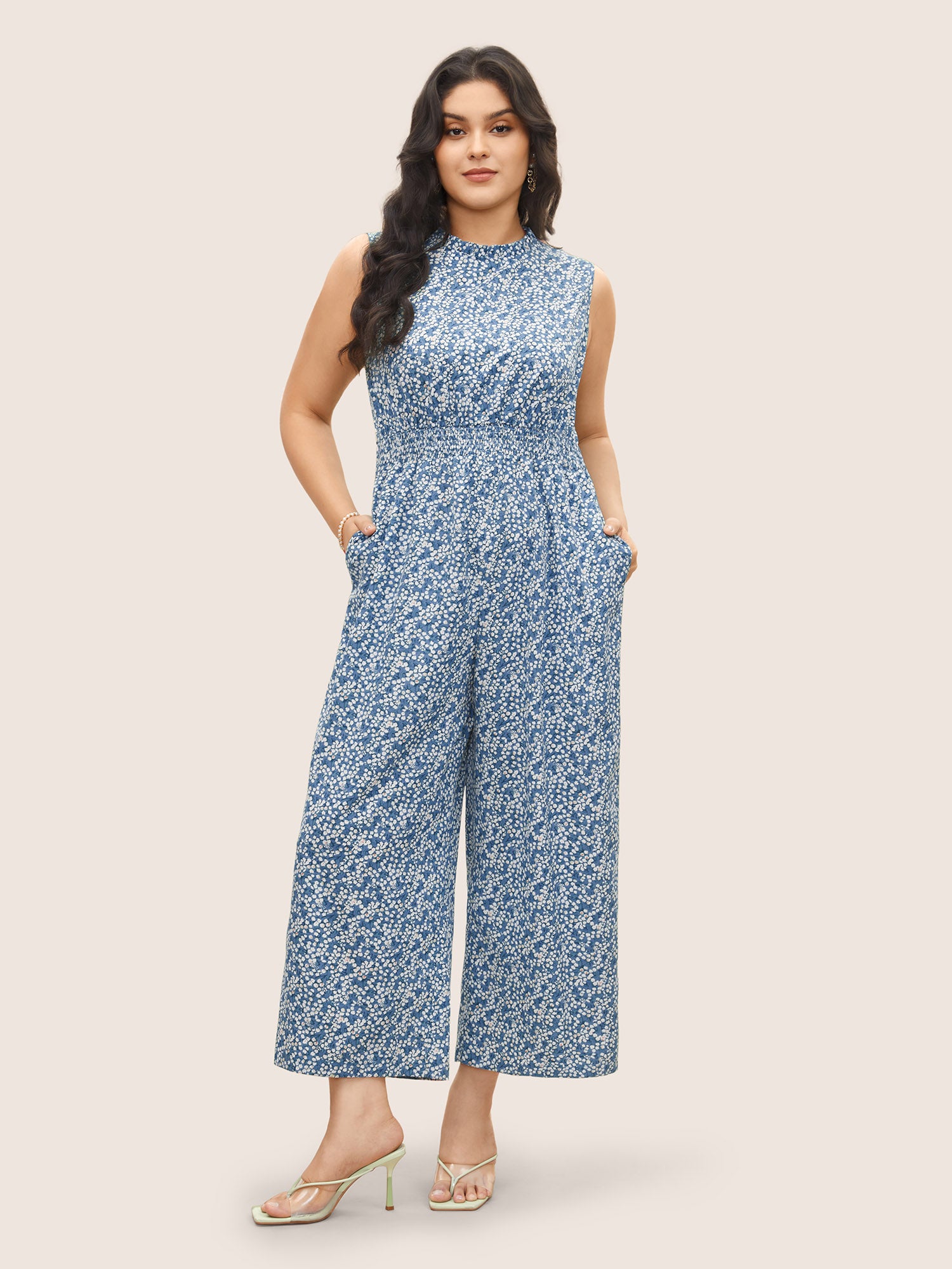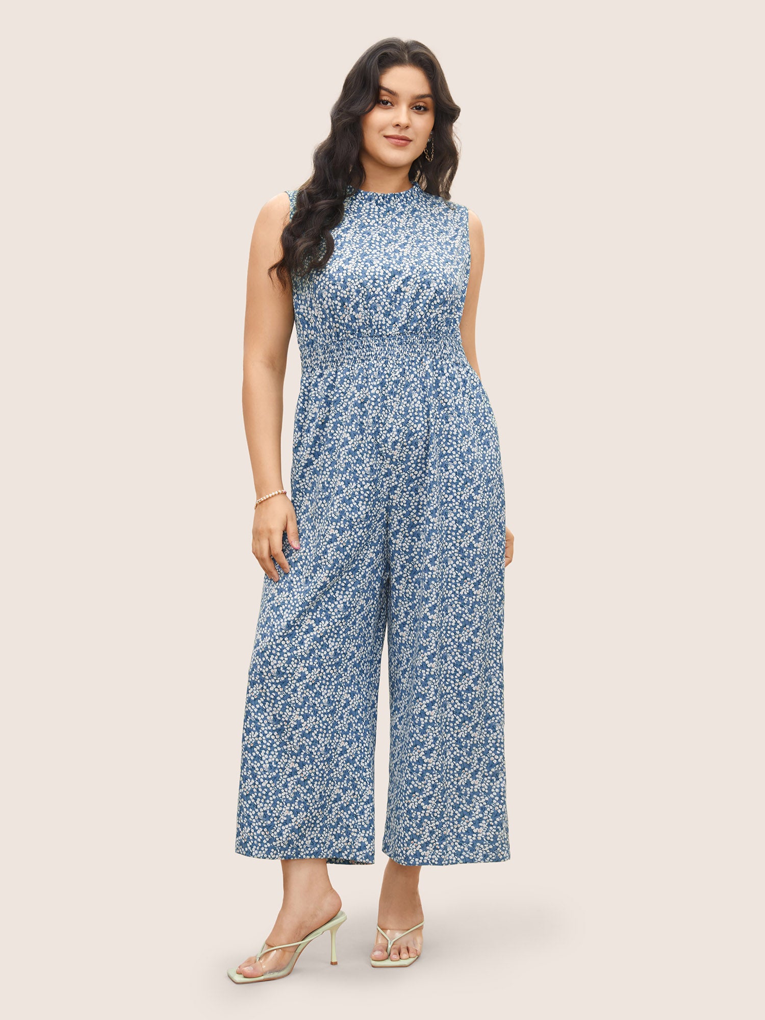 Ditsy Floral Mock Neck Shirred Jumpsuit