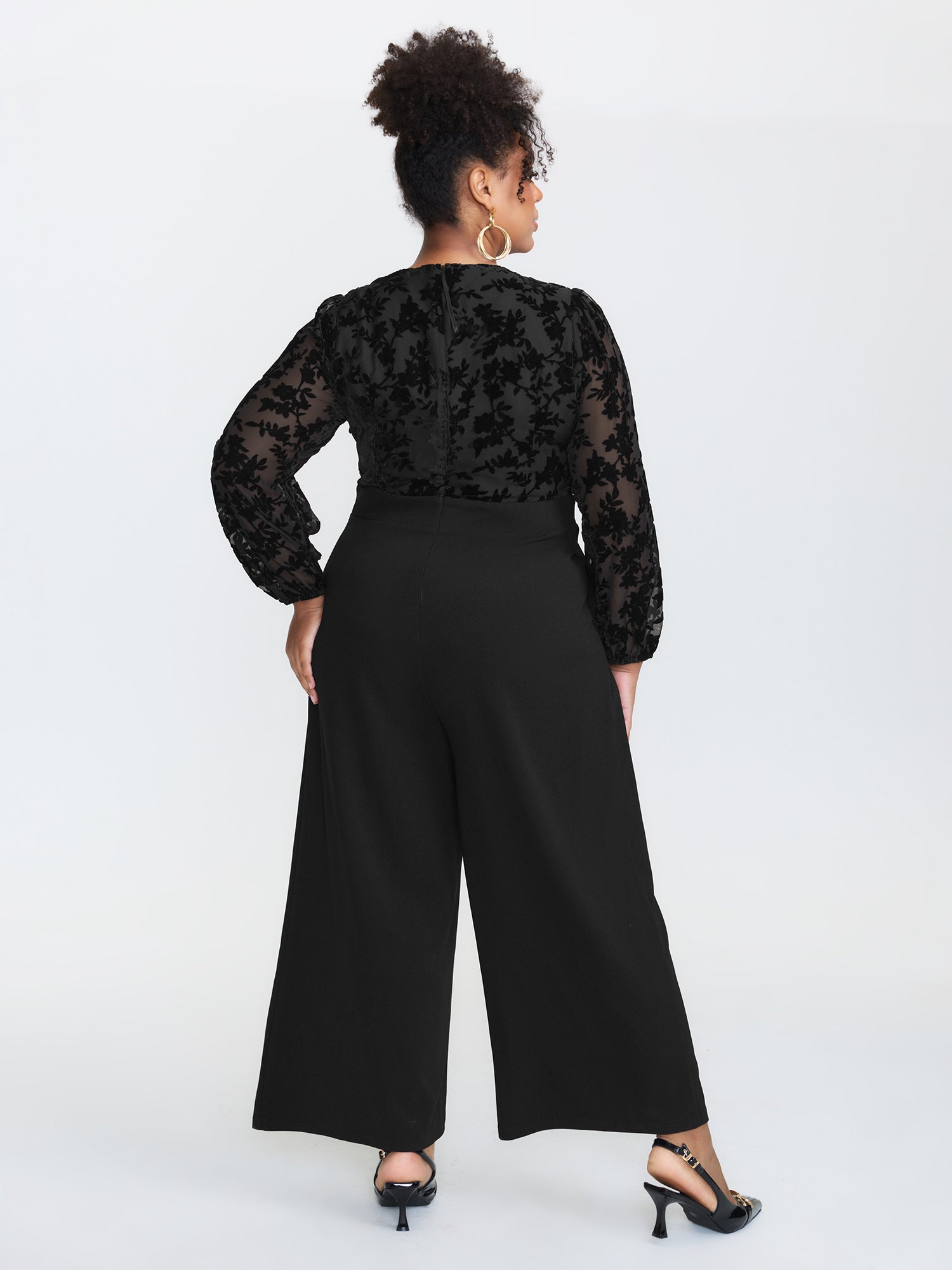 Shop Floral Mesh Sleeve Surplice Flared Jumpsuit now and redefine your style with confidence at BloomChic. Tailored for mid and plus-size women. This trendy Jumpsuits Women, sizes 10-30. Color:Black;Style:Romantic;Neckline:Overlap Collar;Sleeve Type:Elastic cuff;Prints:Floral;Details:Overlapping, See through, Texture, Patchwork;Pocket:Side seam pocket;Snap Fastener:Snap fastener;Belt:No-belt;Closure Type:Non