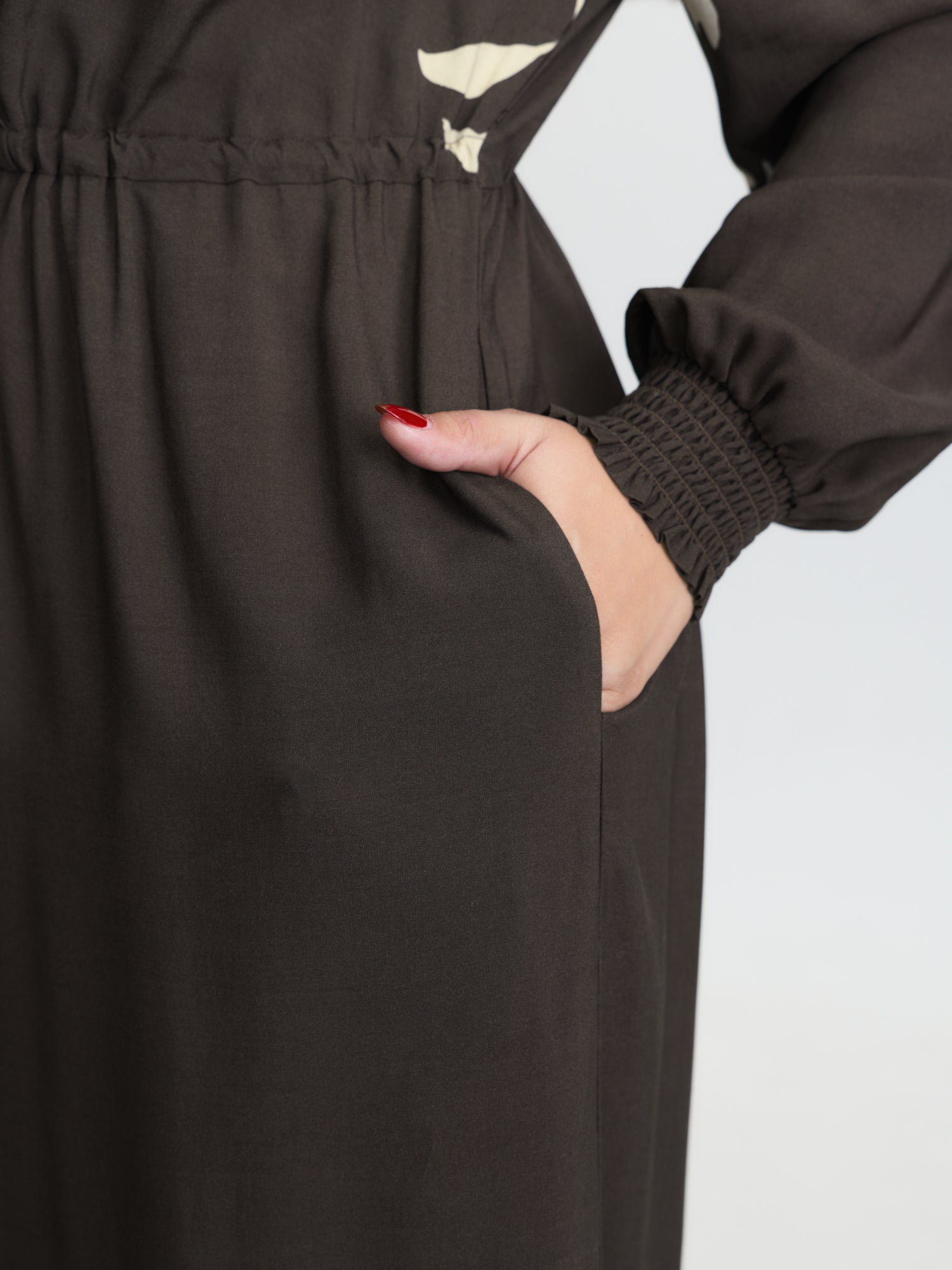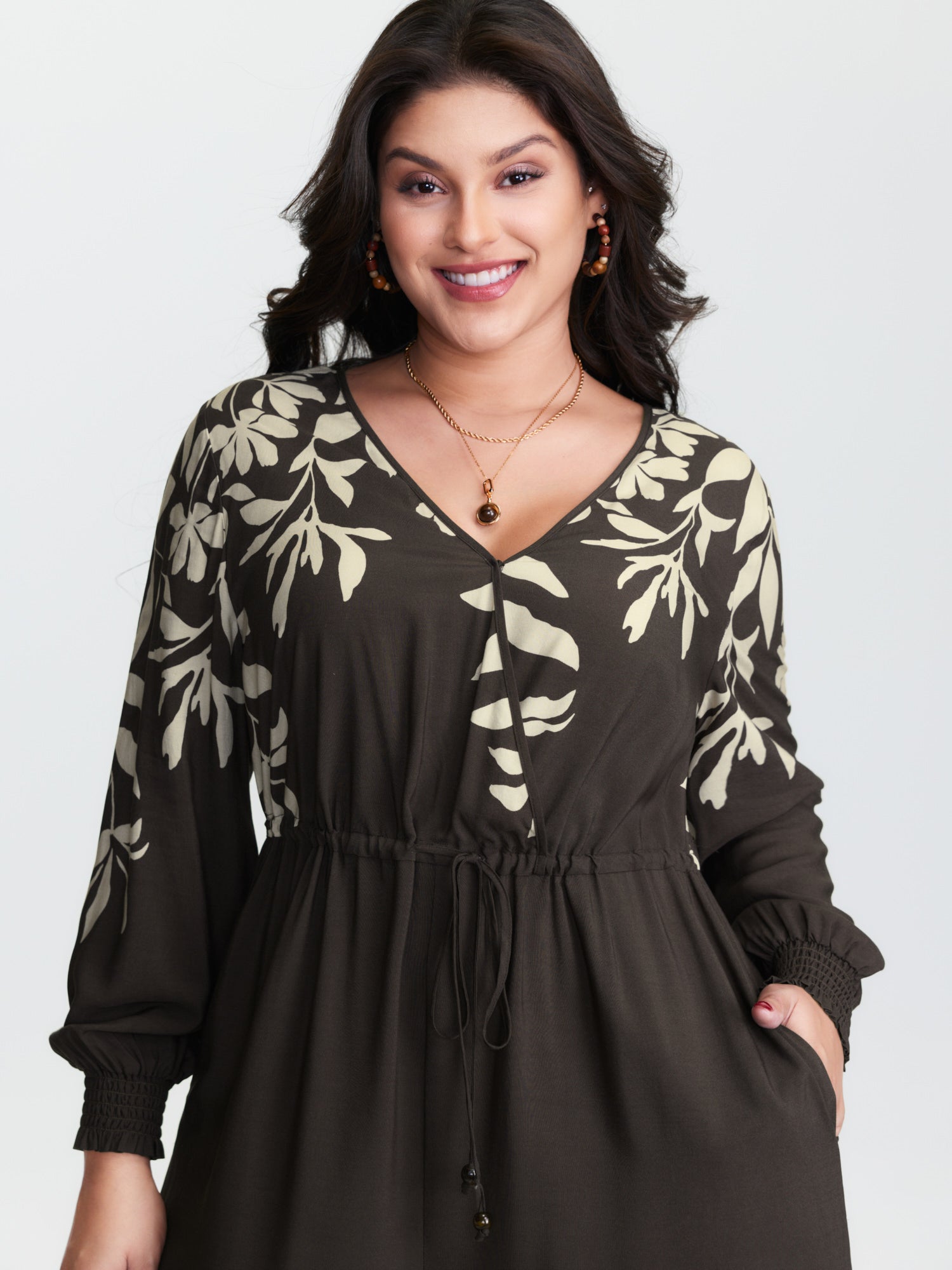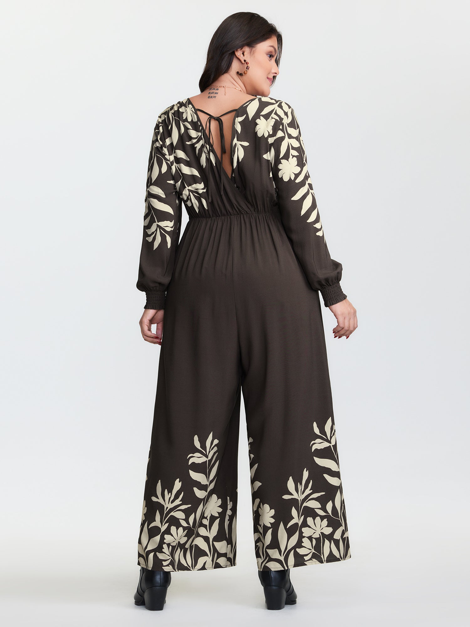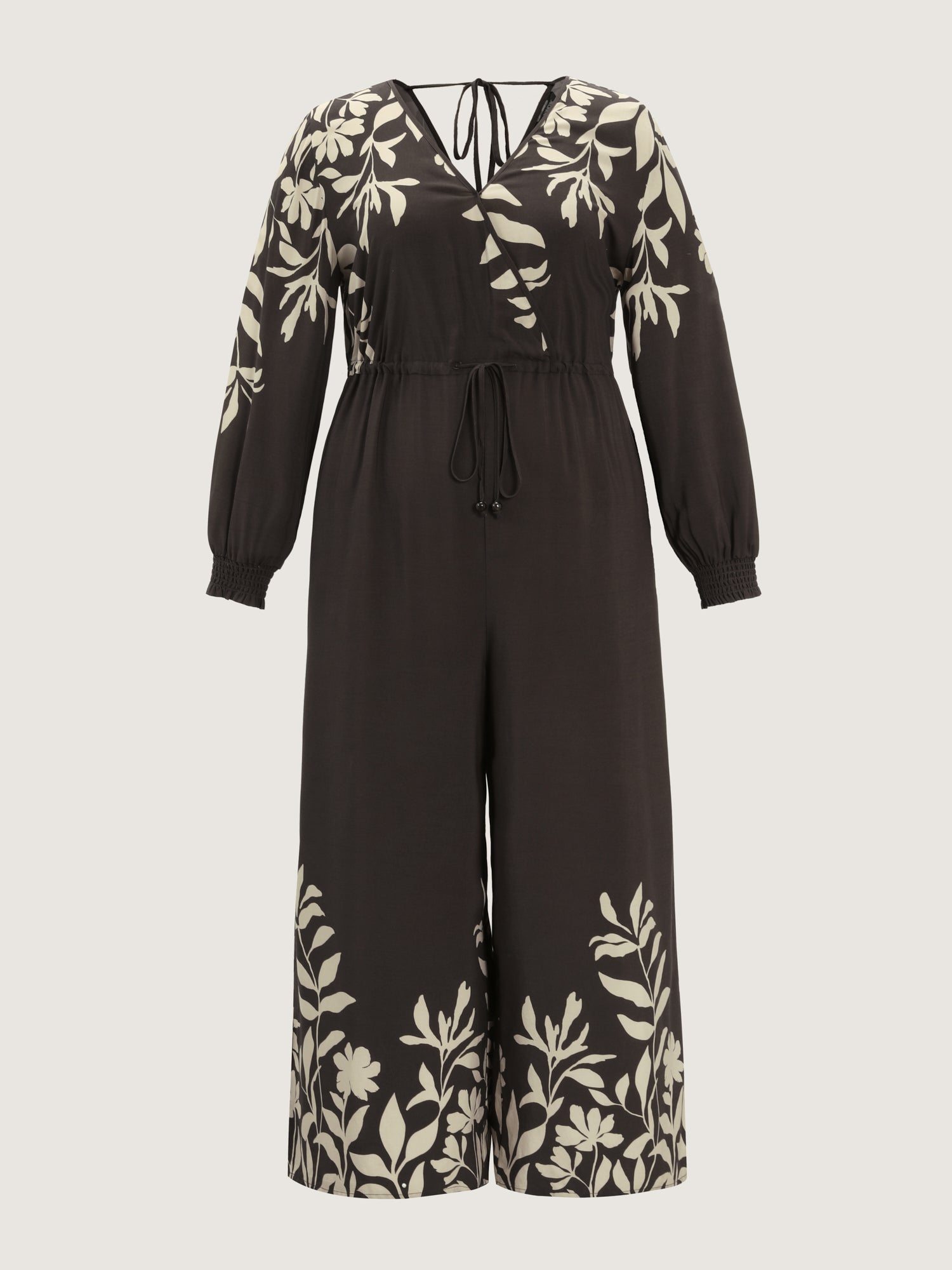 Shop Floral Print Shirred Drawstring Jumpsuit now and redefine your style with confidence at BloomChic. Tailored for mid and plus-size women. This trendy Jumpsuits Women, sizes 10-30. Color:Dark Brown;Style:Boho;Neckline:Overlap Collar;Sleeve Type:Elastic cuff;Prints:Floral;Pocket:Side seam pocket;Belt:Belt;Closure Type:Non