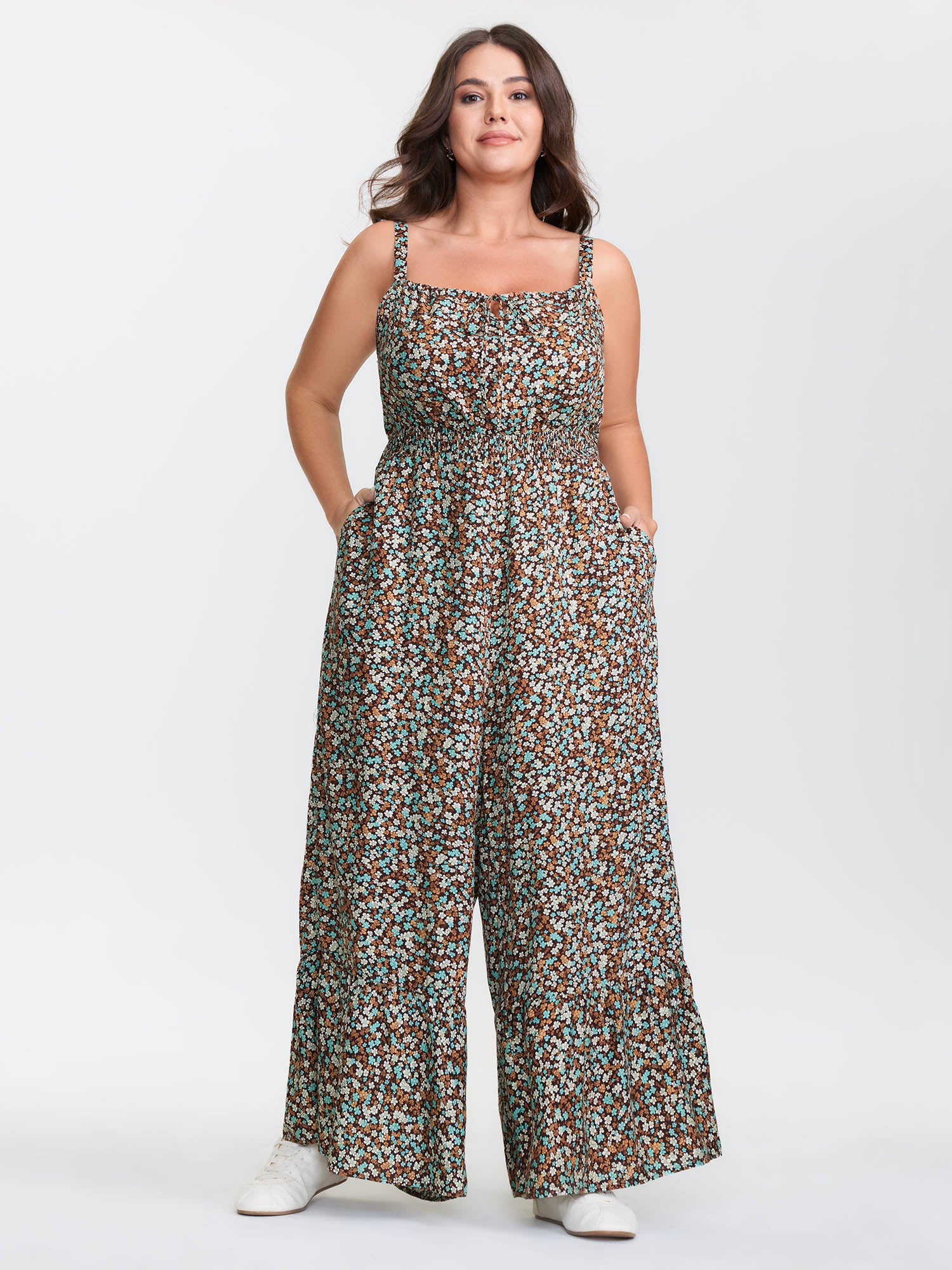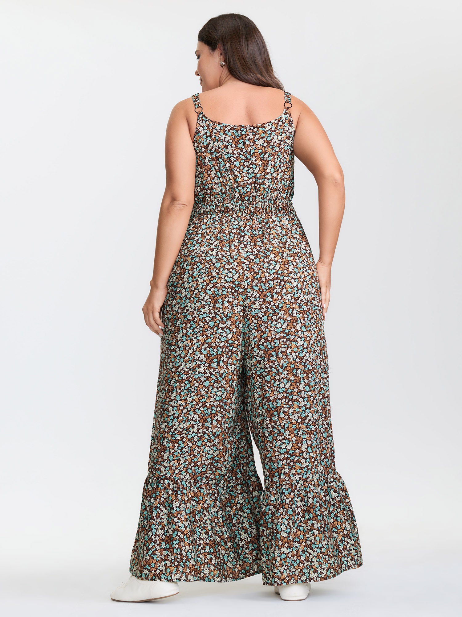 Shop Supersoft Micro-Floral Print Ruffled Jumpsuit now and redefine your style with confidence at BloomChic. Tailored for mid and plus-size women. This trendy Jumpsuits Women, sizes 10-30. Color:Brown Coffee;Style:Leisure;Neckline:Non;Sleeve Type:Sleeveless;Prints:Ditsy floral;Details:Tie knot, Shirred;Pocket:Side seam pocket;Belt:No-belt;Closure Type:Non
