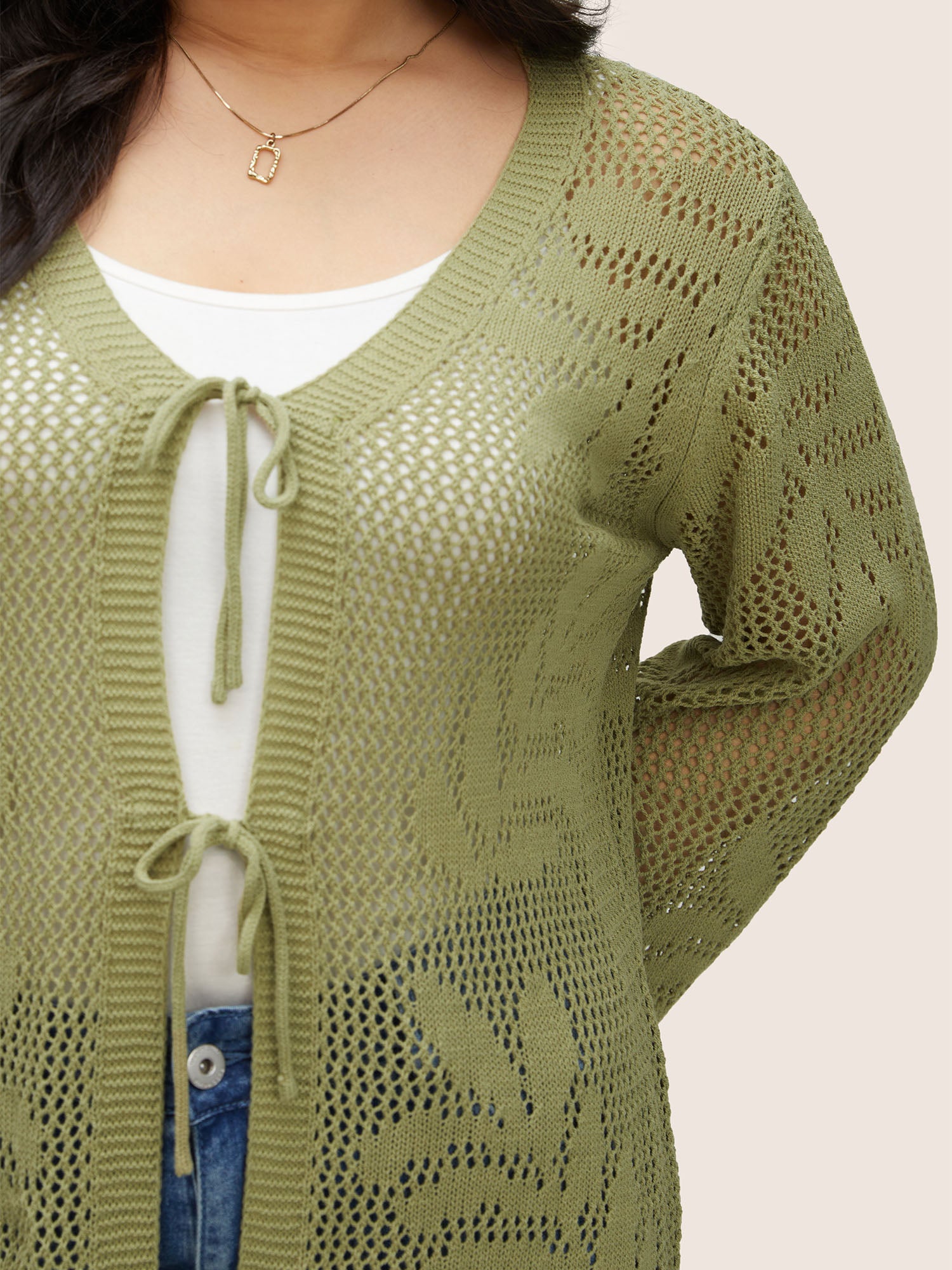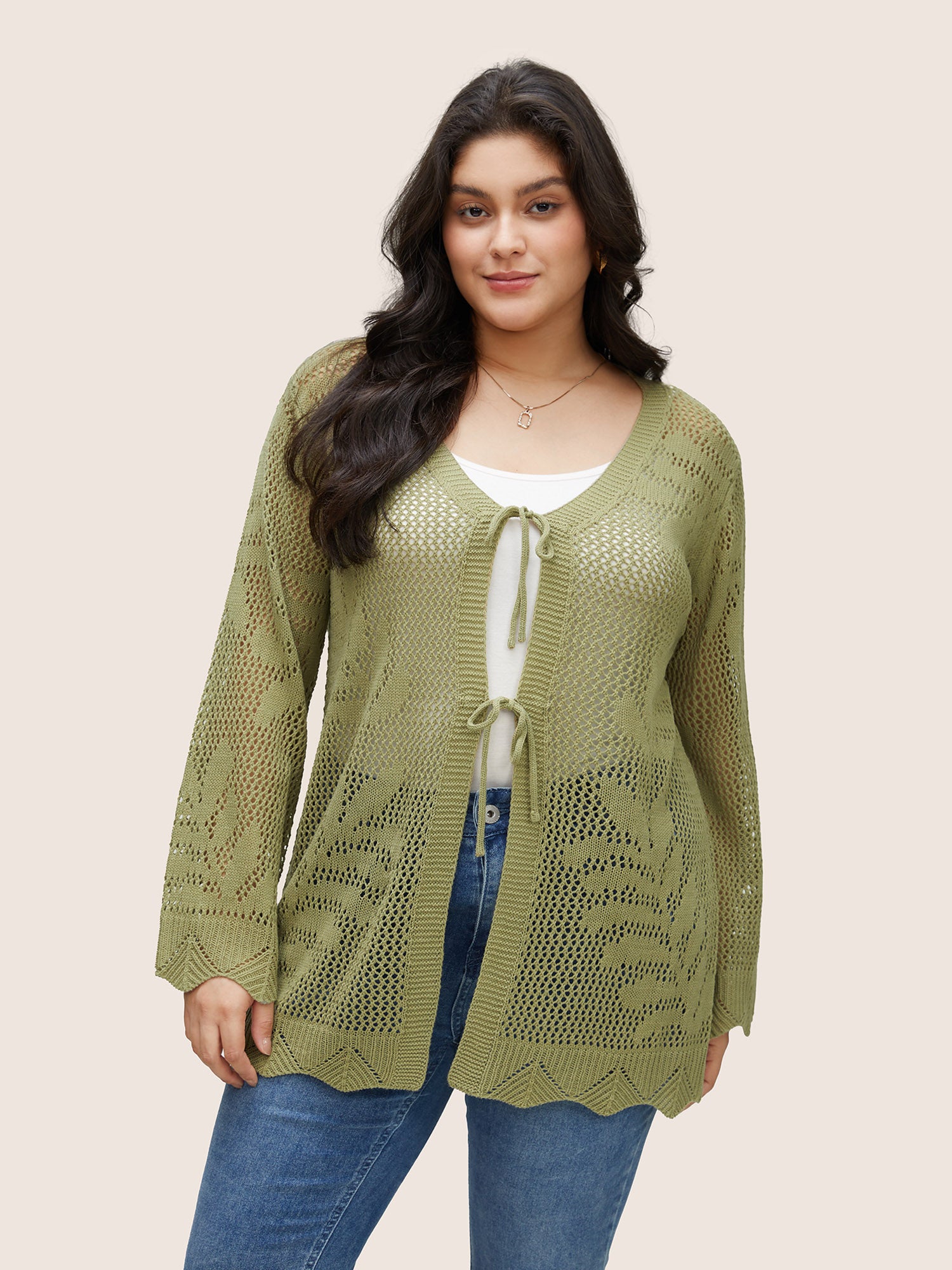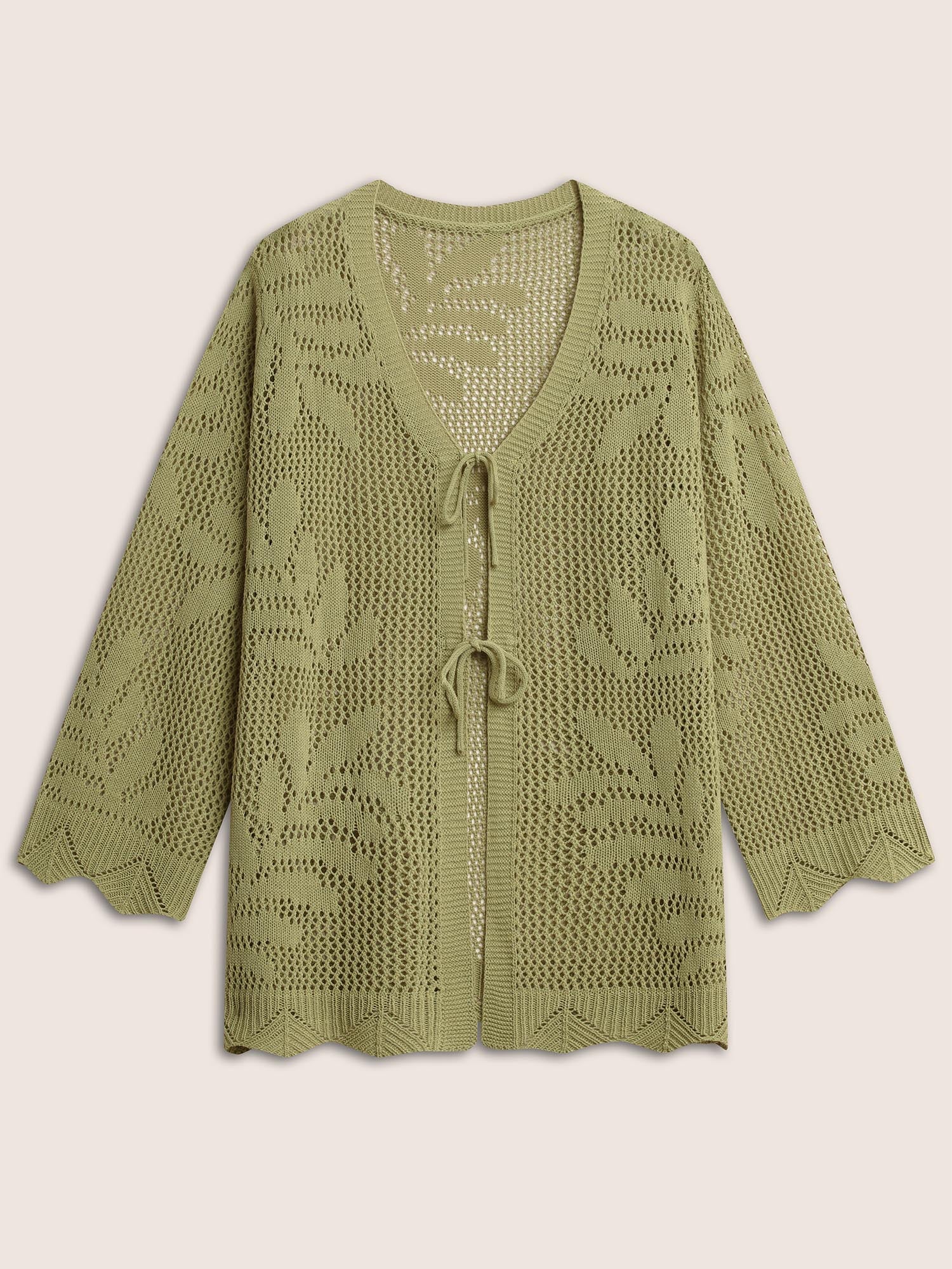 Shop Plants Hollow Out Ties Scalloped Trim Cardigan now and redefine your style with confidence at BloomChic. Tailored for mid and plus-size women. This trendy Outerwear Women, sizes 10-30. Season:Spring;Color:YellowGreen;Neckline:Kimono collar;Sleeve Type:Bell Sleeve;Pattern Type:Plants, Plain;Pocket:No-pocket;Belt:No-belt