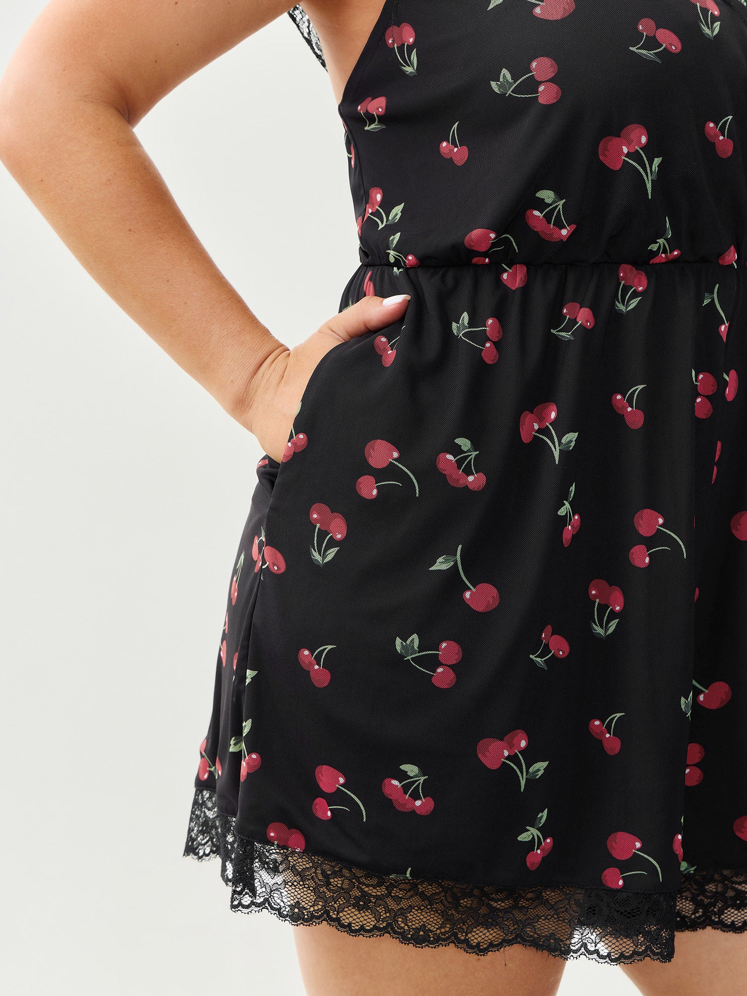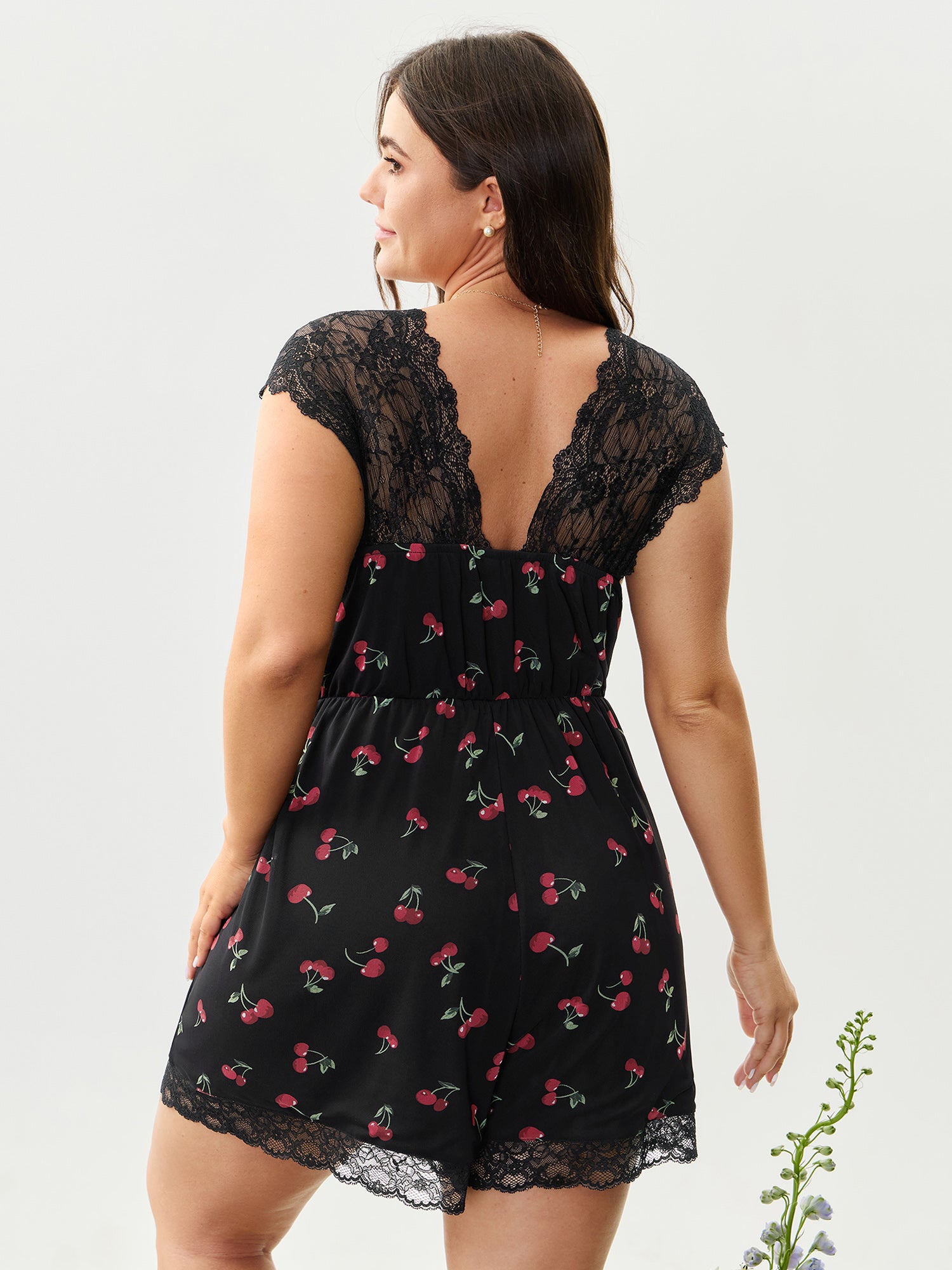Shop Cherry Romance Lace Sleeve Lounge Romper now and redefine your style with confidence at BloomChic. Tailored for mid and plus-size women. This trendy Loungewear Women, sizes 10-30. Color:Black;Style:Romantic;Neckline:V-neck;Sleeve Type:Cap sleeve;Prints:Fruit and vegetable print;Details:Texture, See through, Gathered, Contrast, Overlapping;Pocket:Side seam pocket;Belt:No-belt;Closure Type:Non