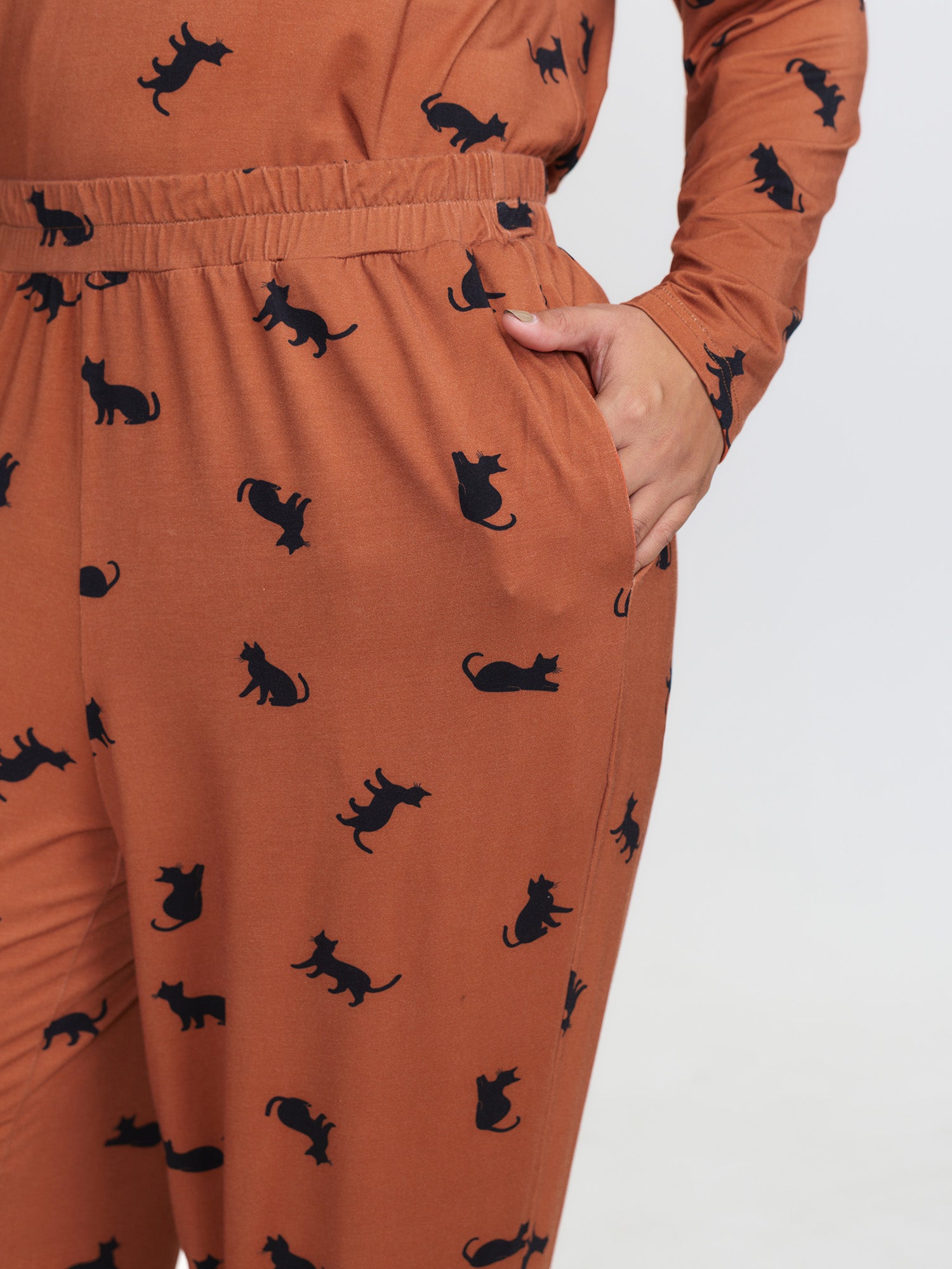 Shop Midnight Cat Print Stretchy Lounge Bottoms now and redefine your style with confidence at BloomChic. Tailored for mid and plus-size women. This trendy Loungewear Women, sizes 10-30. Color:Yellowishbrown;Style:Playful;Neckline:Non;Sleeve Type:Sleeveless;Pattern Type:Animals;Prints:Non;Pocket:Side seam pocket;Belt:No-belt;Closure Type:Non