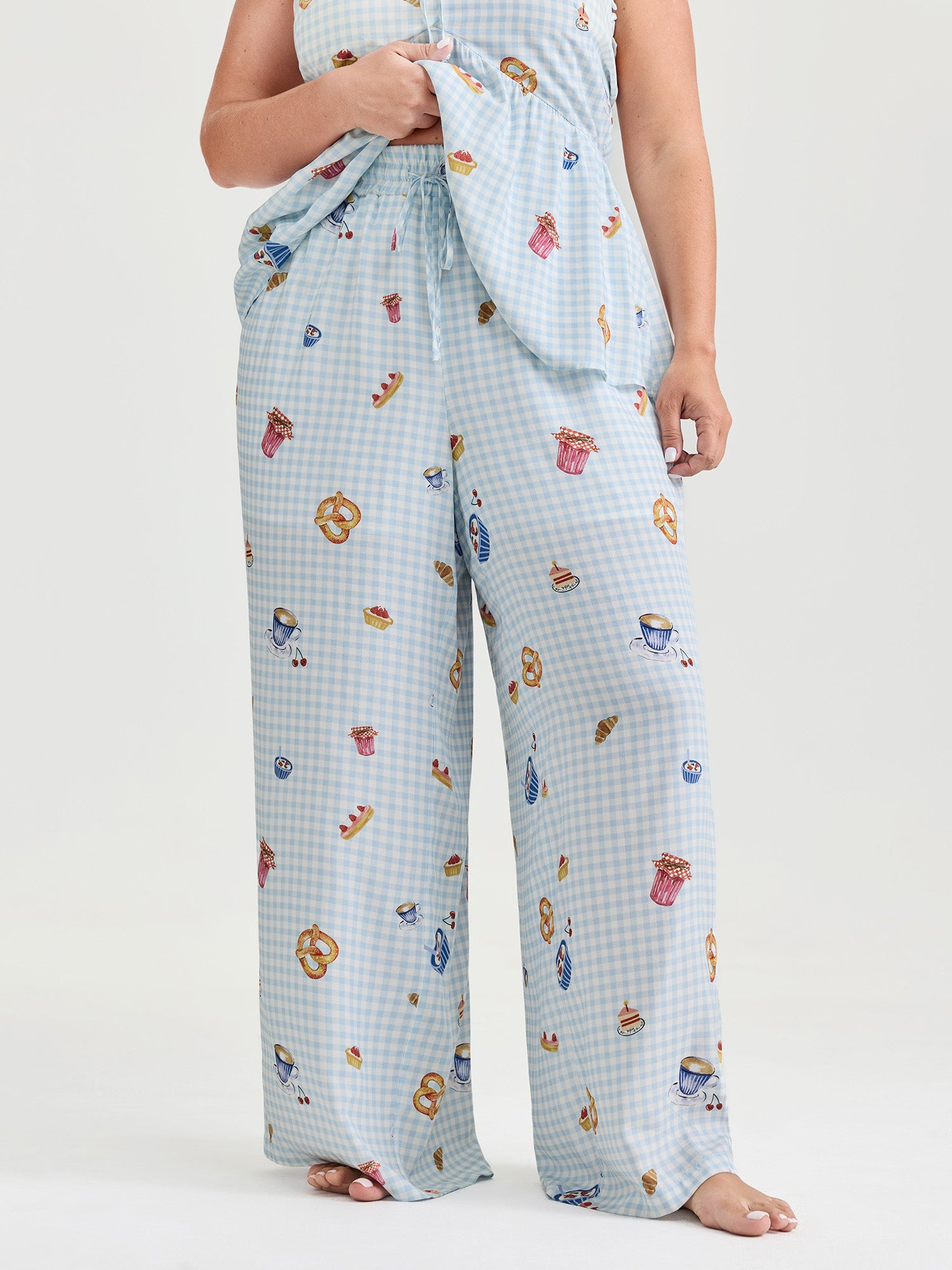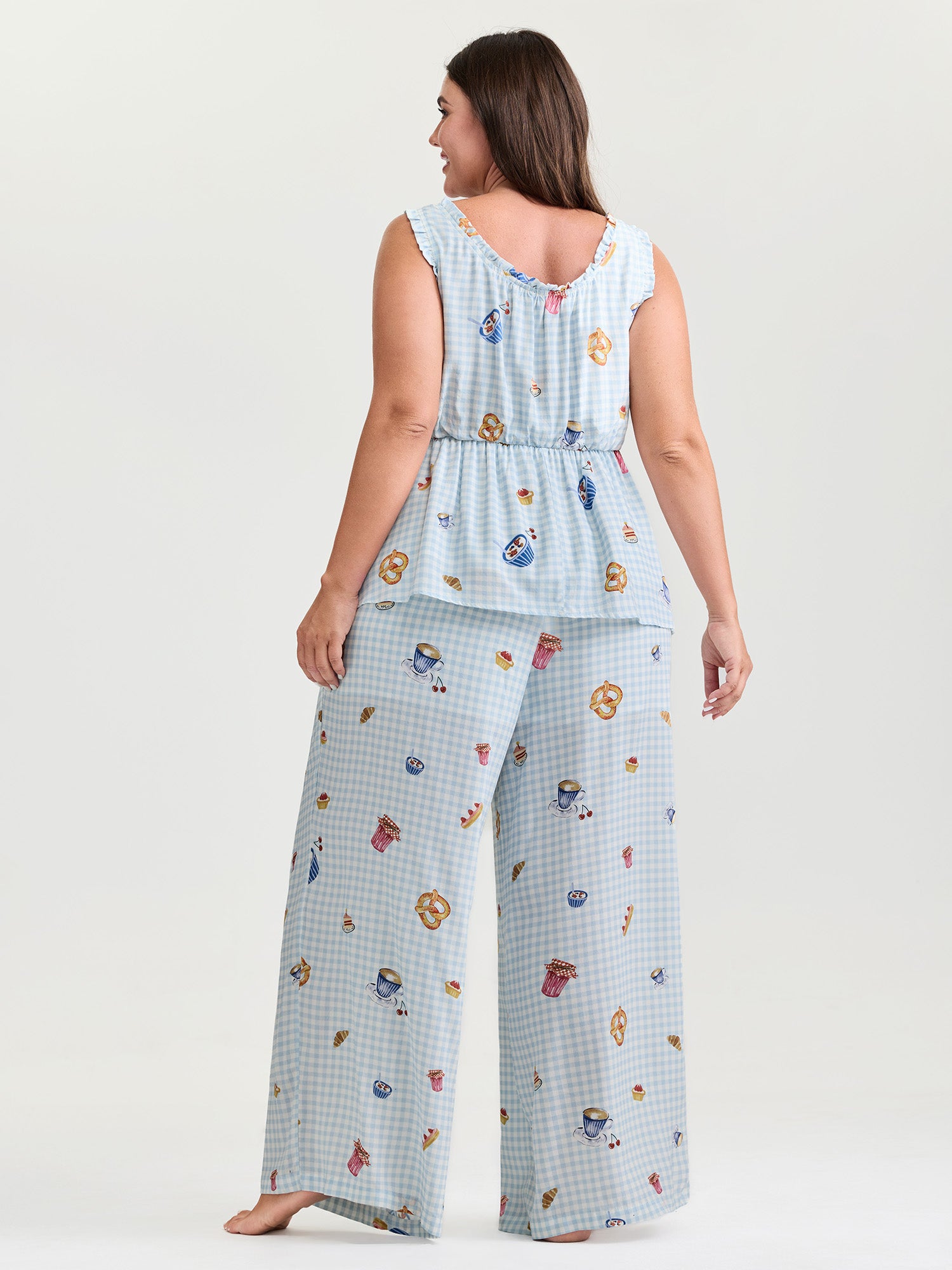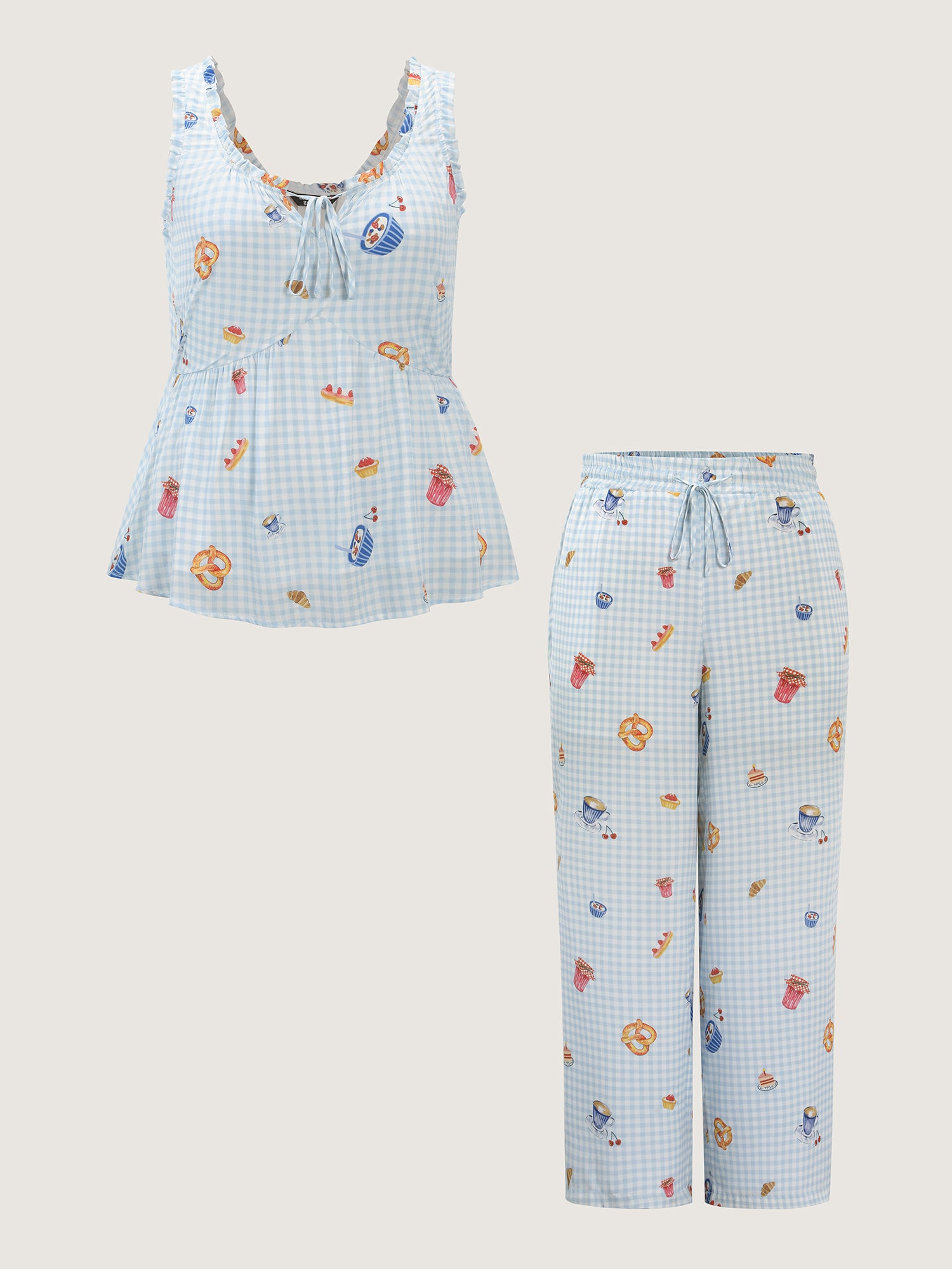 Shop Pretzel Coffee Print Drawstring Lounge Set now and redefine your style with confidence at BloomChic. Tailored for mid and plus-size women. This trendy Loungewear Women, sizes 10-30. Color:Light Blue;Style_2:Playful;Neckline:U-neck;Sleeve Type:Sleeveless;Pattern Type:Fruit;Pattern:Plaid;Details:Gathered, Tie knot, Ruffles;Pocket:Side seam pocket;Belt:No-belt;Closure Type:Non