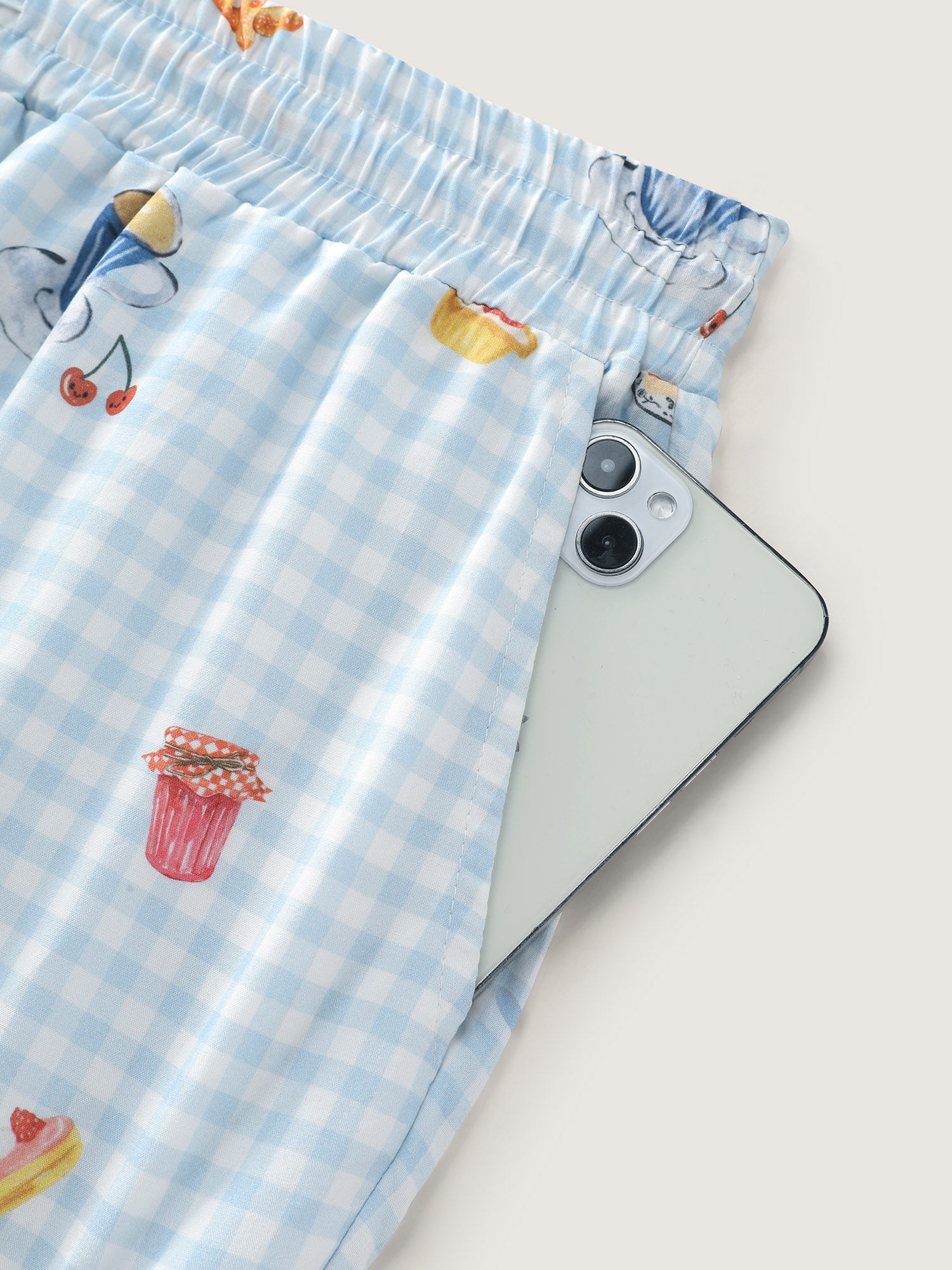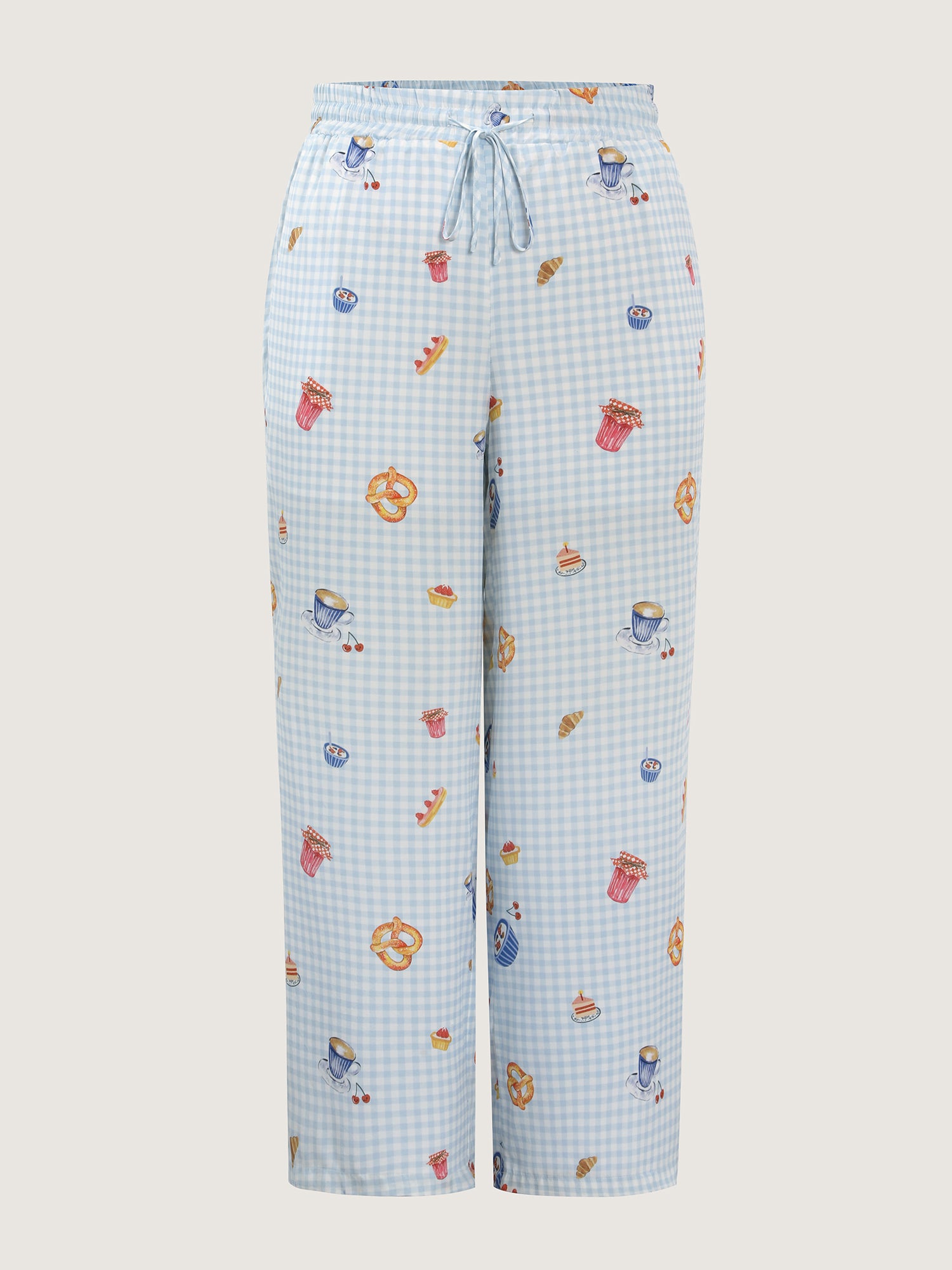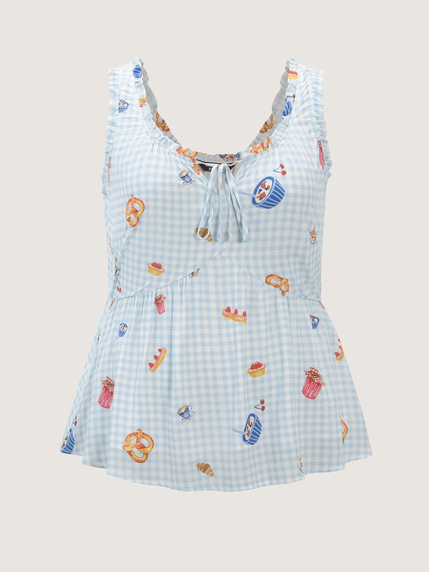 Shop Pretzel Coffee Print Drawstring Lounge Set now and redefine your style with confidence at BloomChic. Tailored for mid and plus-size women. This trendy Loungewear Women, sizes 10-30. Color:Light Blue;Style_2:Playful;Neckline:U-neck;Sleeve Type:Sleeveless;Pattern Type:Fruit;Pattern:Plaid;Details:Gathered, Tie knot, Ruffles;Pocket:Side seam pocket;Belt:No-belt;Closure Type:Non