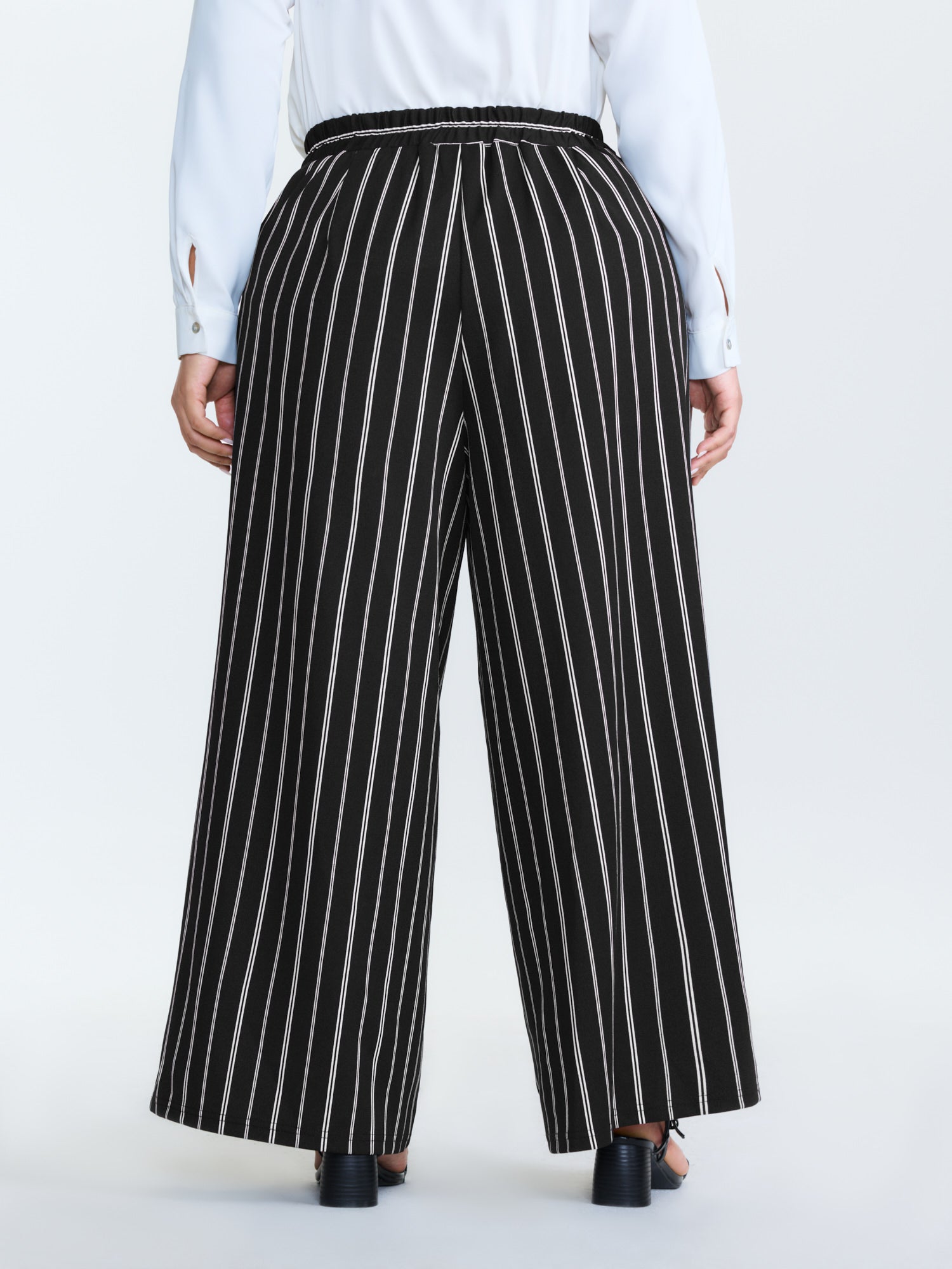 Shop Monochrome Stripe Print Wide-Leg Pants now and redefine your style with confidence at BloomChic. Tailored for mid and plus-size women. This trendy Bottoms Women, sizes 10-30. Color:Black;Style_2:Office;Waist Design:High Rise;Prints:Stripes;Pocket:Slanted pocket;Belt:No-belt;Closure Type:Non