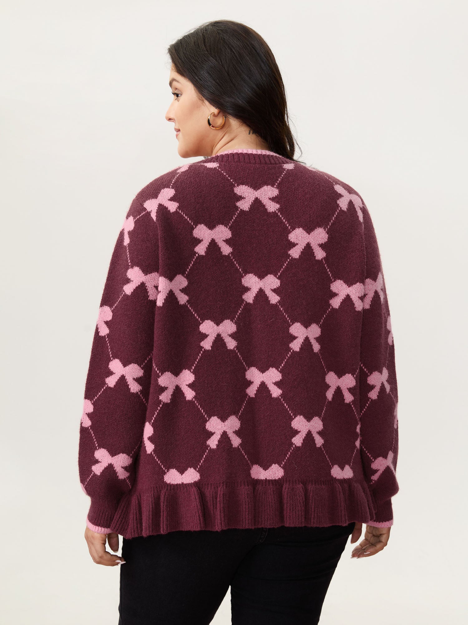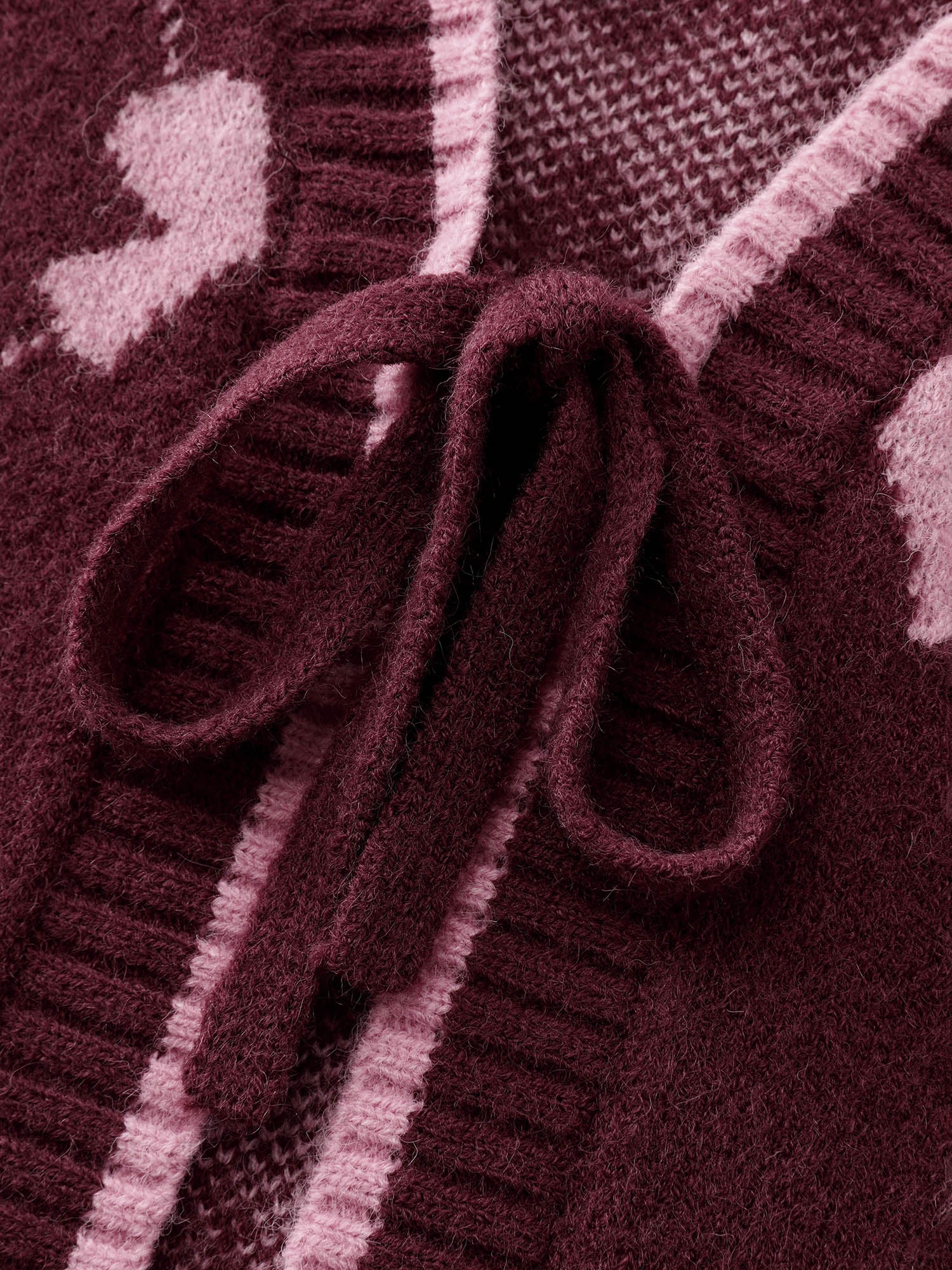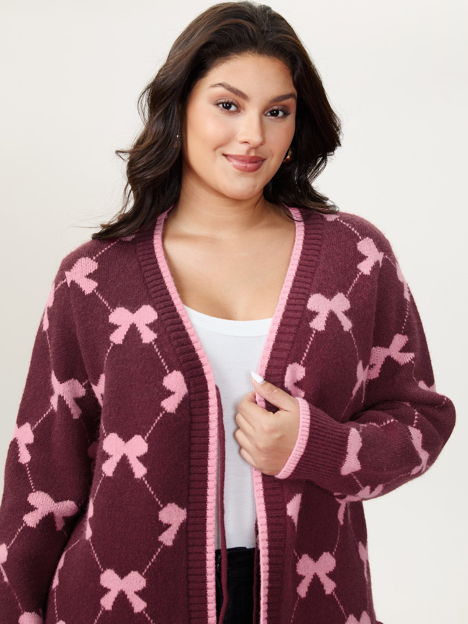 Shop Bow Beautiful Jacquard Front-Tie Knit Cardigan now and redefine your style with confidence at BloomChic. Tailored for mid and plus-size women. This trendy Sweaters Cardigans Women, sizes 10-30. Color:Burgundy;Style:Playful;Neckline:Deep V-neck;Sleeve Type:Drop shoulder sleeve;Prints:Geometric & color block;Details:Contrast;Pocket:No-pocket;Belt:No-belt;Closure Type:Tie belt