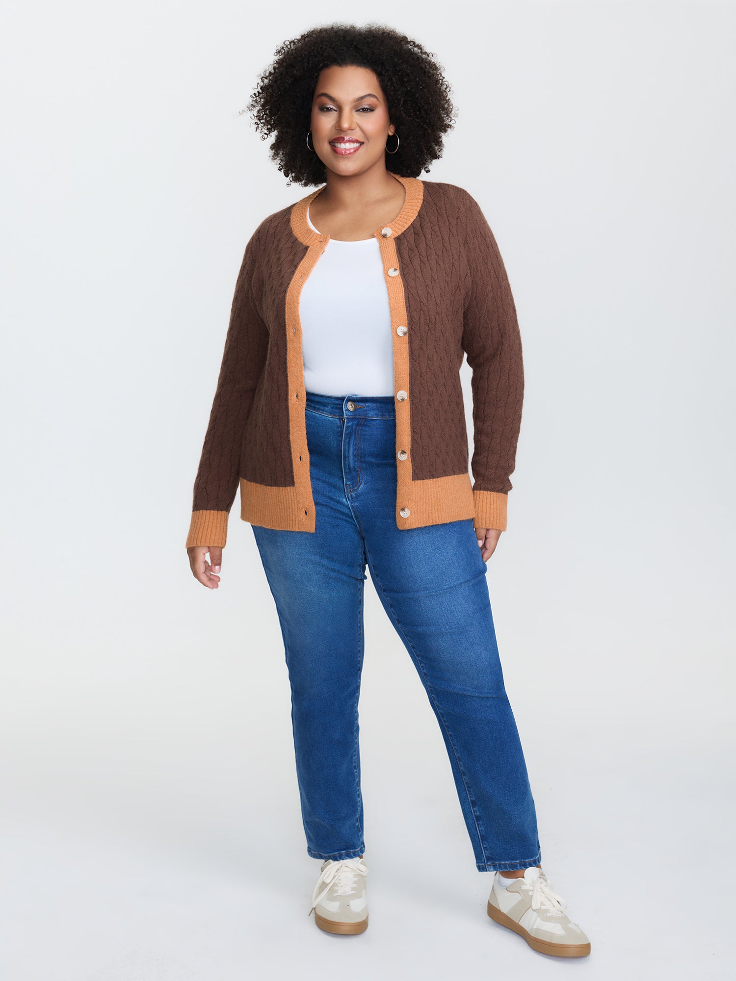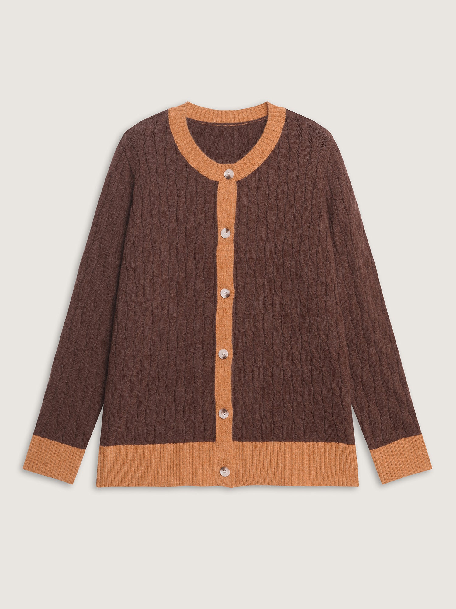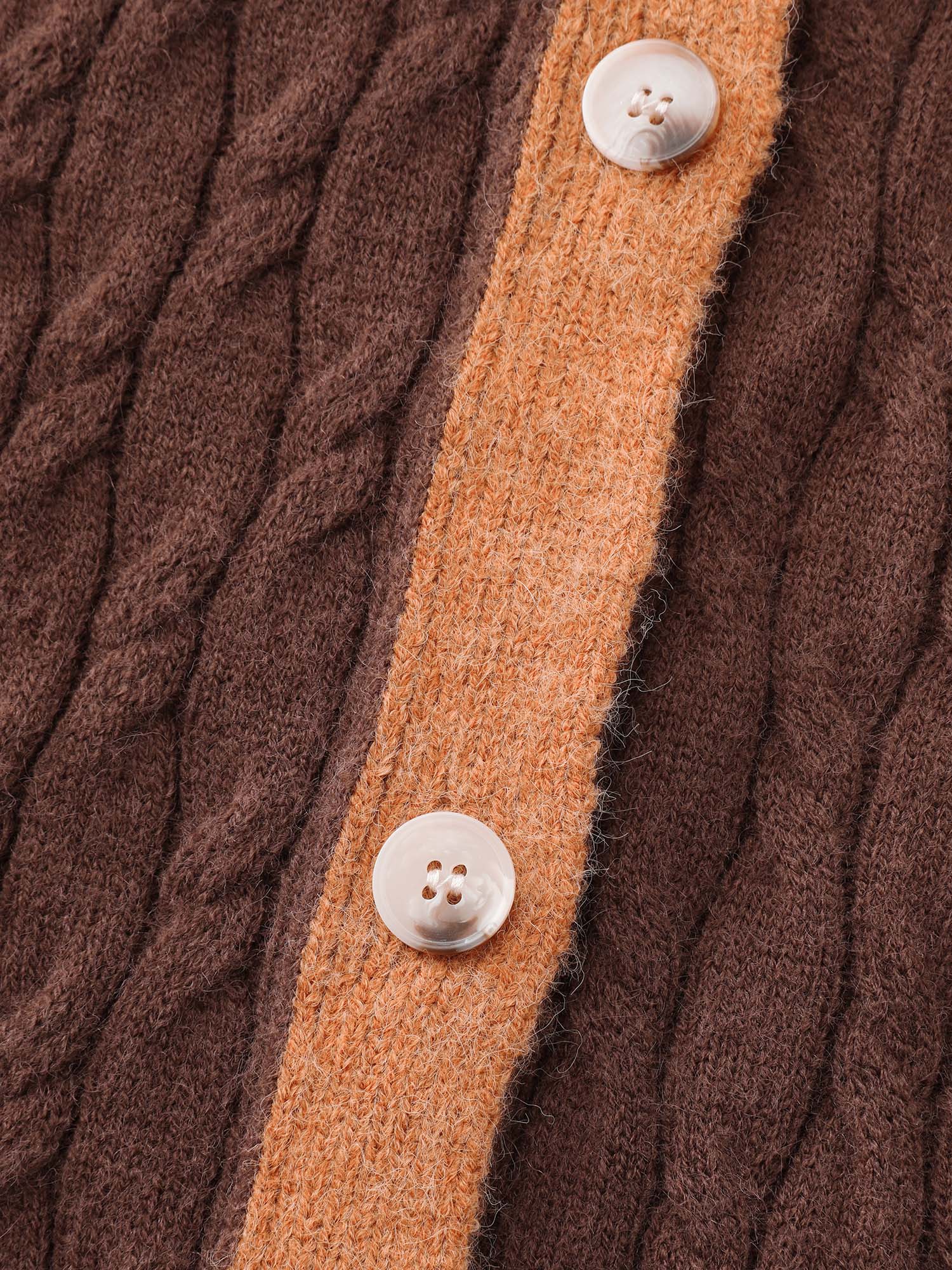Shop Braided Color Contrast Button Knit Cardigan now and redefine your style with confidence at BloomChic. Tailored for mid and plus-size women. This trendy Sweaters Cardigans Women, sizes 10-30. Color:Browncoffeecolor;Style:Leisure;Neckline:Round Neck;Sleeve Type:Regular Sleeve;Prints:Geometric & color block;Details:Contrast, Texture, Cable Knit;Pocket:No-pocket;Belt:No-belt;Closure Type:Button
