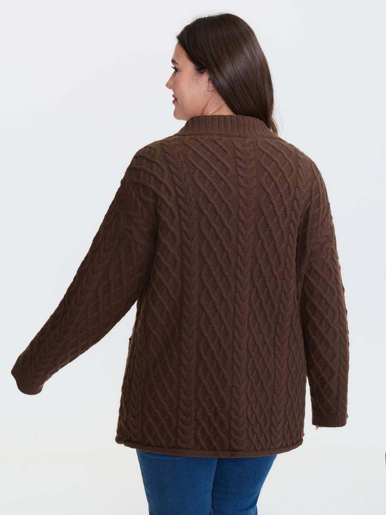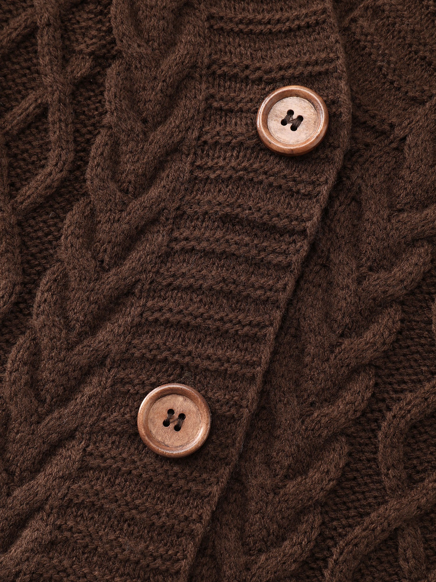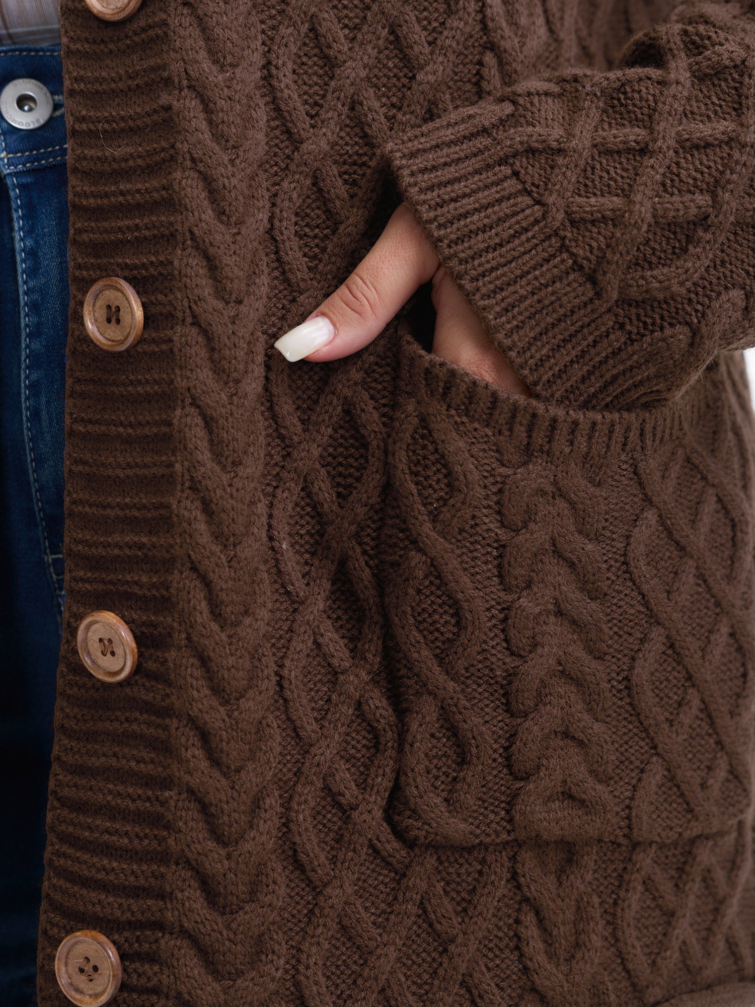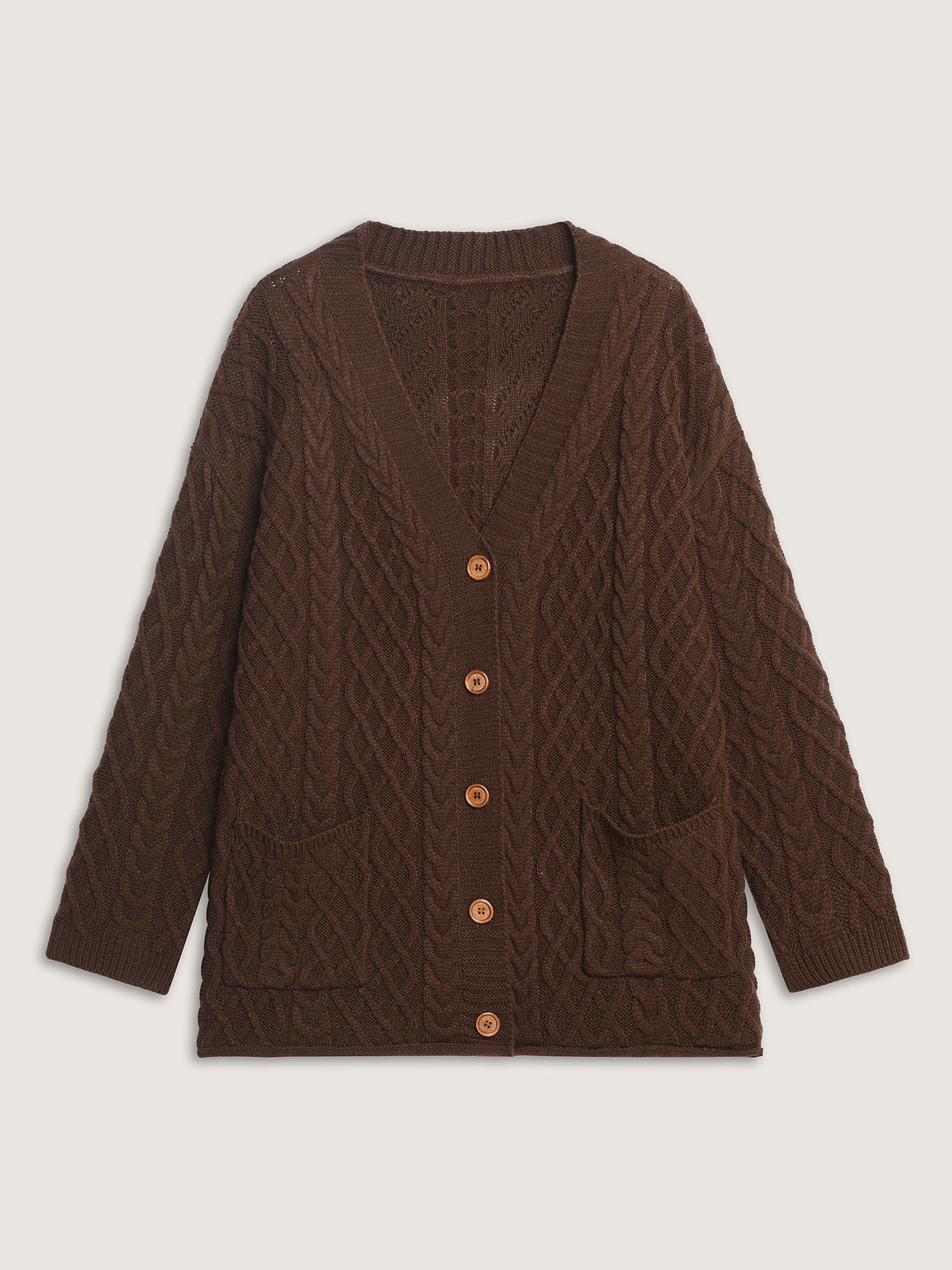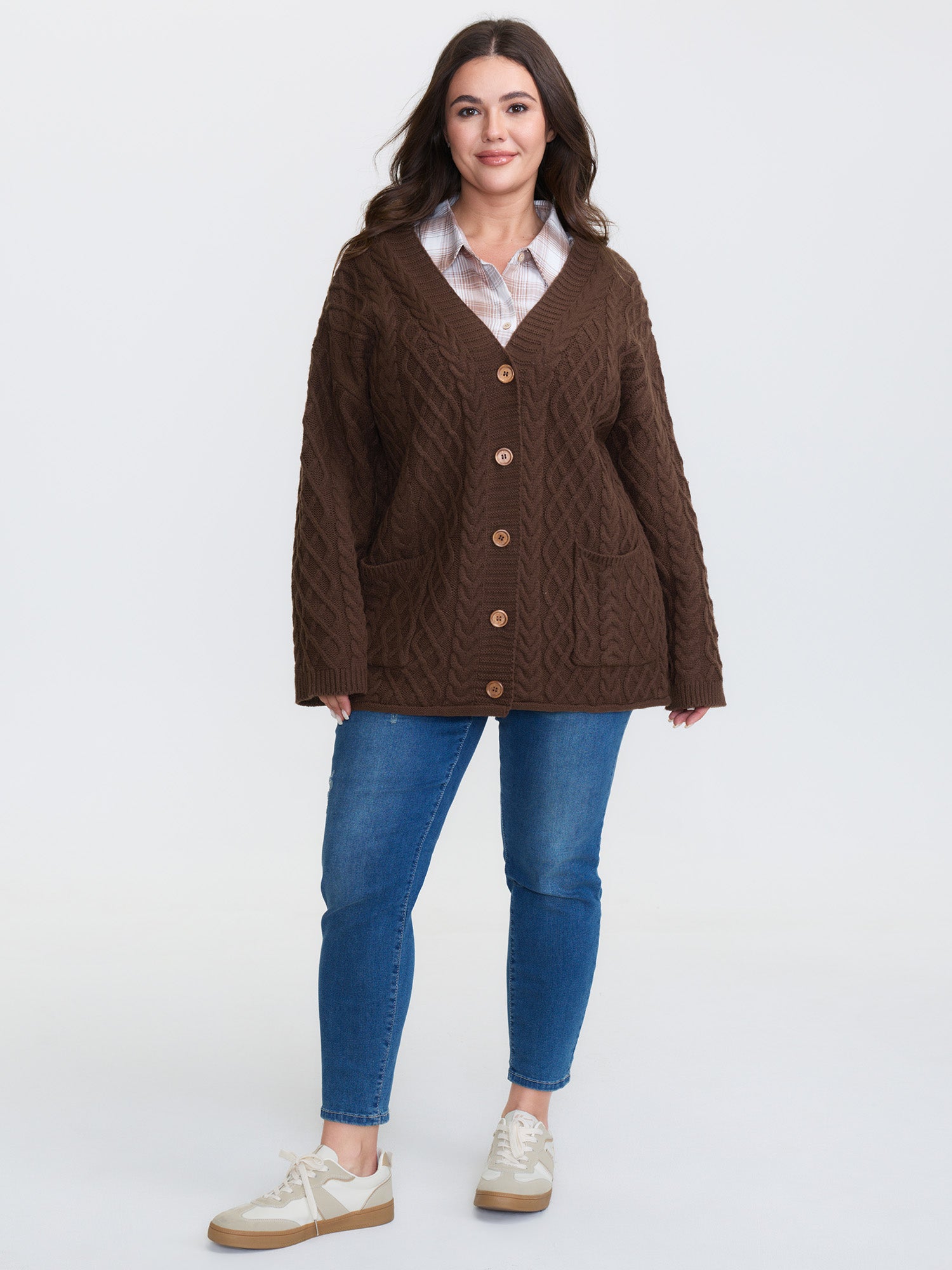 Shop Cableknit Textured Button Pocket Knit Cardigan now and redefine your style with confidence at BloomChic. Tailored for mid and plus-size women. This trendy Sweaters Cardigans Women, sizes 10-30. Color:Browncoffeecolor;Style:Leisure;Neckline:V-neck;Sleeve Type:Drop shoulder sleeve;Prints:Non;Details:Cable Knit, Texture;Pocket:Patch pocket;Belt:No-belt;Closure Type:Button