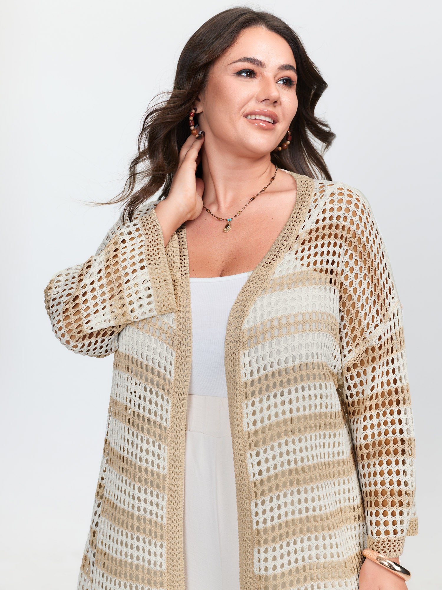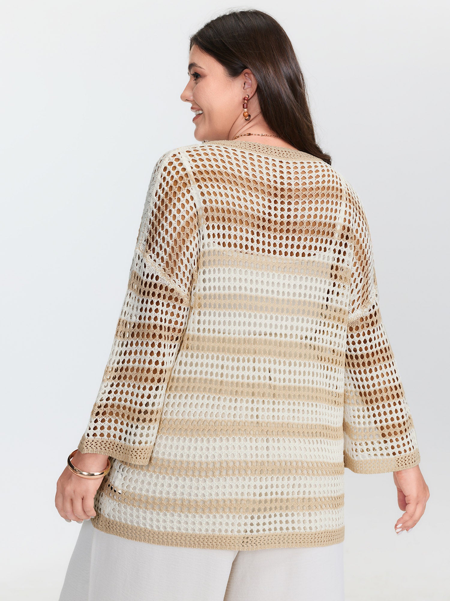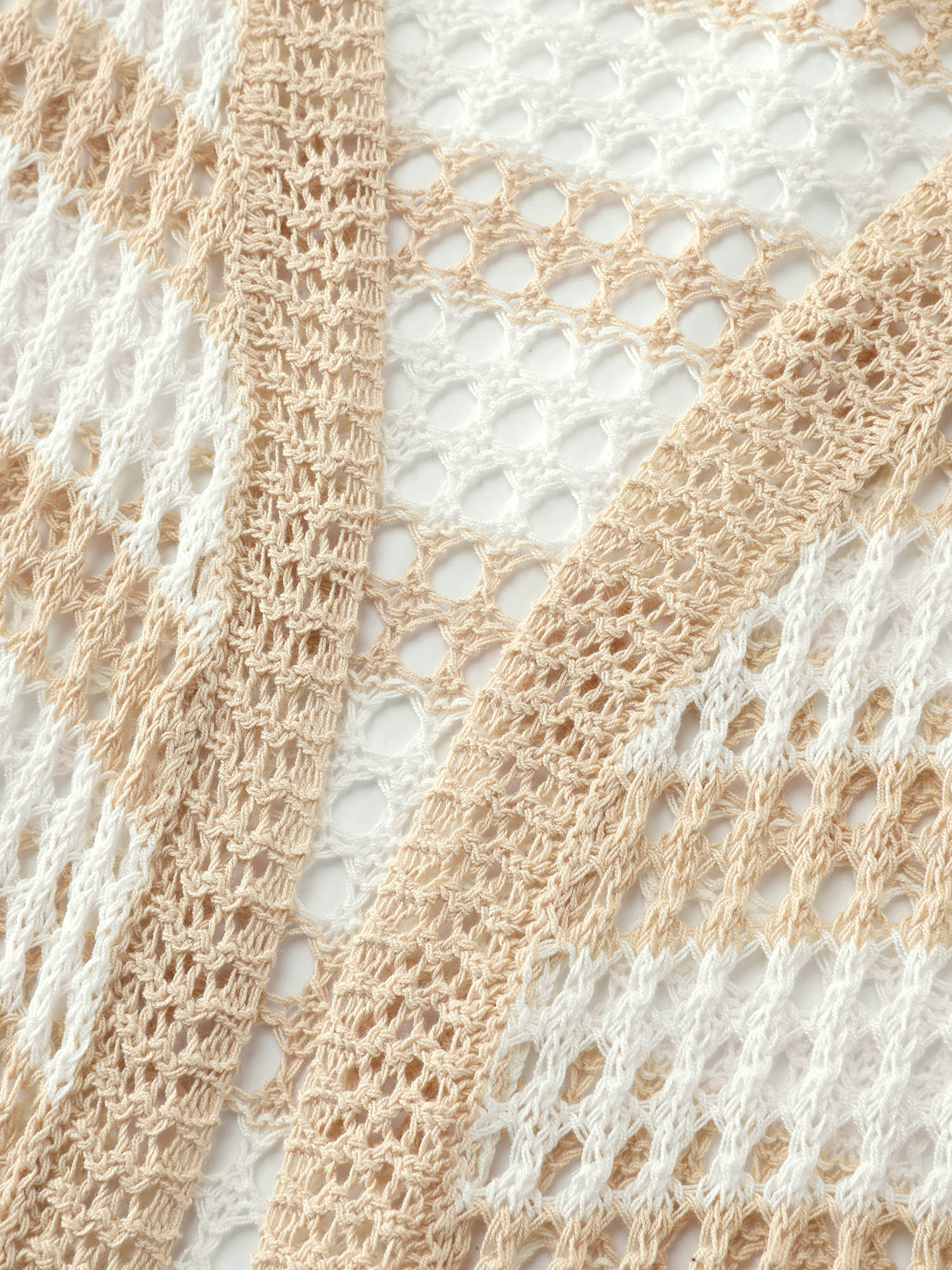 Shop Crochet V-Neck Striped Knit Cardigan now and redefine your style with confidence at BloomChic. Tailored for mid and plus-size women. This trendy Sweaters Cardigans Women, sizes 10-30. Color:Apricot;Style:Leisure;Neckline:Kimono collar;Sleeve Type:Drop shoulder sleeve;Prints:Stripes;Details:Cut-Out;Pocket:No-pocket;Belt:No-belt;Closure Type:Open front without closure