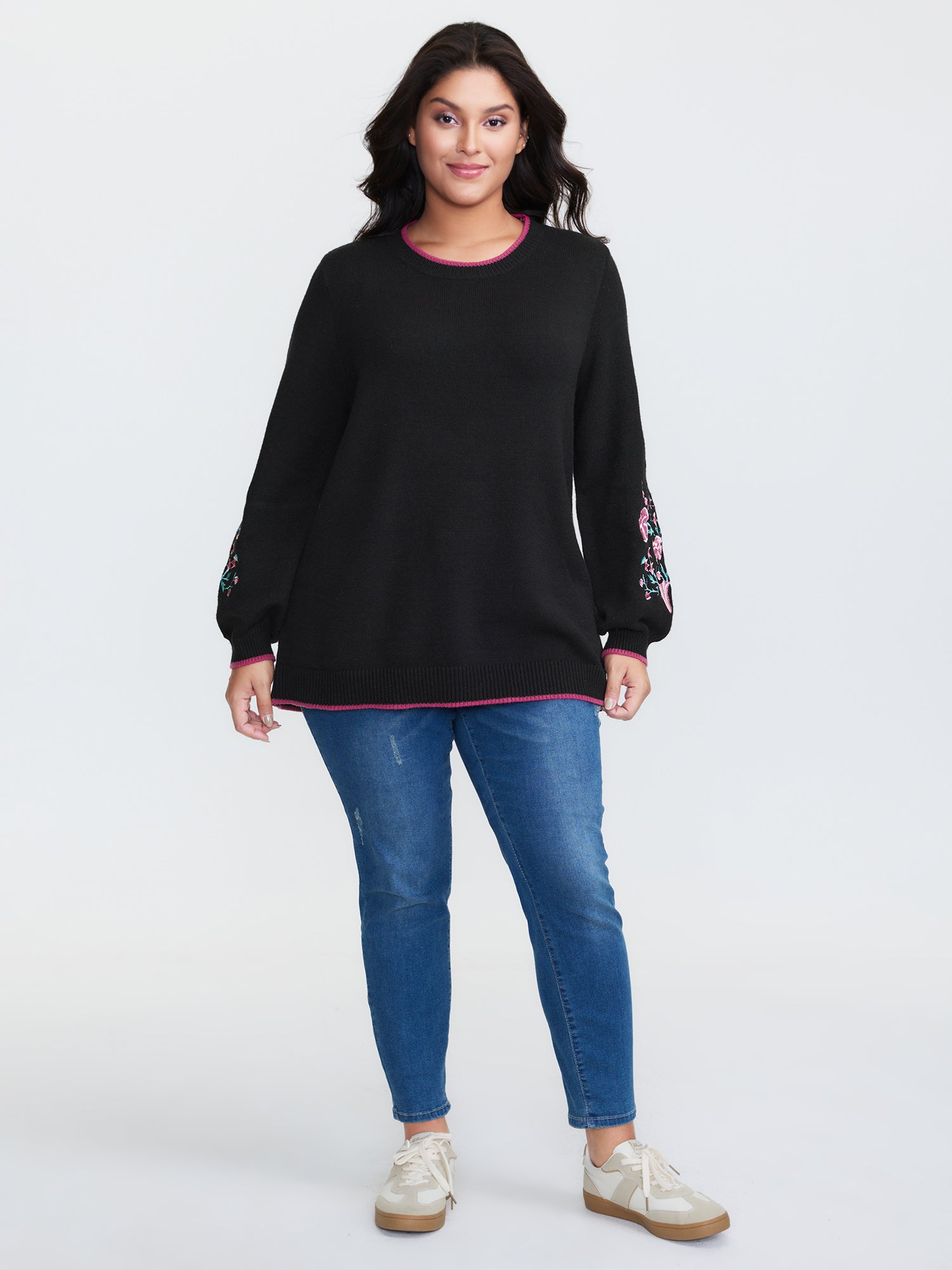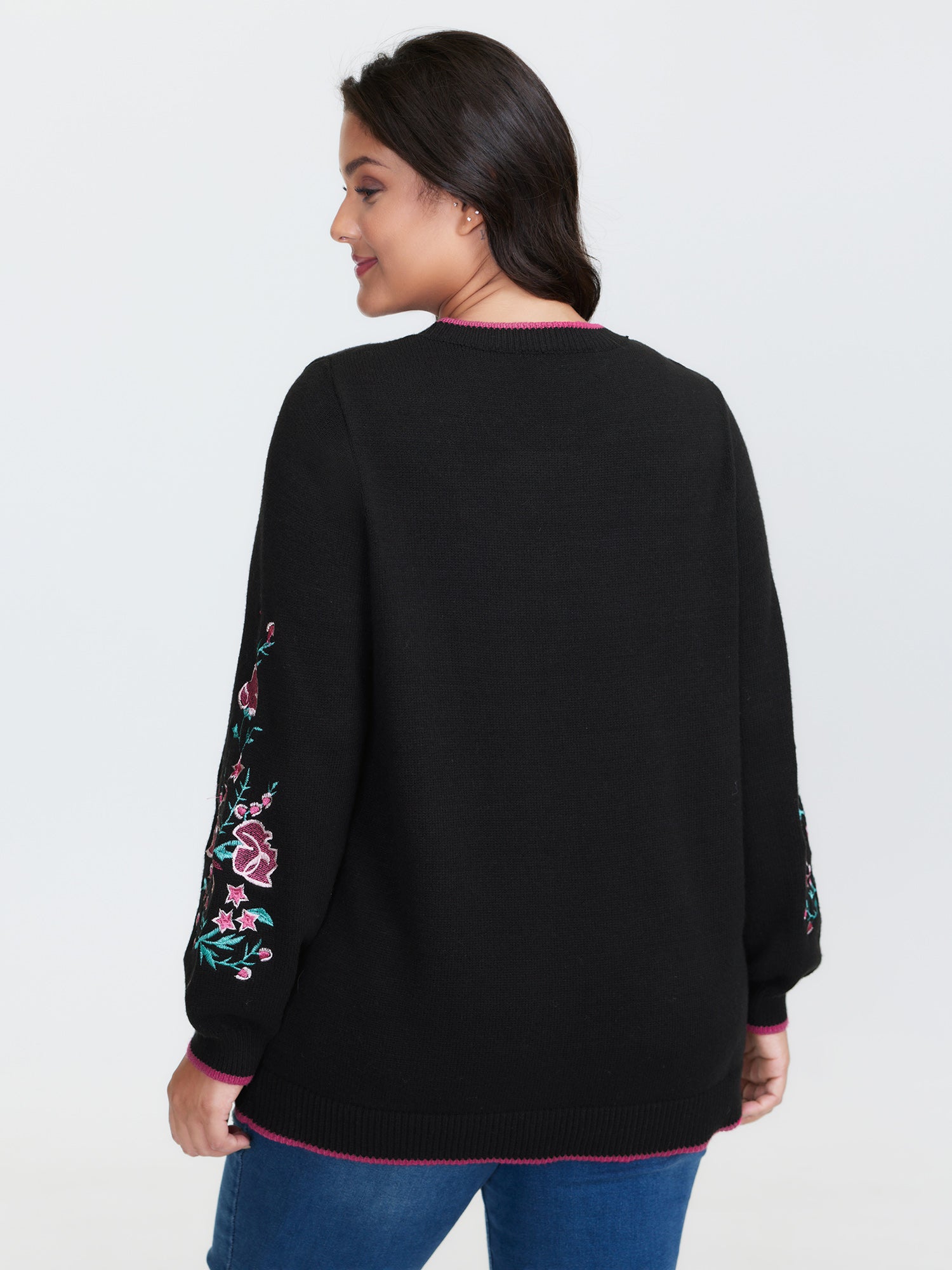 Shop Embroidered Sleeve Contrast Trim Pullover now and redefine your style with confidence at BloomChic. Tailored for mid and plus-size women. This trendy Sweaters Cardigans Women, sizes 10-30. Color:Black;Style:Leisure;Neckline:Round Neck;Sleeve Type:Regular Sleeve;Pattern Type:Natural Flowers;Prints:Floral;Details:Contrast, Embroidered;Pocket:No-pocket;Belt:No-belt;Closure Type:Non