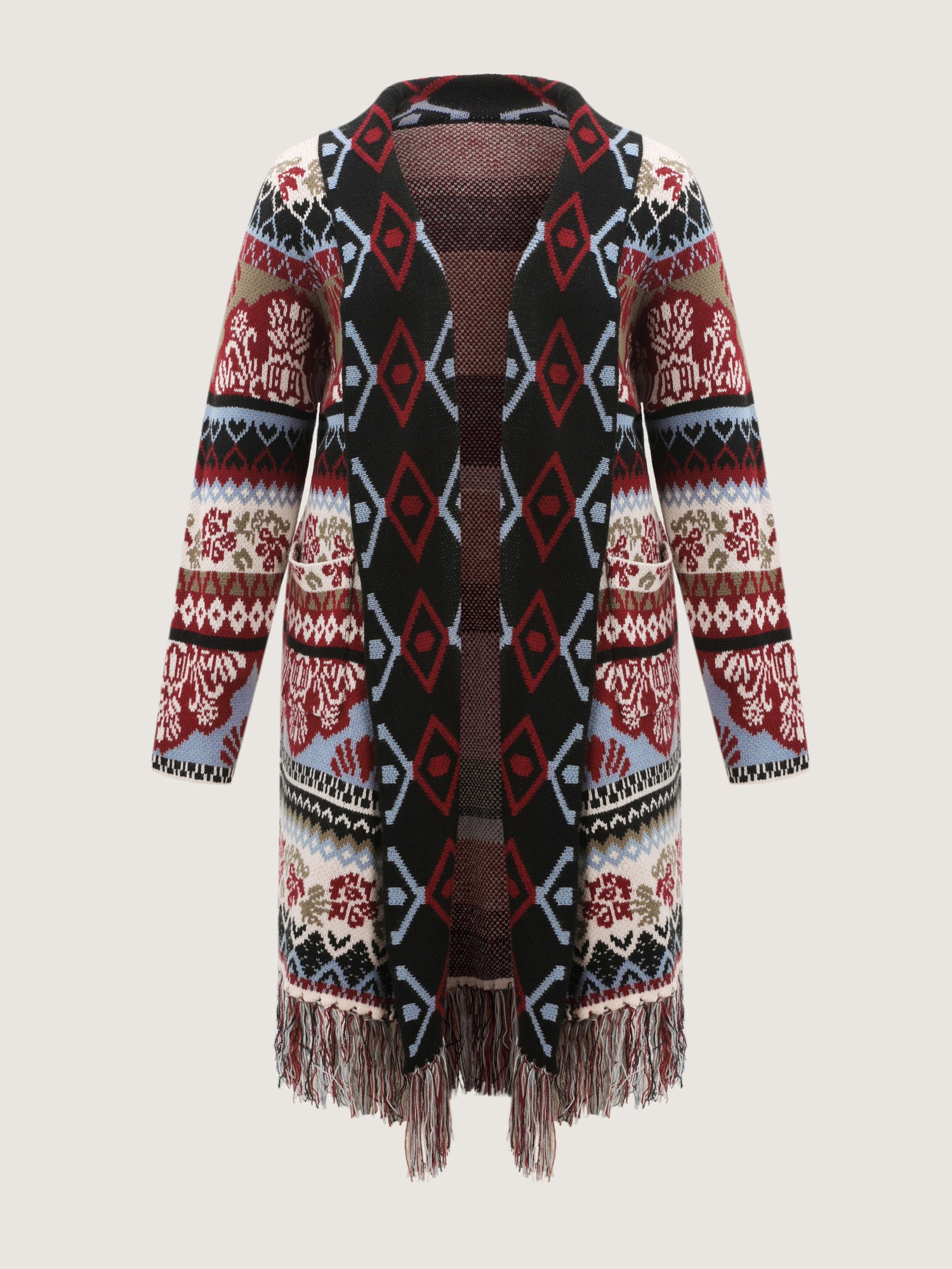 Shop Fair-Isle Pattern Jacquard Fringes Knit Cardigan now and redefine your style with confidence at BloomChic. Tailored for mid and plus-size women. This trendy Sweaters Cardigans Women, sizes 10-30. Color:Beige;Style:Resort;Neckline:Kimono collar;Sleeve Type:Regular Sleeve;Prints:Bohemian print;Details:Tassels;Pocket:Patch pocket;Belt:No-belt;Closure Type:Open front without closure